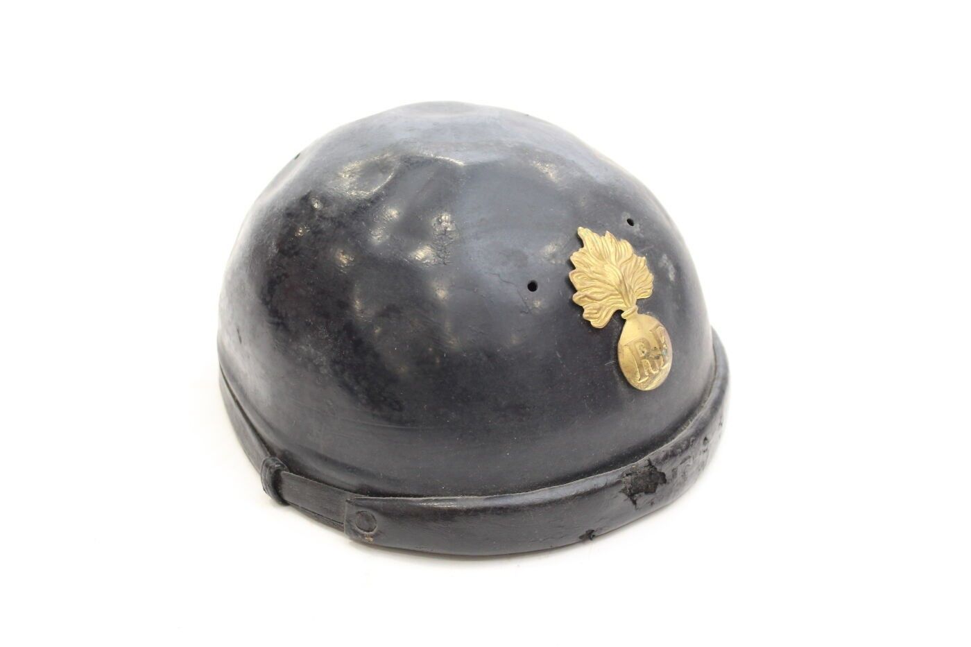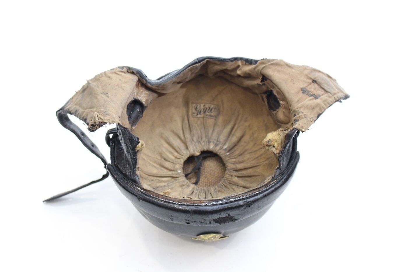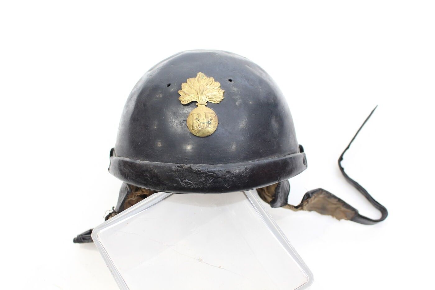 Mobile Republican Guard motorcyclist helmet painted midnight blue, front badge with gilded brass grenade, inner cap with leather flaps. ABE