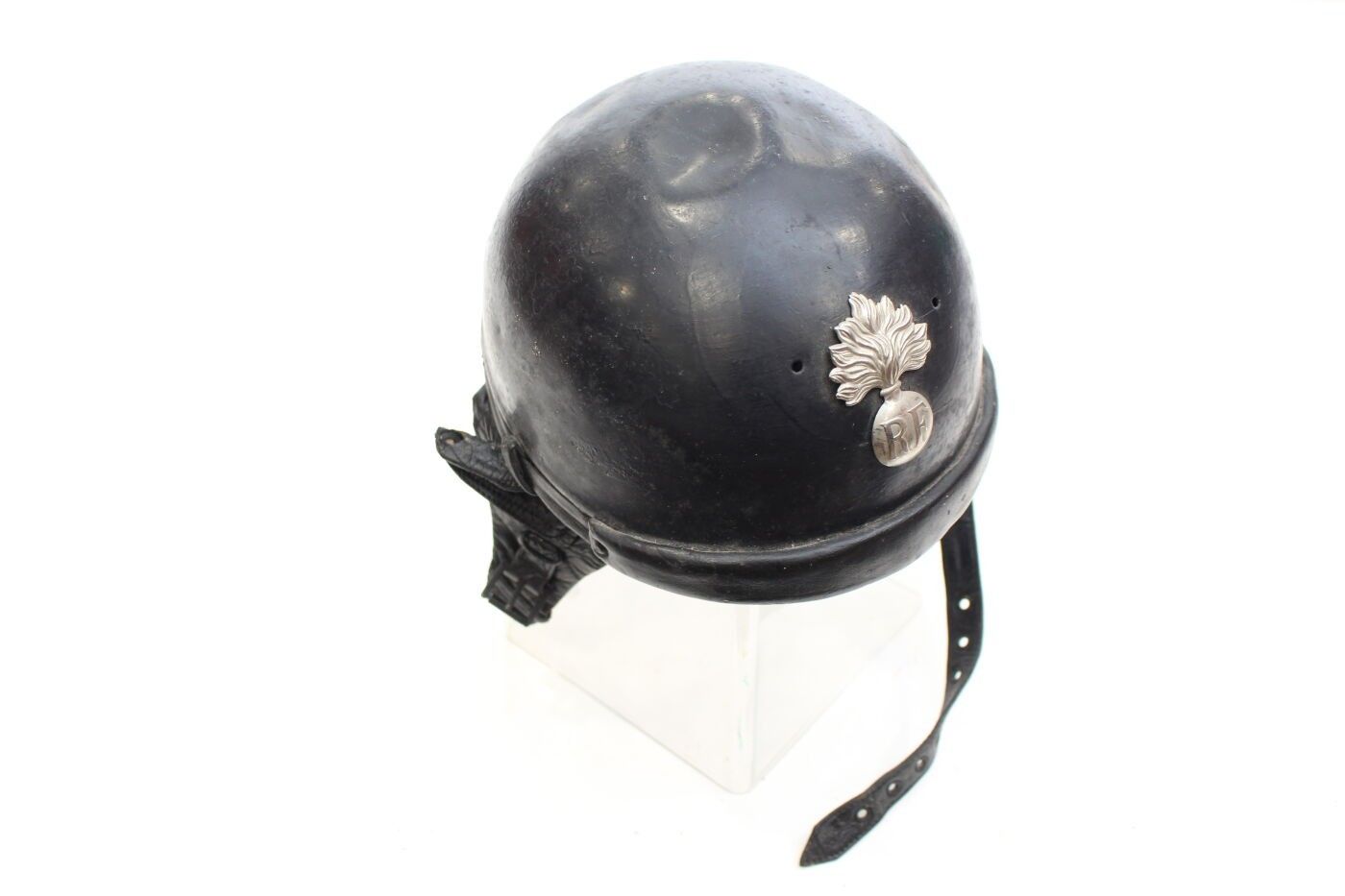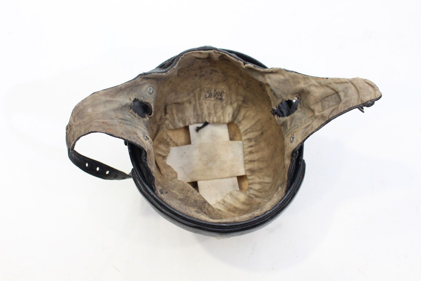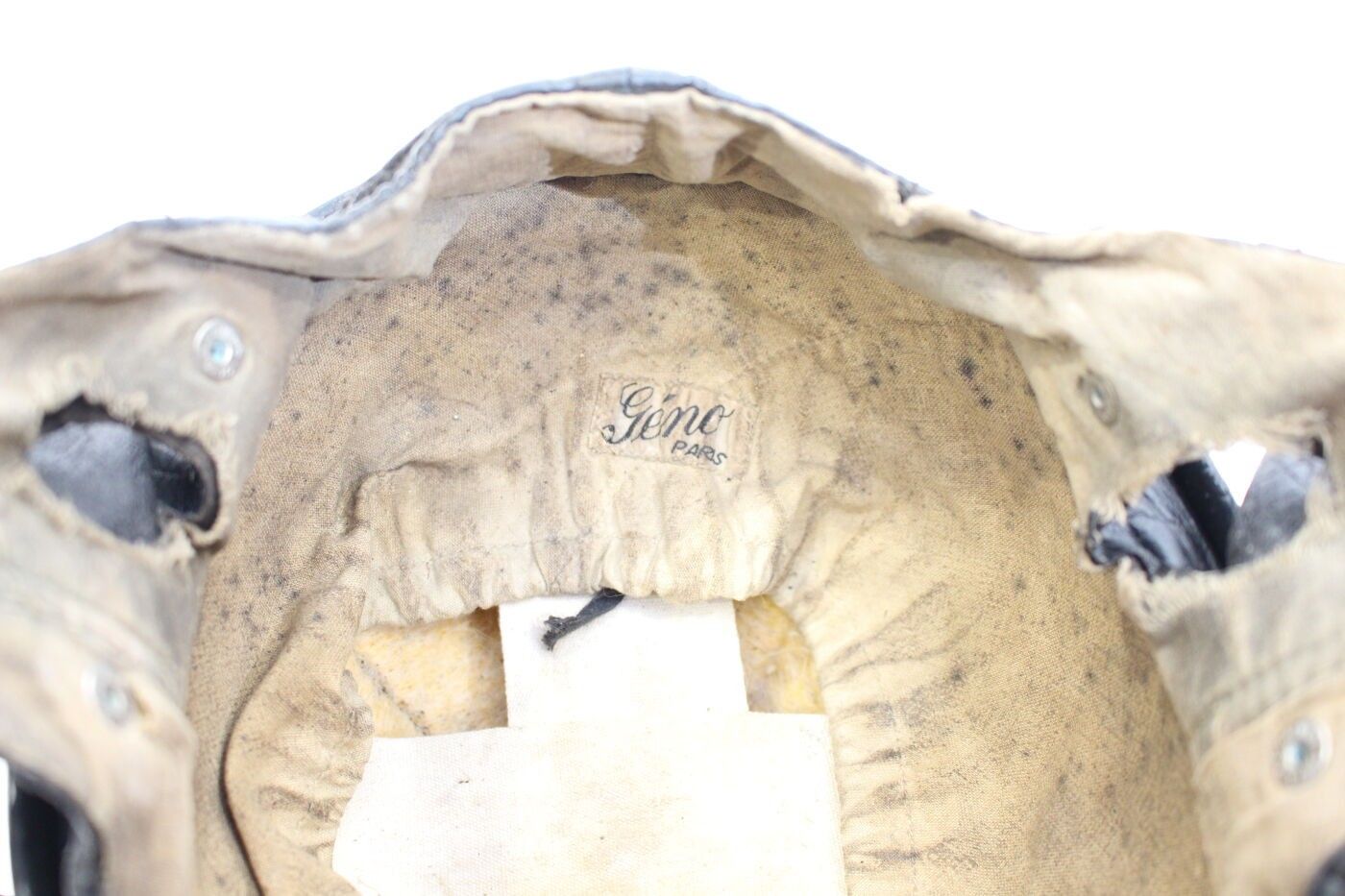 Gendarmerie motorcyclist helmet painted midnight blue, silver plated grenade front badge, black leather inner brim, manufacturer's label GENO, Paris. Dents. ABE