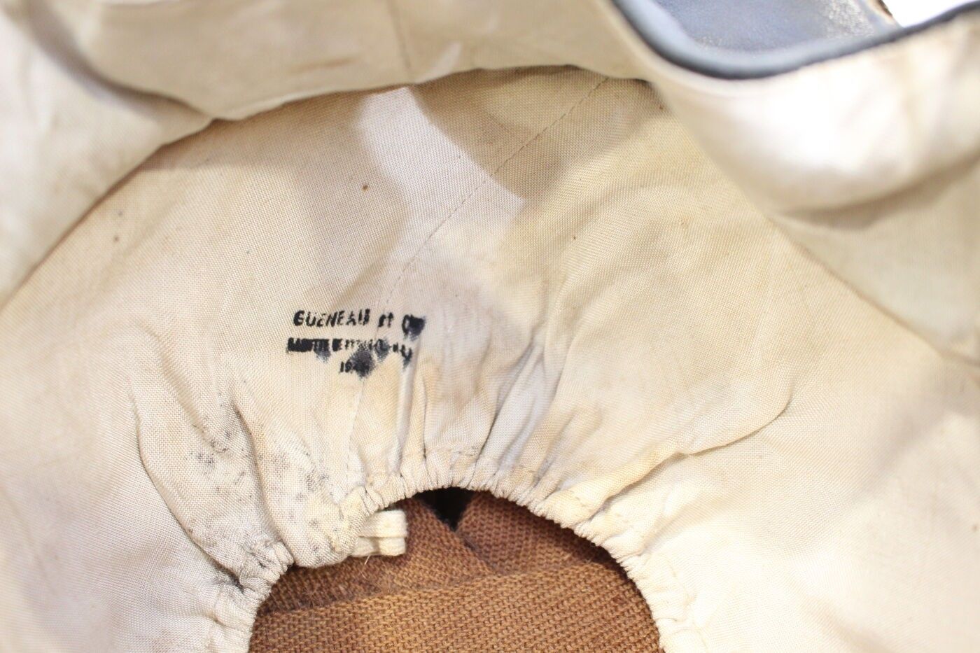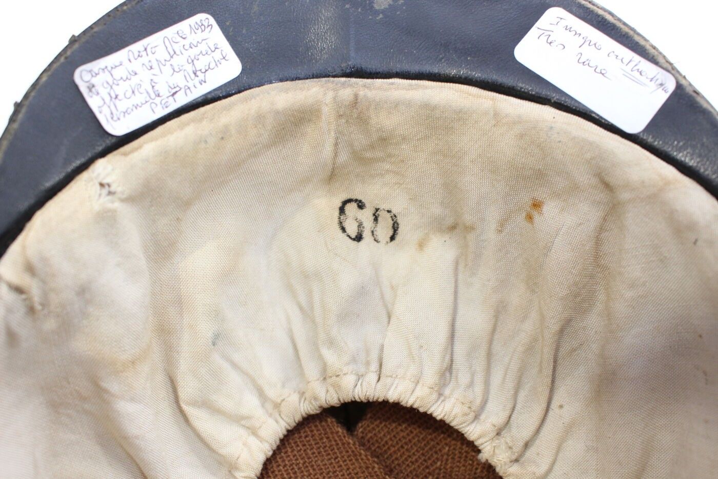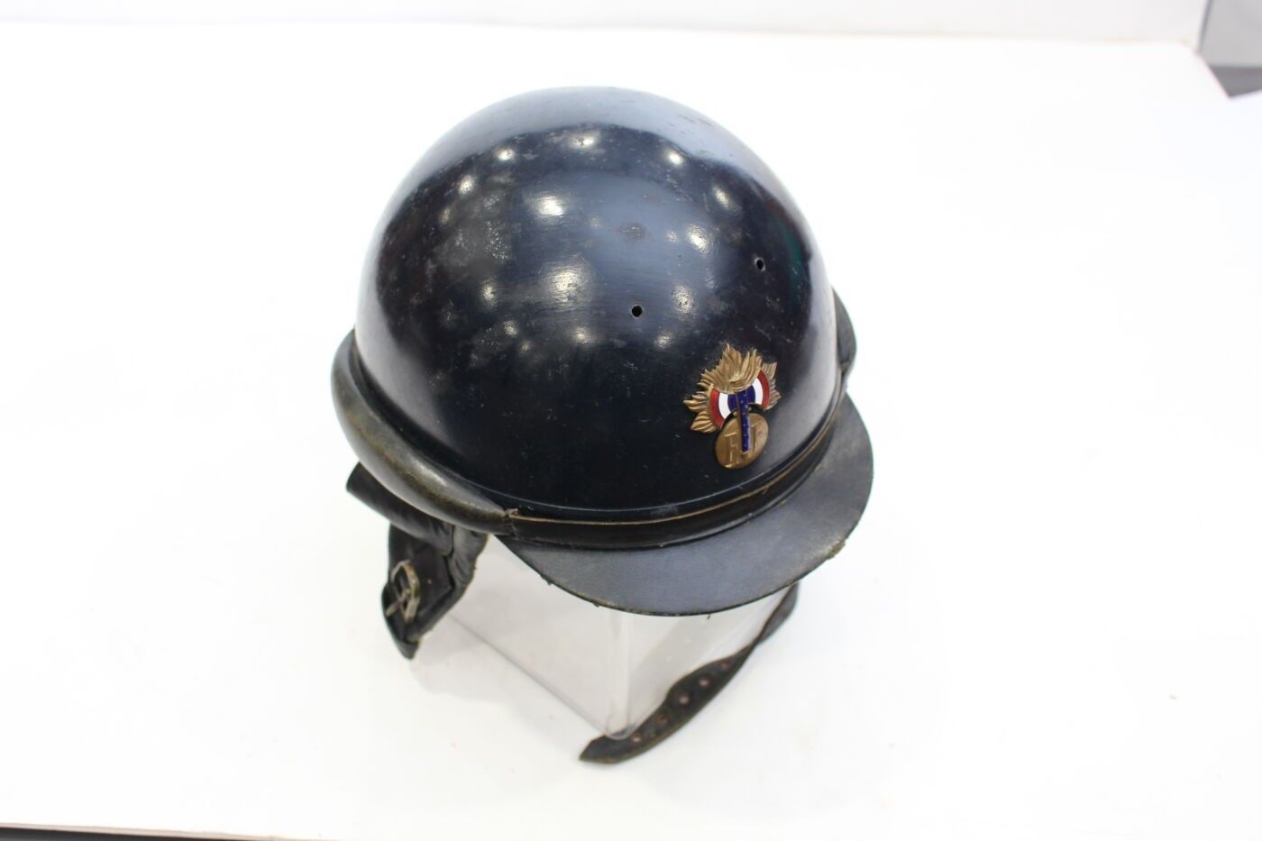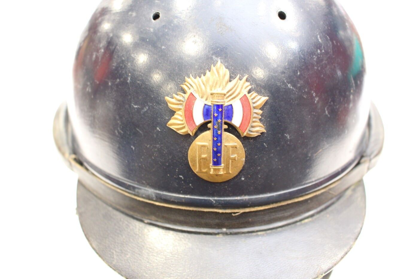 Maréchal Pétain's Personal Guard model 33/41 aluminium helmet painted midnight blue, gendarmerie gold grenade front badge stamped with the enamelled tricolour francisque and the letters "E.F" for Etat Français, black leather bavolets inner cap lined with white cotton marked GUENEAU & cie. ABE. Badge refrappé, tabs unmarked.