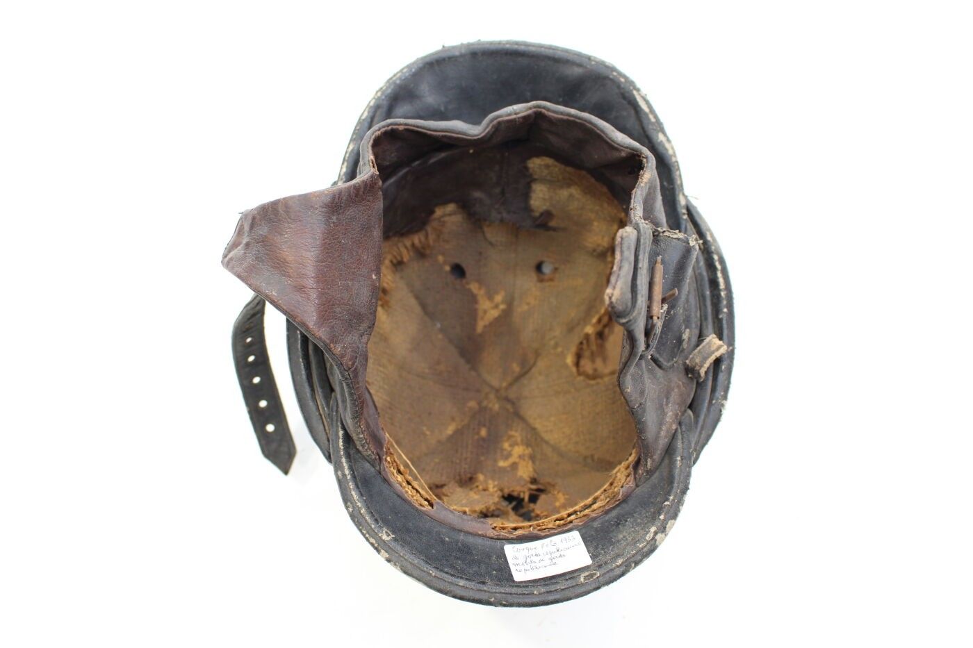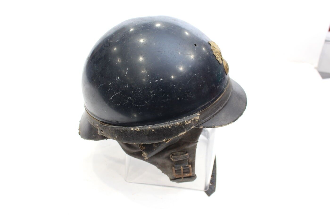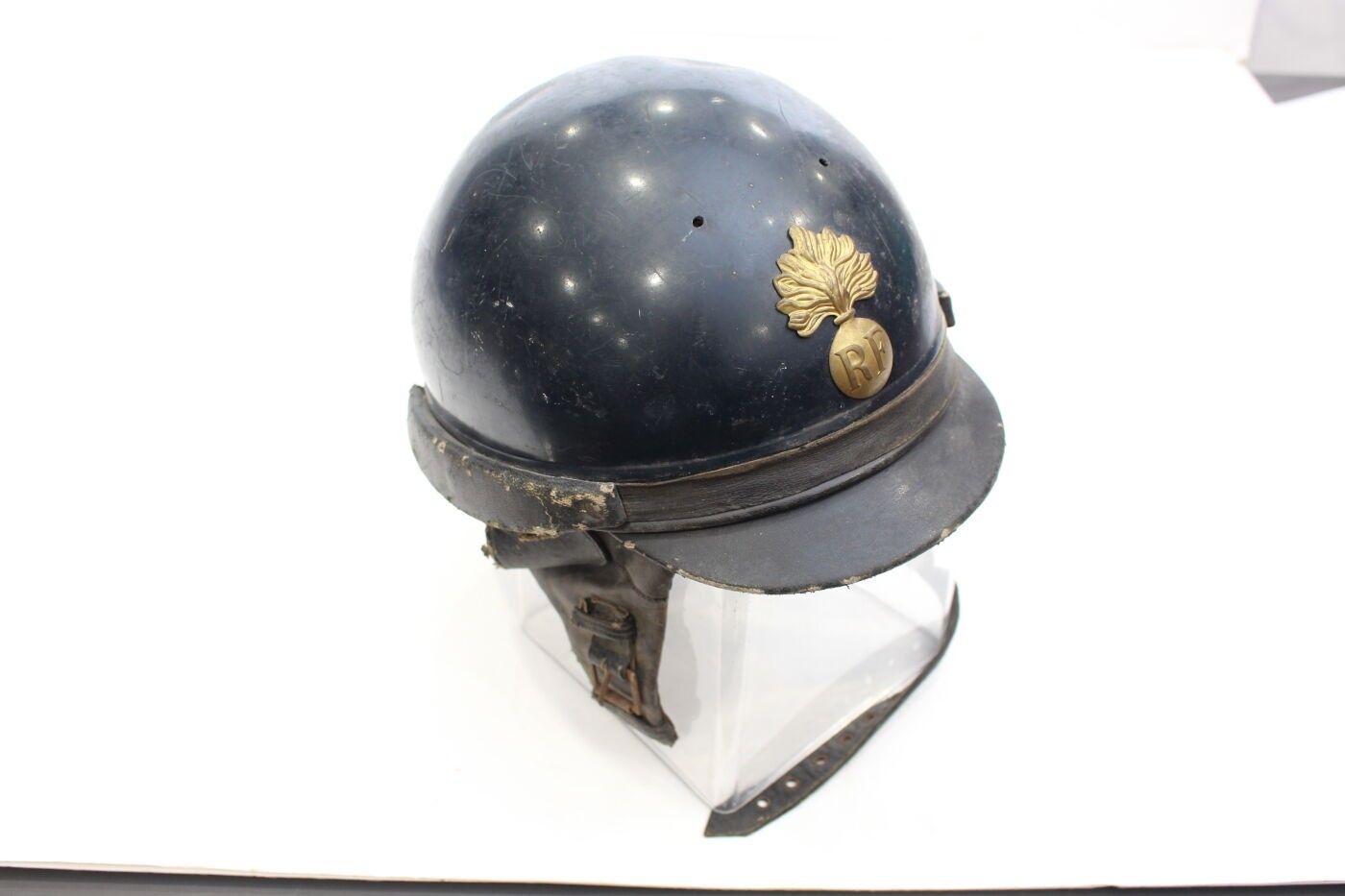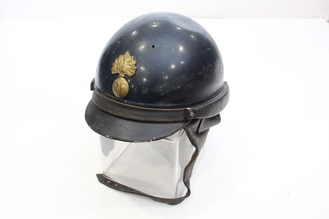 Model 33/41 republican guard mobile helmet in aluminium painted midnight blue, front badge with gilded brass grenade, inner cap with black leather flaps. ABE