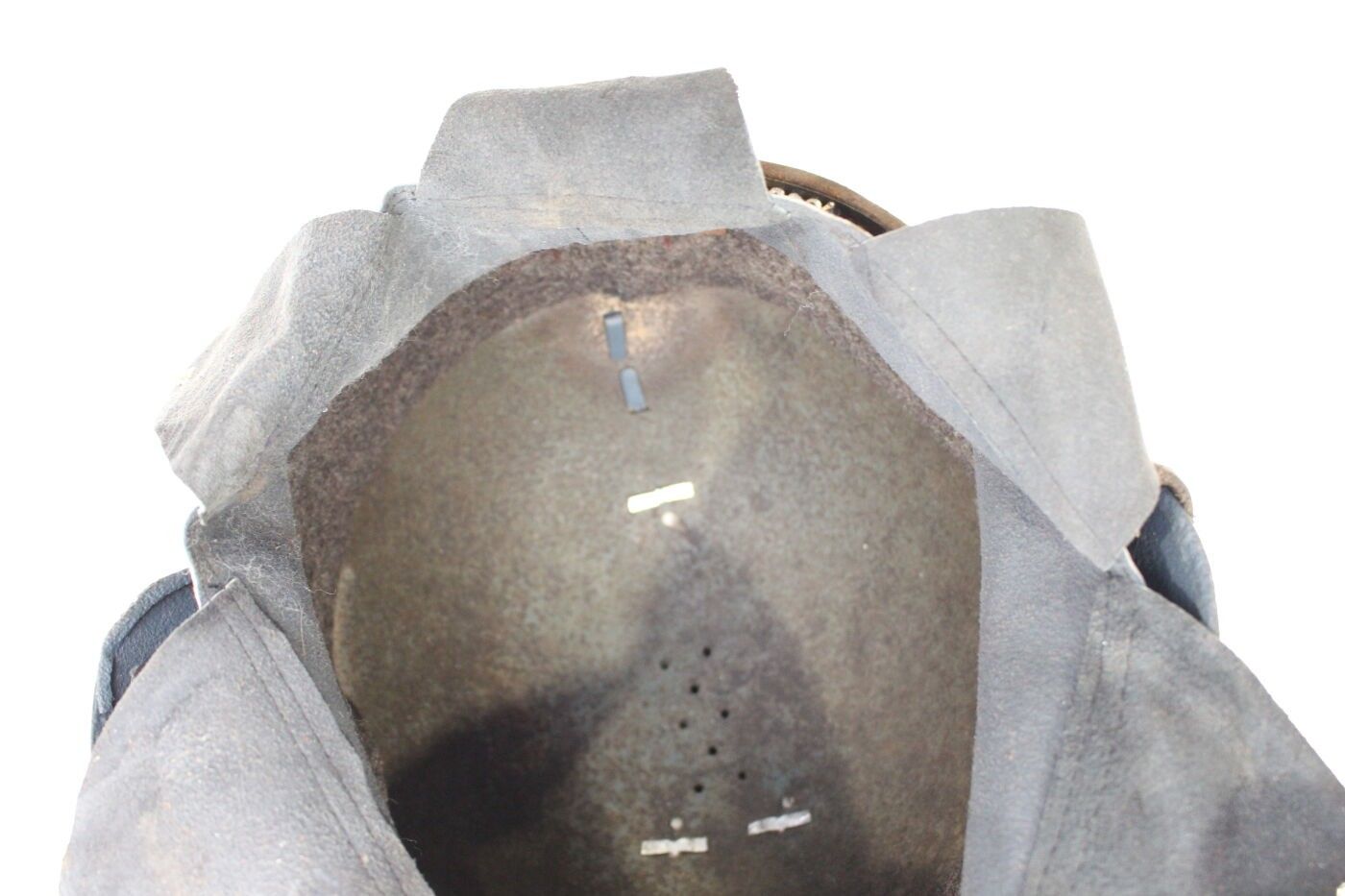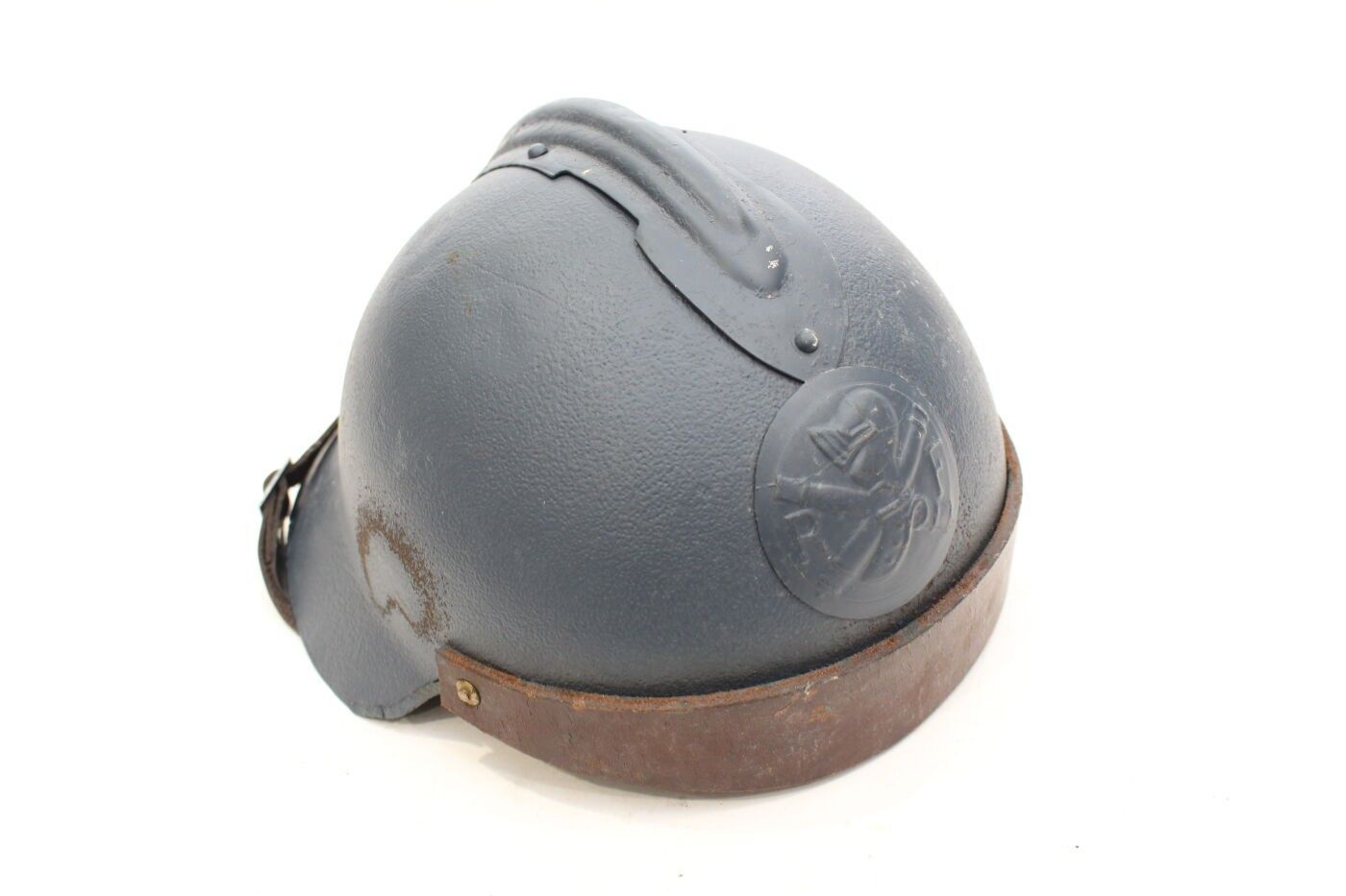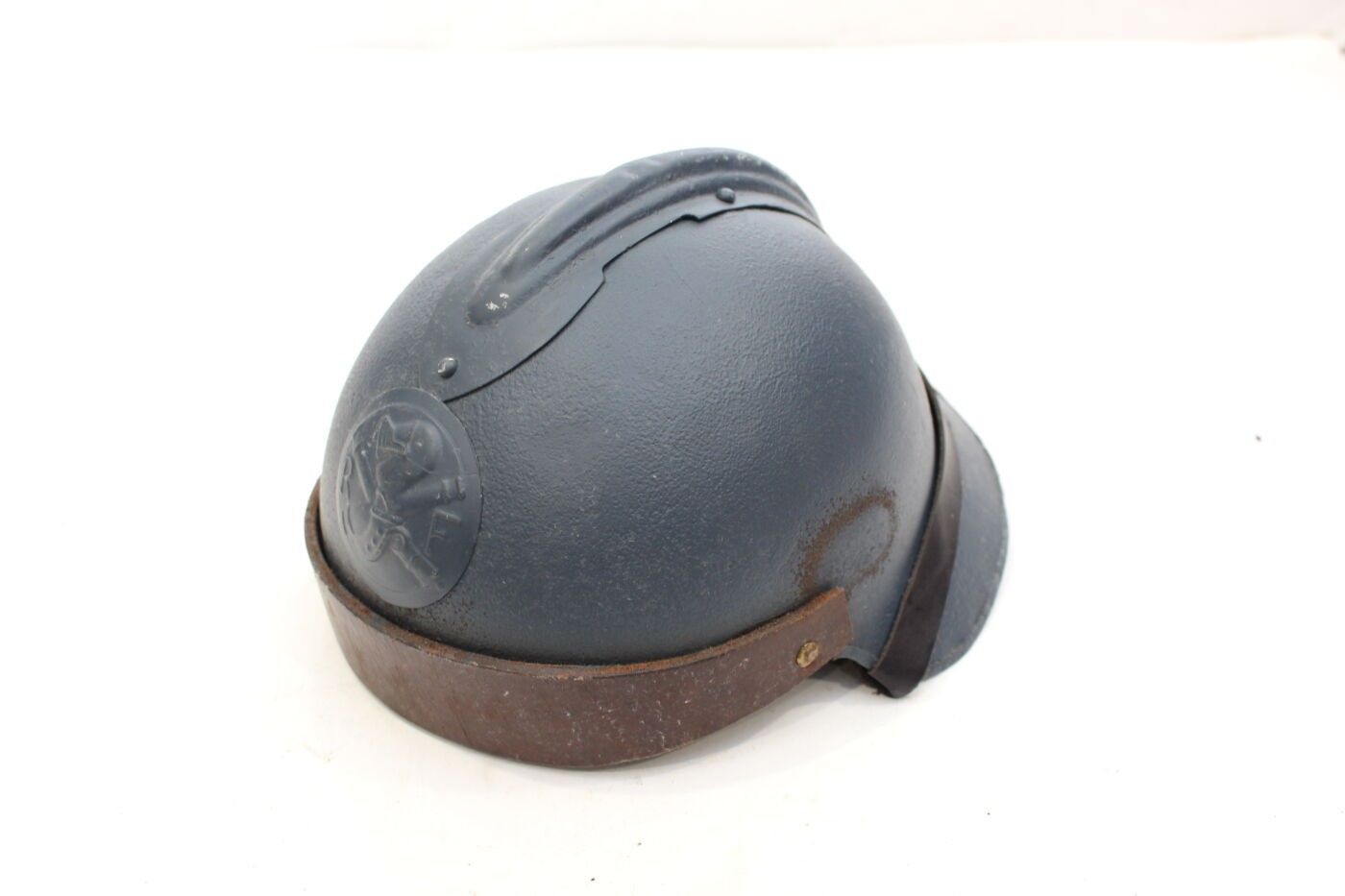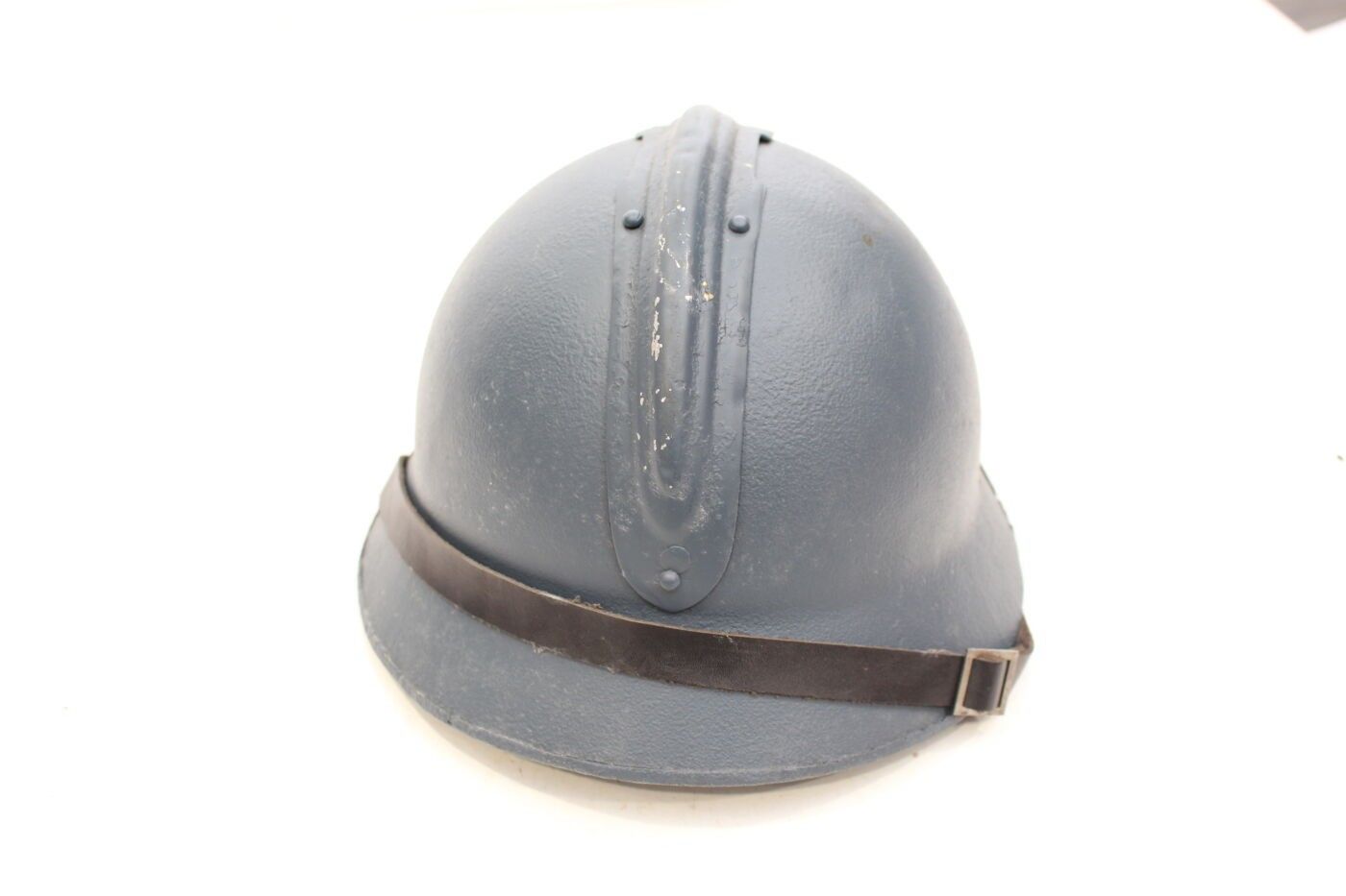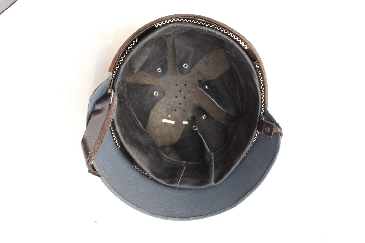Model 1926/27 steel tank helmet painted horizon blue (repainted), aluminium crest, model 1919 front badge, model 1926 black leather inner cap with chinstrap. Orange peel metal, cap restored. ABE