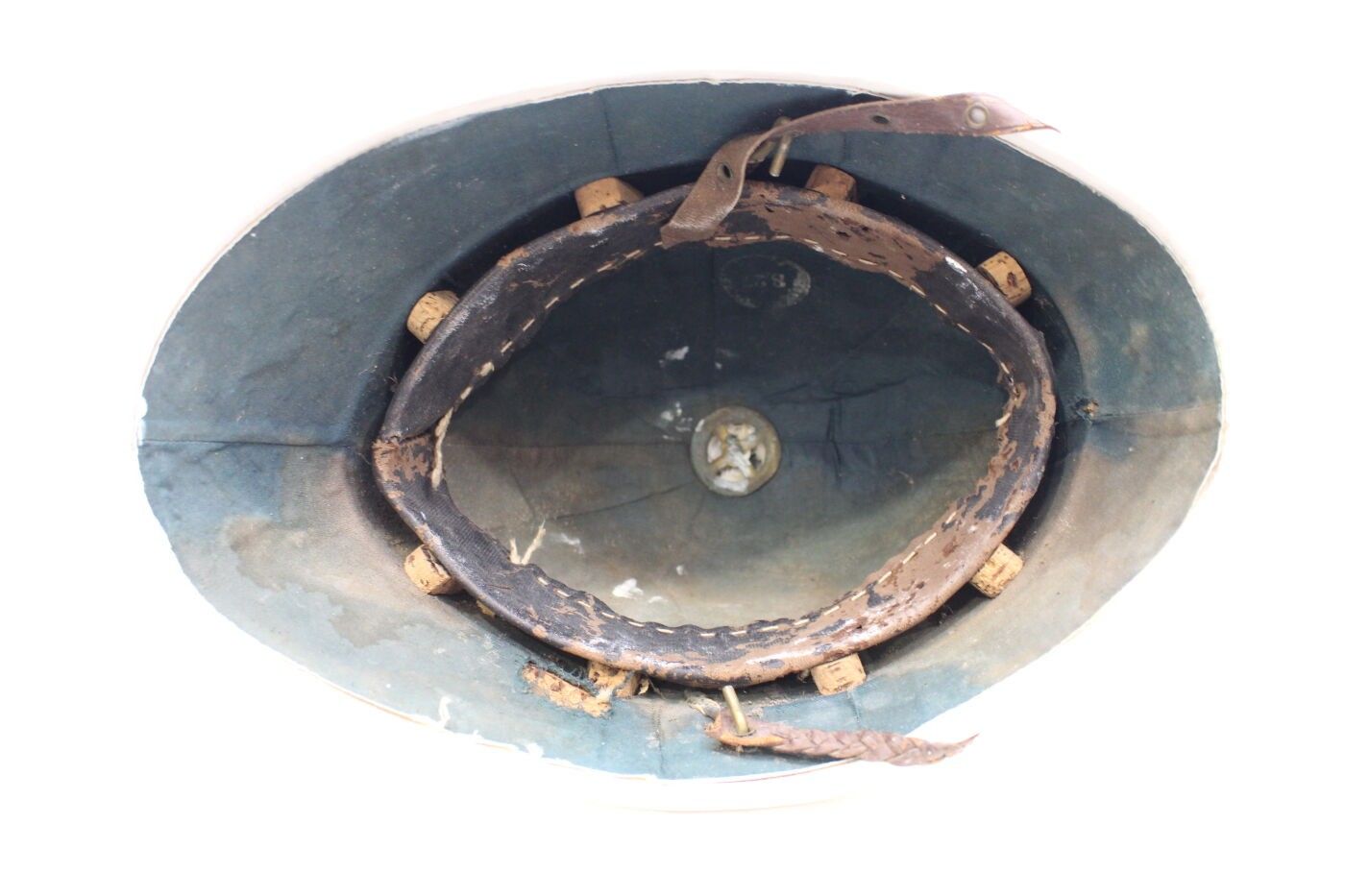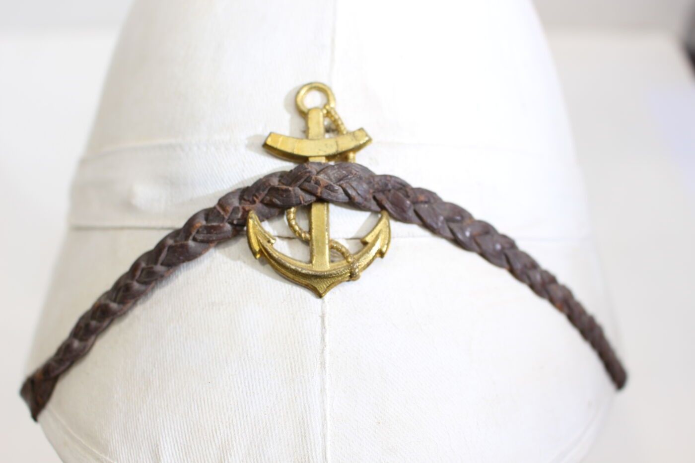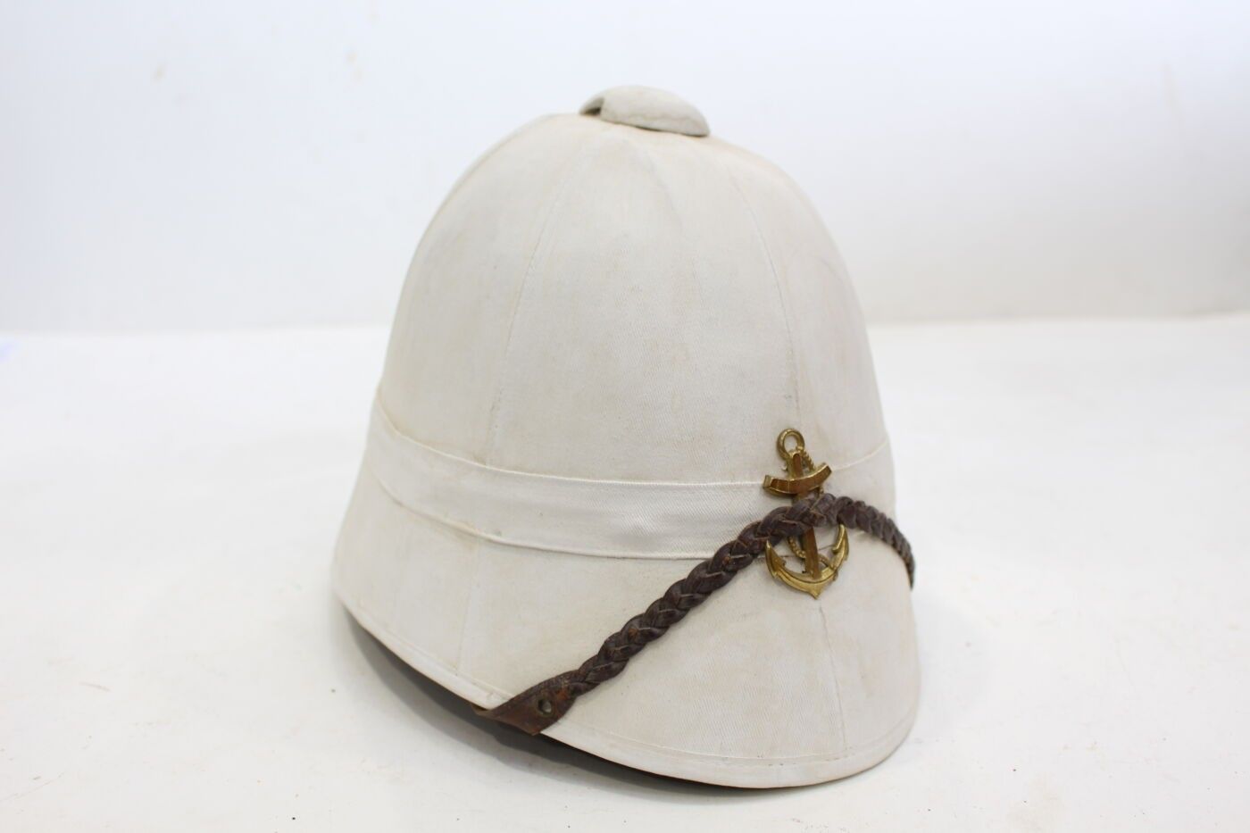 Colonial infantry model 1886 cork helmet covered with bleached canvas, leather headband, fancy braided leather chinstrap, gilt brass front anchor, approved in 1927. Worn leather headband. ABE