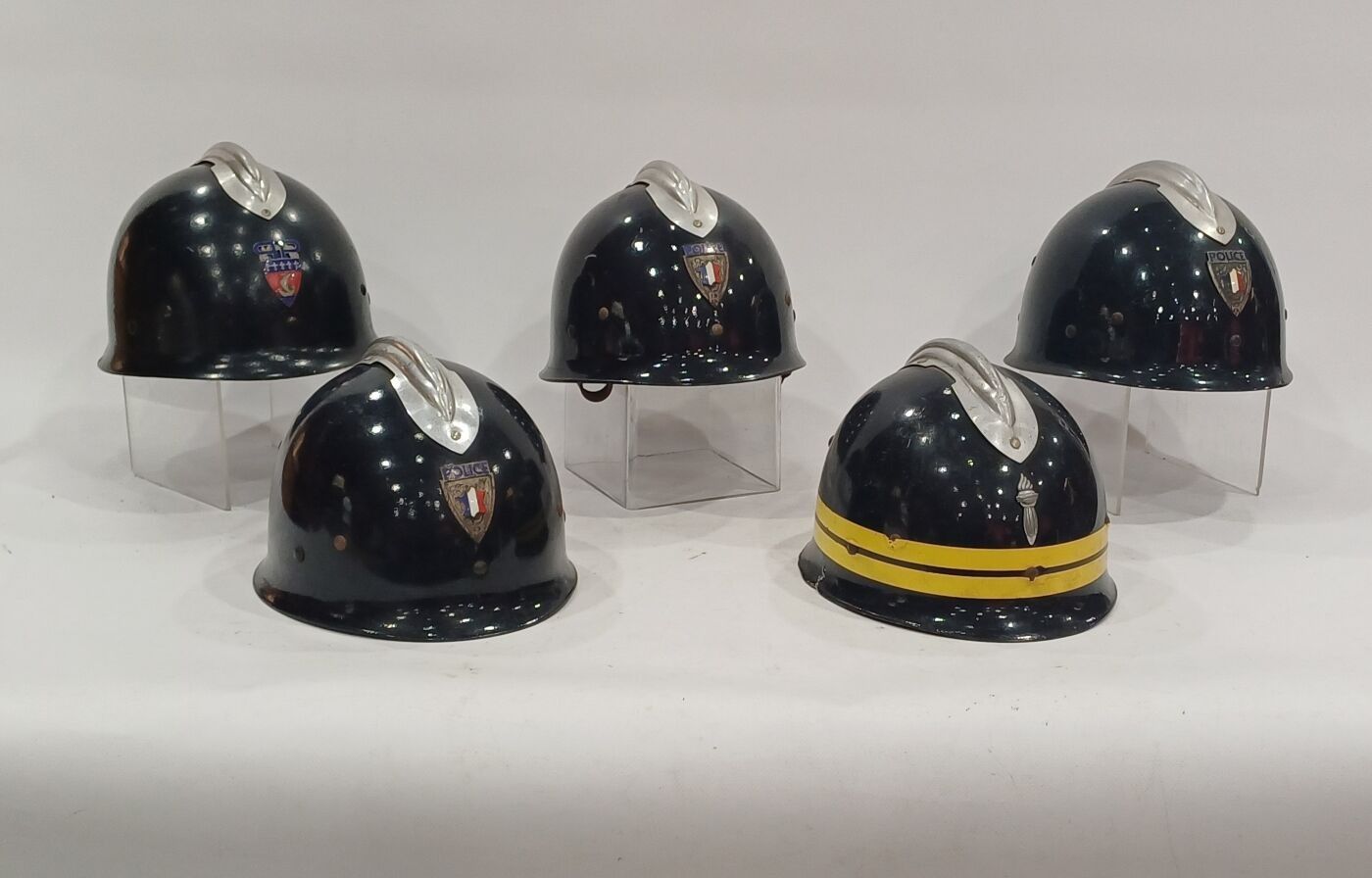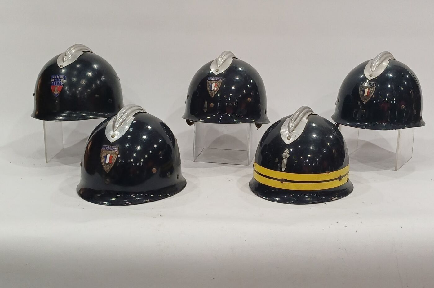 Set of 5 French law enforcement helmets, national police, CRS and Paris police. ABE.