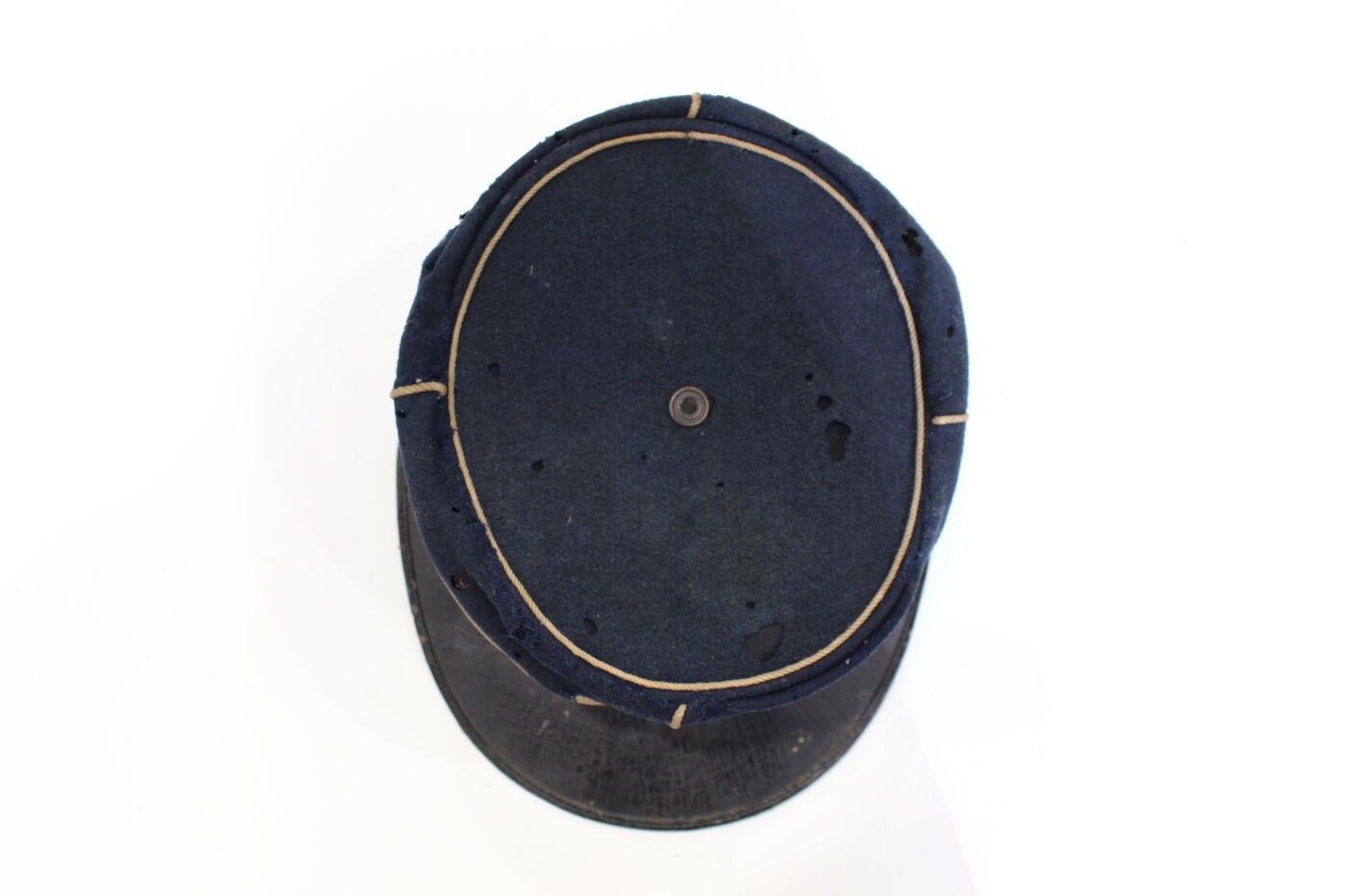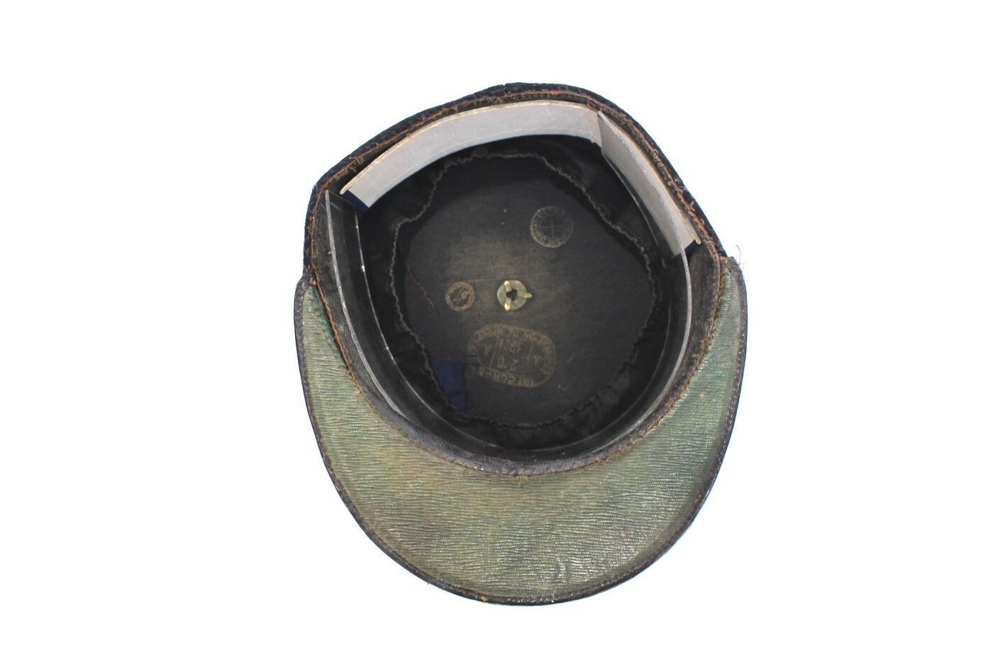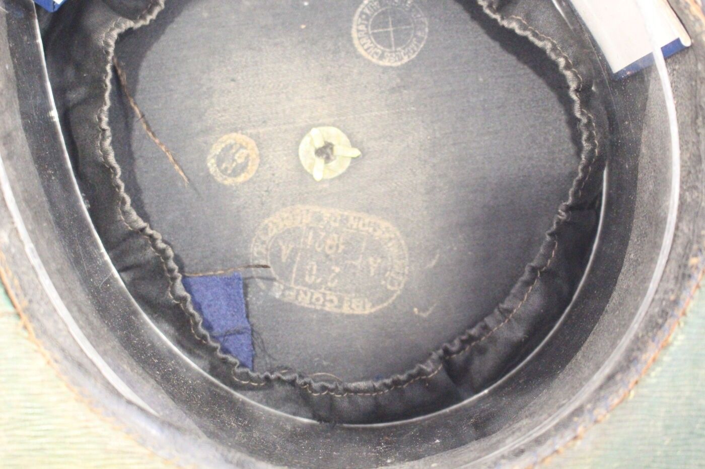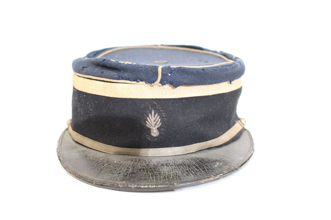Gendarmerie polo kepi model 1920, dated 1921. Navy blue cloth, black headband, white braid and cords, sewn-on flaming grenade badge, silver false chinstrap, flaming grenade buttons, black sateen interior with markings. ABE, numerous moth holes.
