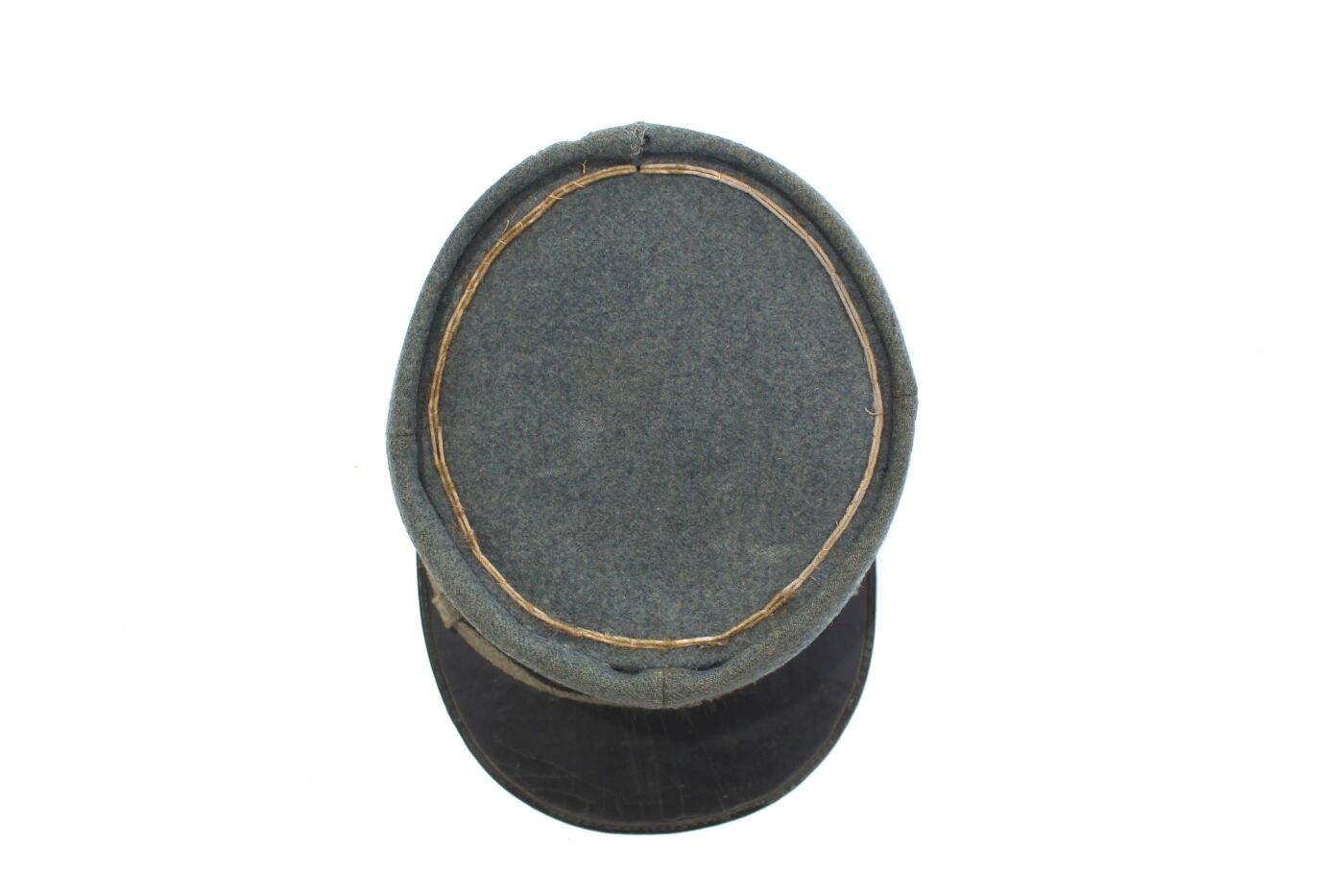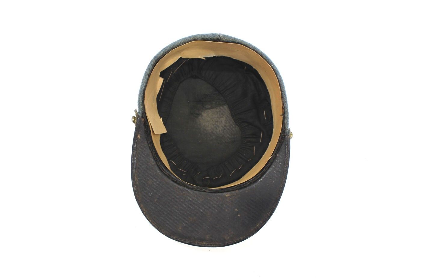 Provost marshal's polo kepi in horizon blue cloth, circa 1915-1918. Horizon blue cloth, white braid, matching false chinstrap, sewn-on badge with flaming grenade, black sateen interior. FAIR CONDITION