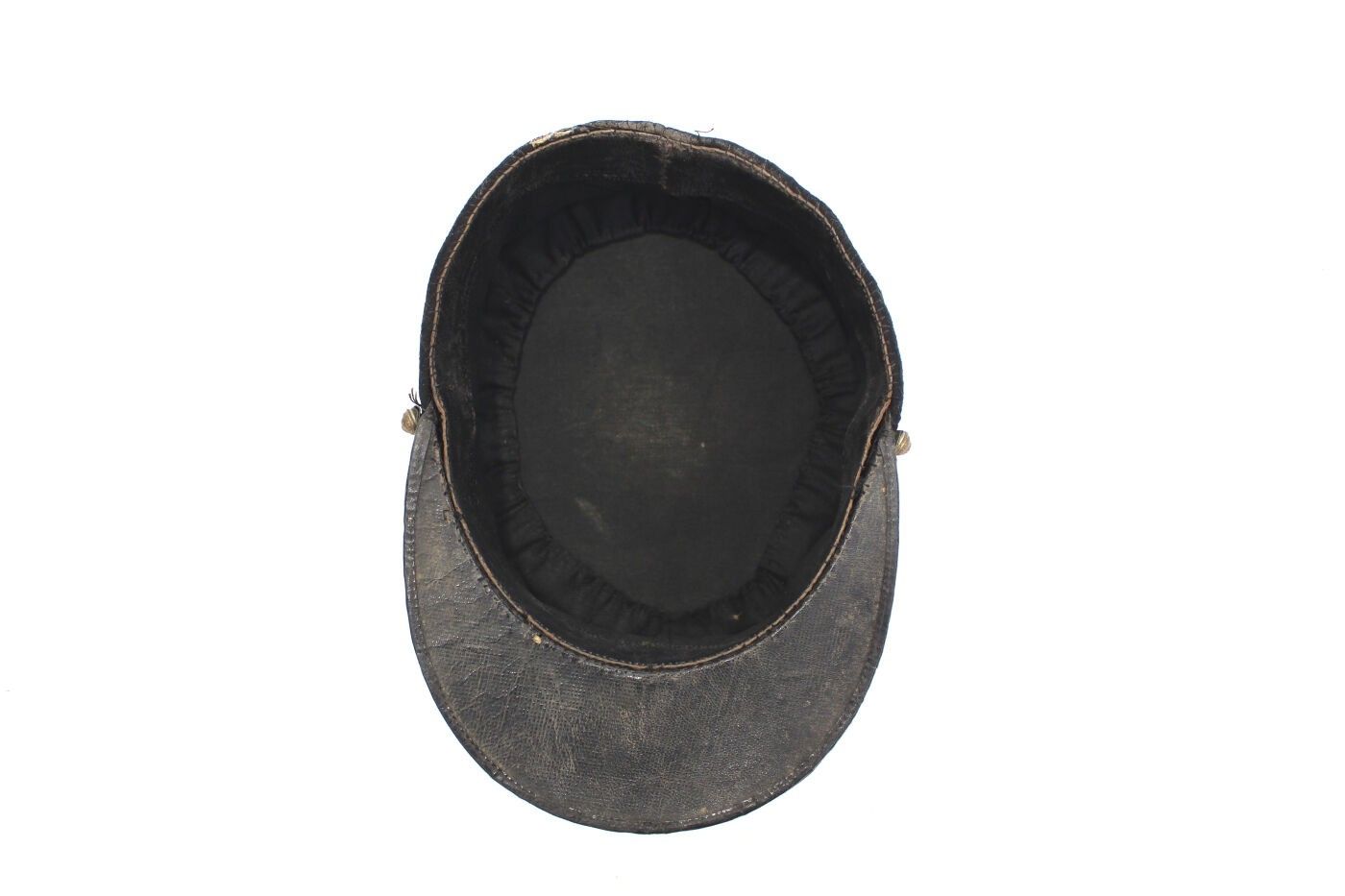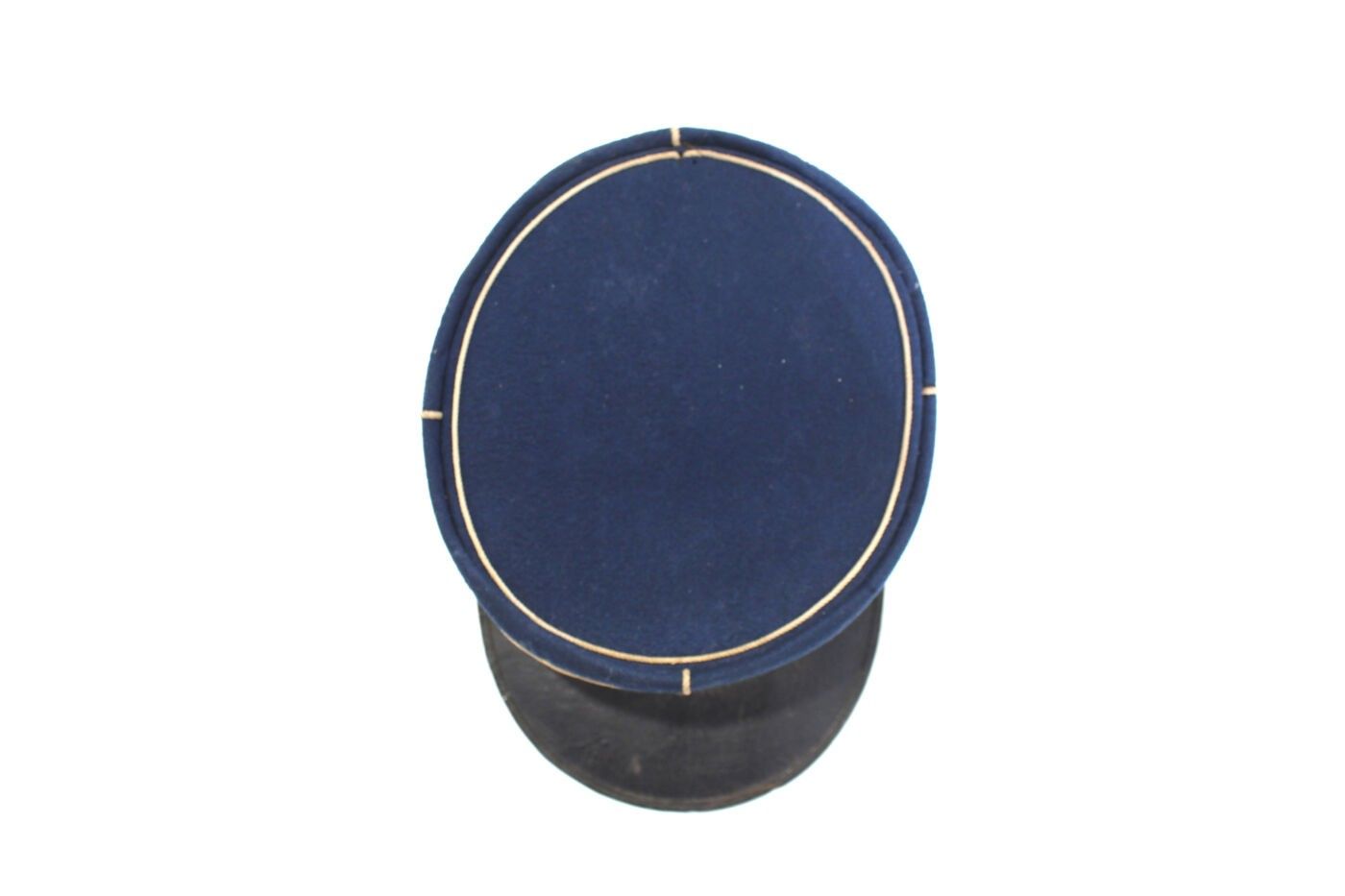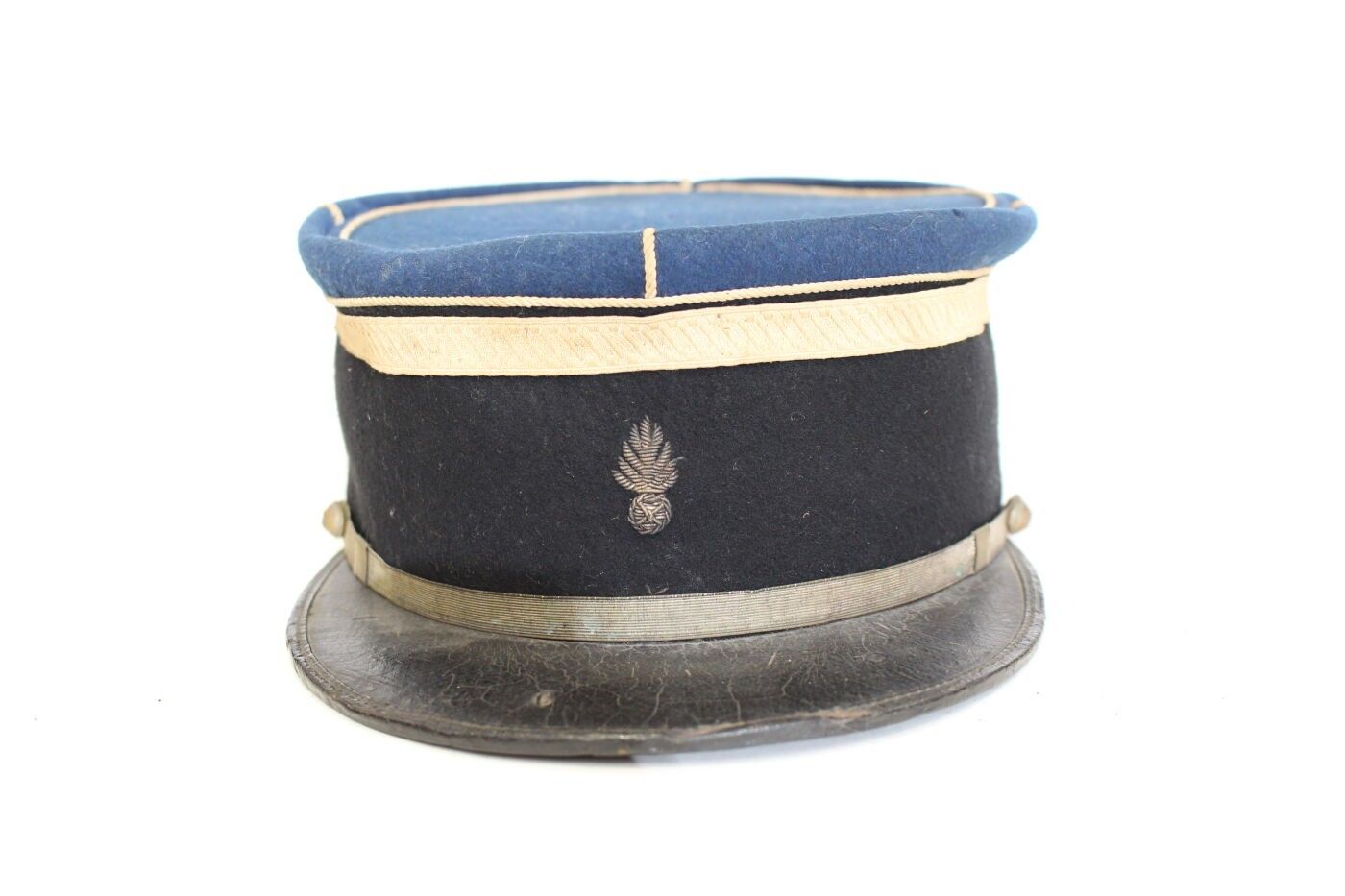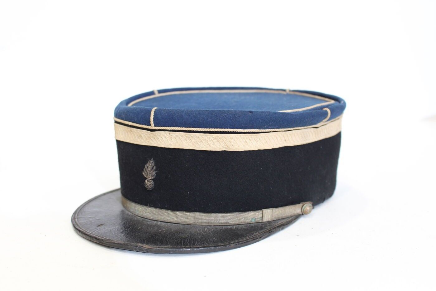 Gendarmerie polo kepi circa 1915-1920. Blue cloth, black headband, silver stitched badge with flaming grenade, silver false chinstrap, black sateen interior. FAIR CONDITION