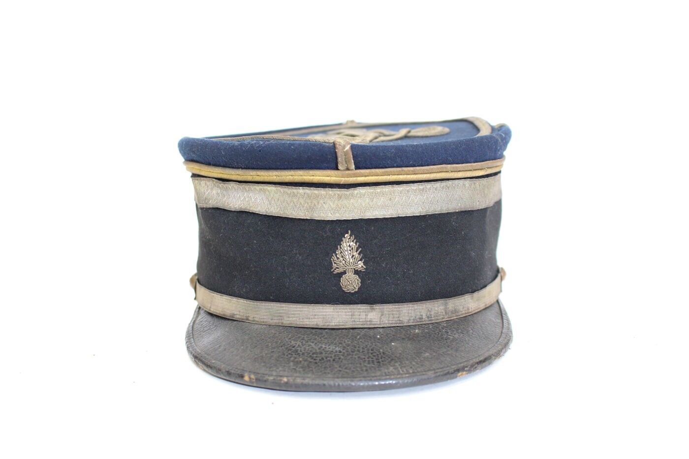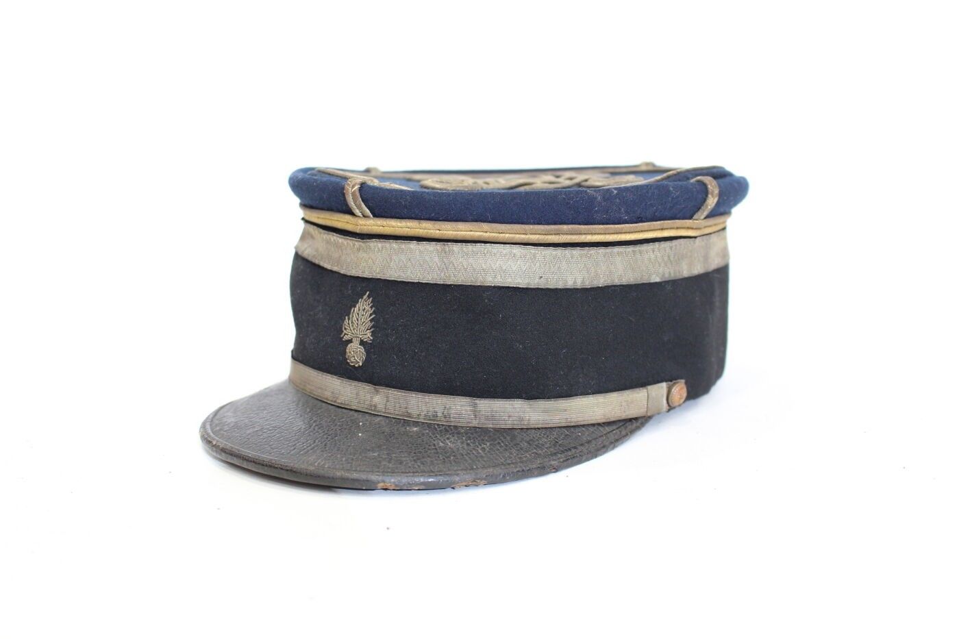 Gendarmerie second lieutenant's polo kepi, circa 1915-1920. Blue cloth, black headband, white braid, gold cords, silver false chinstrap, sewn-on badge with flaming grenade, buttons with flaming grenade, black sateen interior. FAIR CONDITION