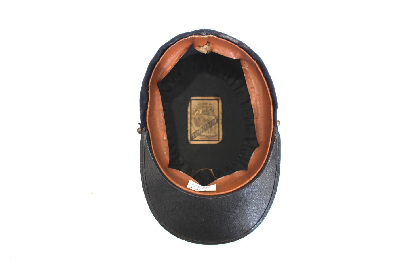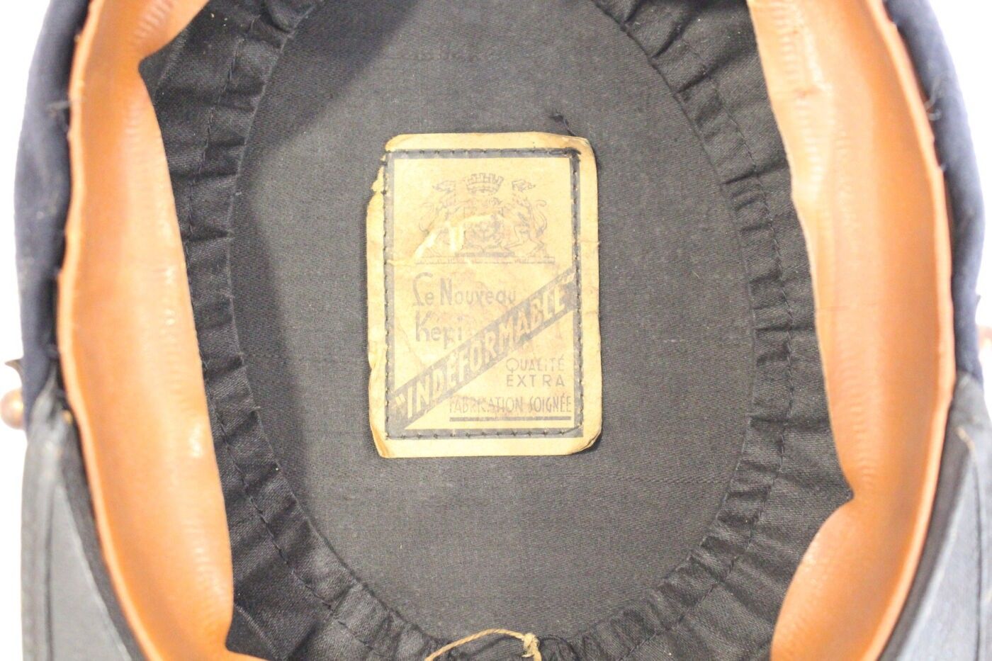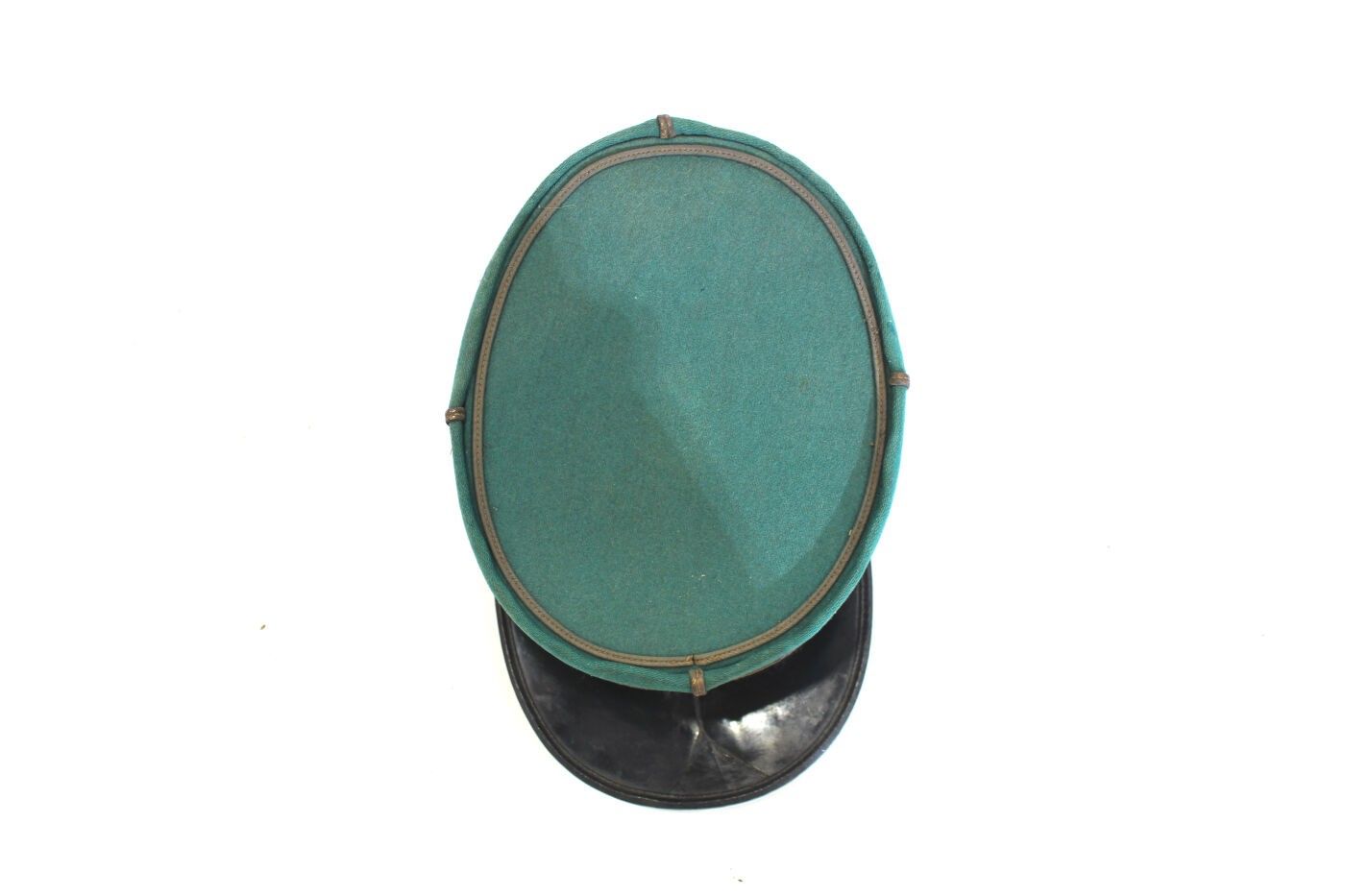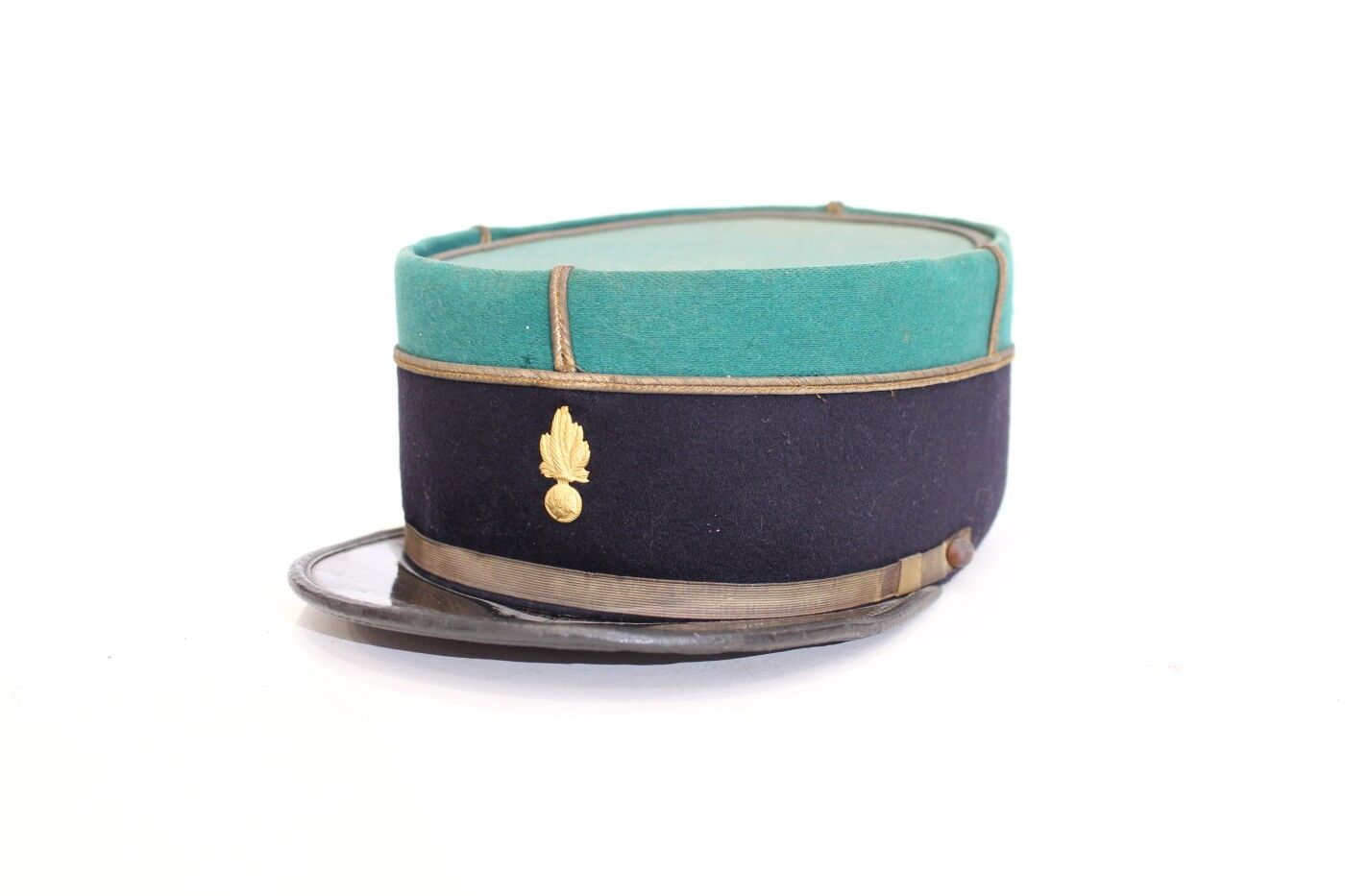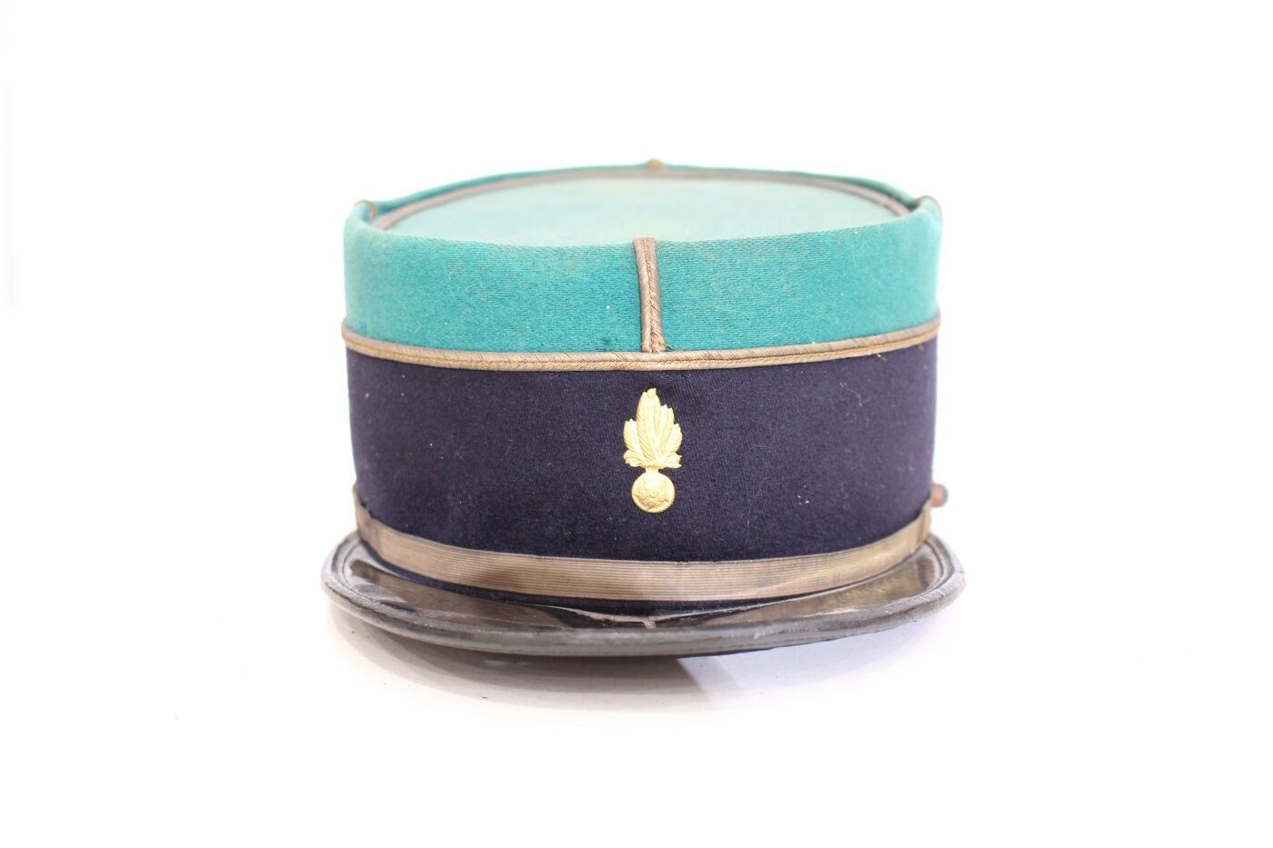 Unidentified kepi, probably foreign (Monaco?). In green cloth, black headband, gold cords and false chinstrap, gold metal badge with flaming grenade, smooth buttons, black sateen interior. FAIR CONDITION