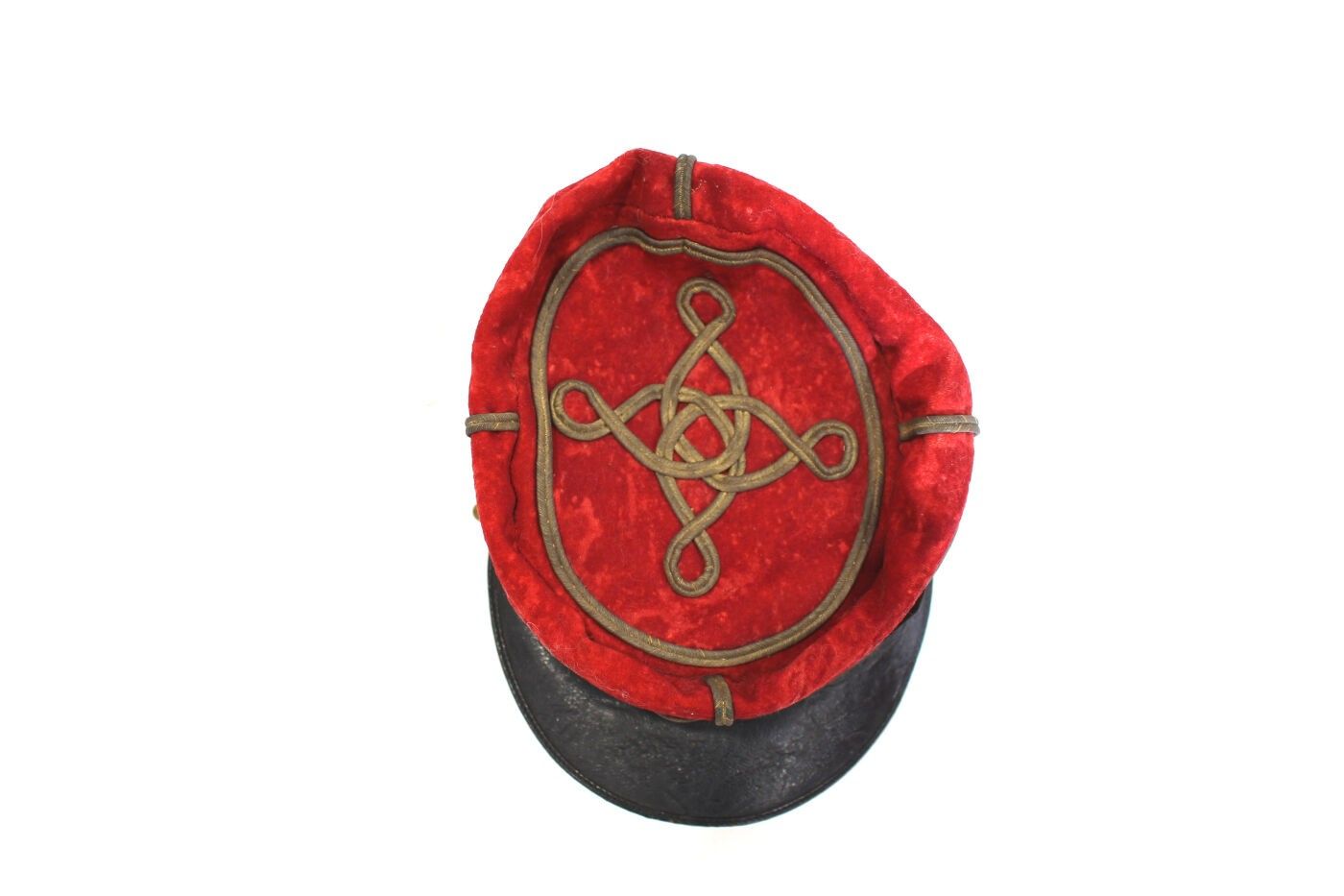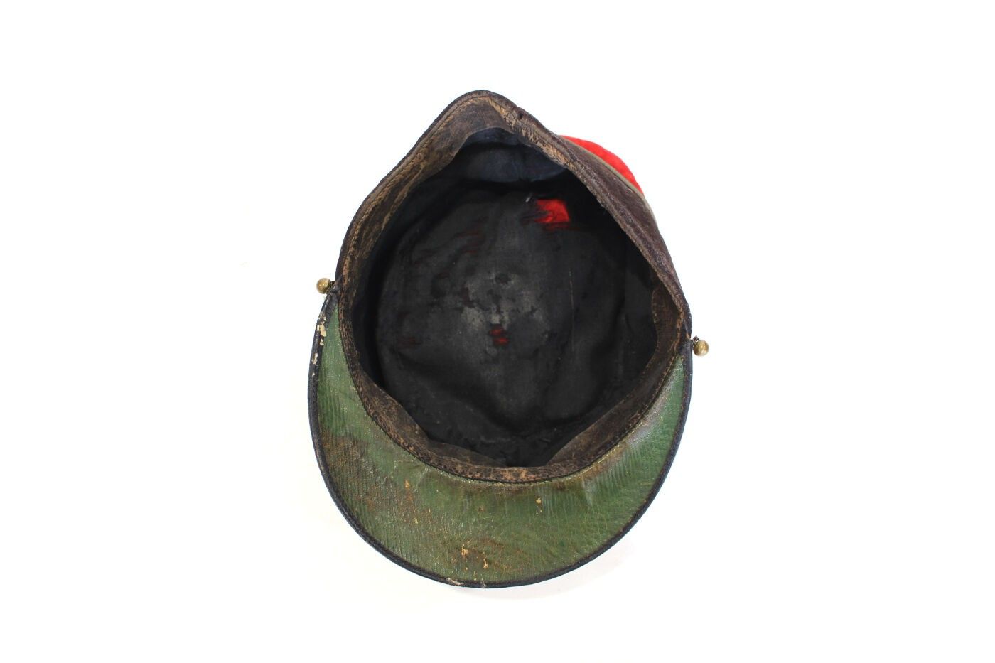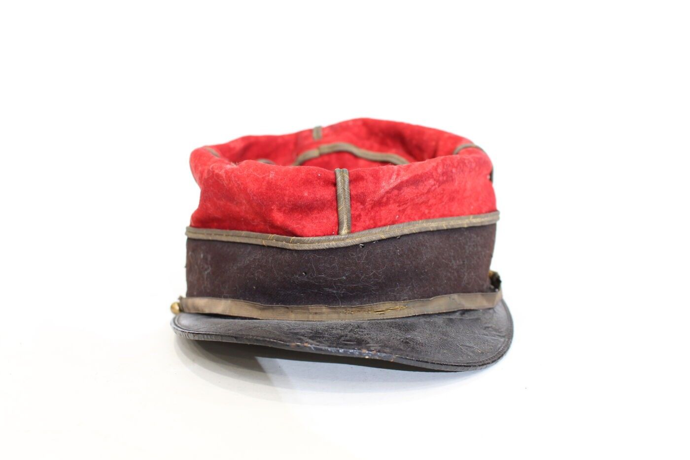 Infantry second lieutenant's kepi circa 1910-1914. Red cloth, black headband, gold cords and chinstrap, smooth buttons, black sateen interior, green visor. ABE