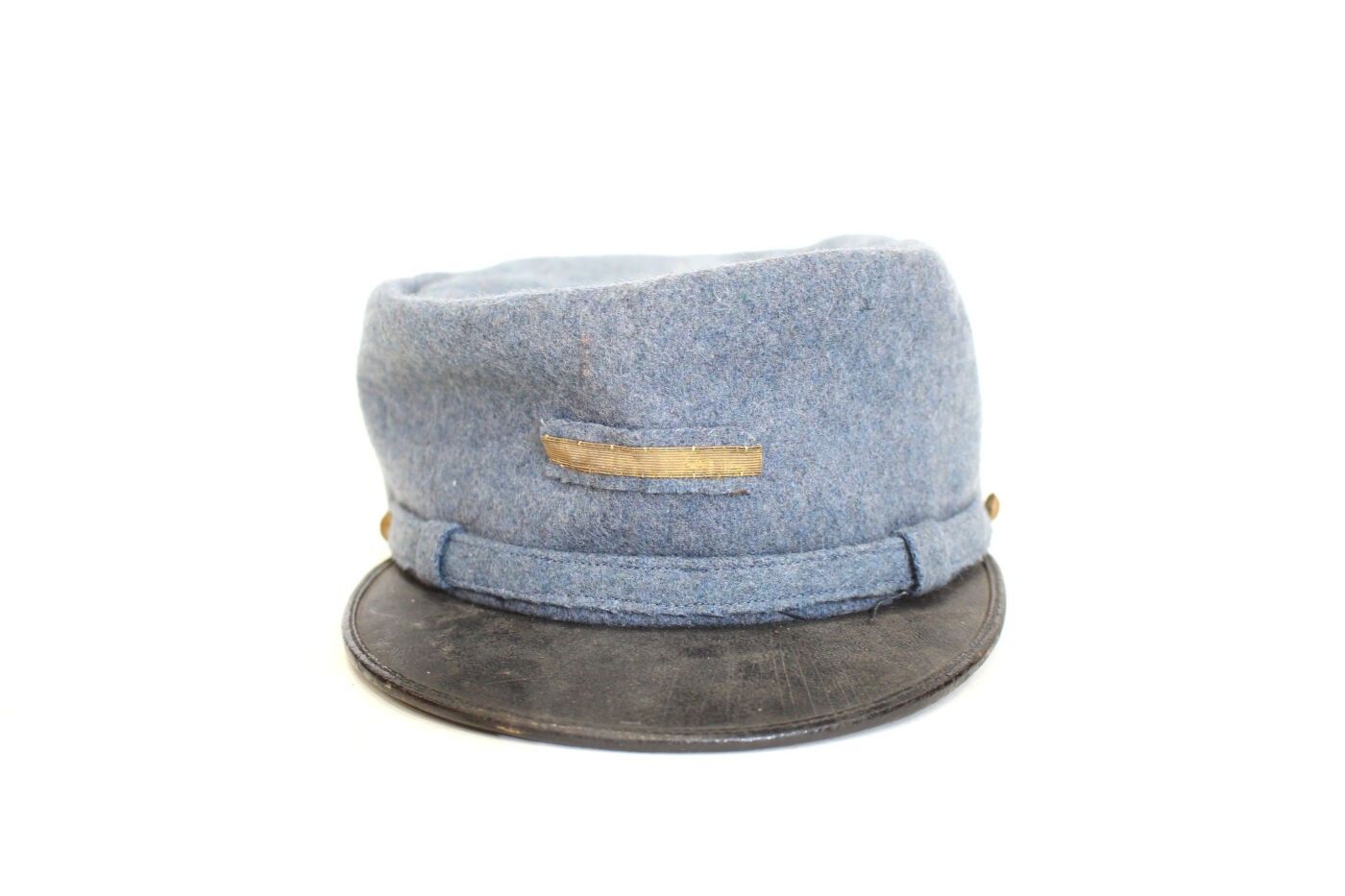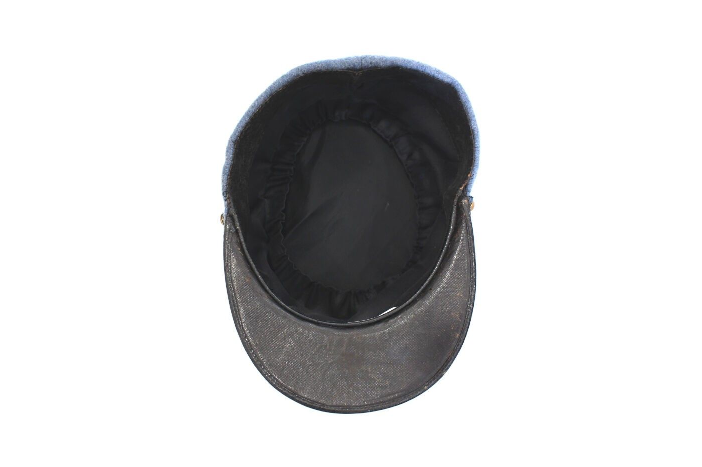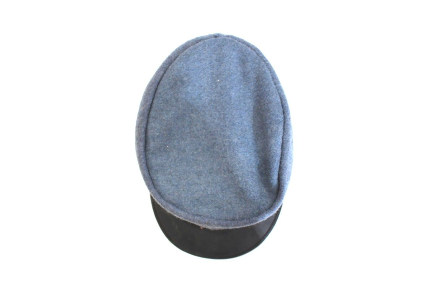 Second lieutenant's kepi circa 1915-1916. Horizon blue cloth, matching chinstrap, gold braid badge, brass buttons, black sateen interior. FAIR CONDITION