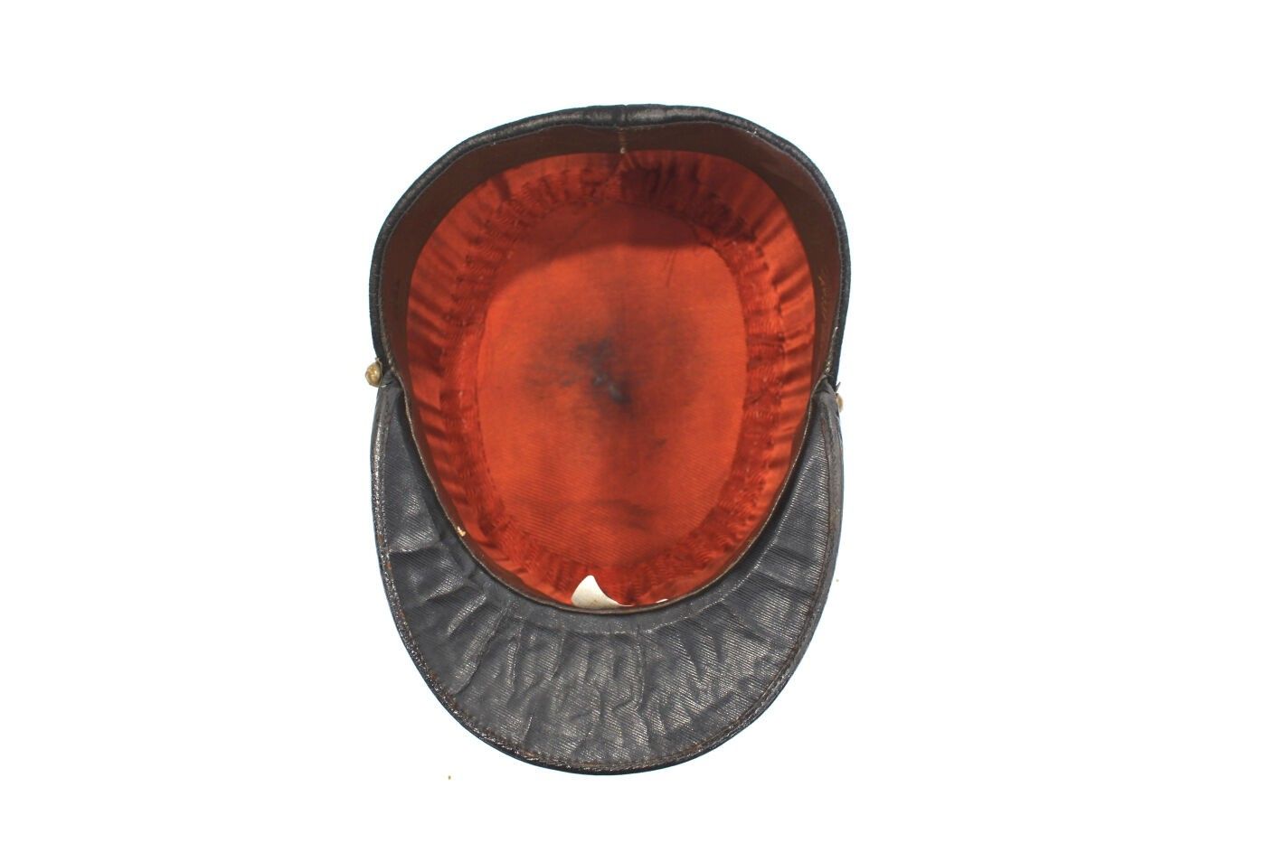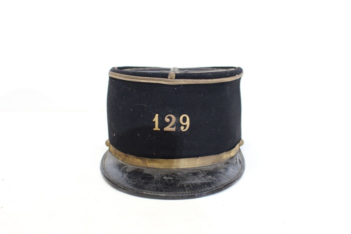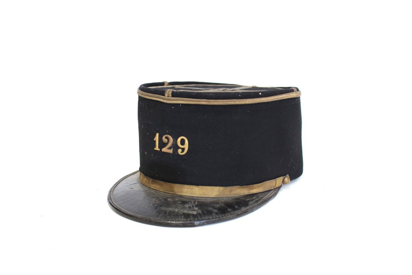 Second lieutenant's kepi of the 129th artillery, circa 1930. Black cloth, gilt 129 metal badge, gilt braid and chinstrap, cross-barrel buttons, orange sateen interior. ABE
