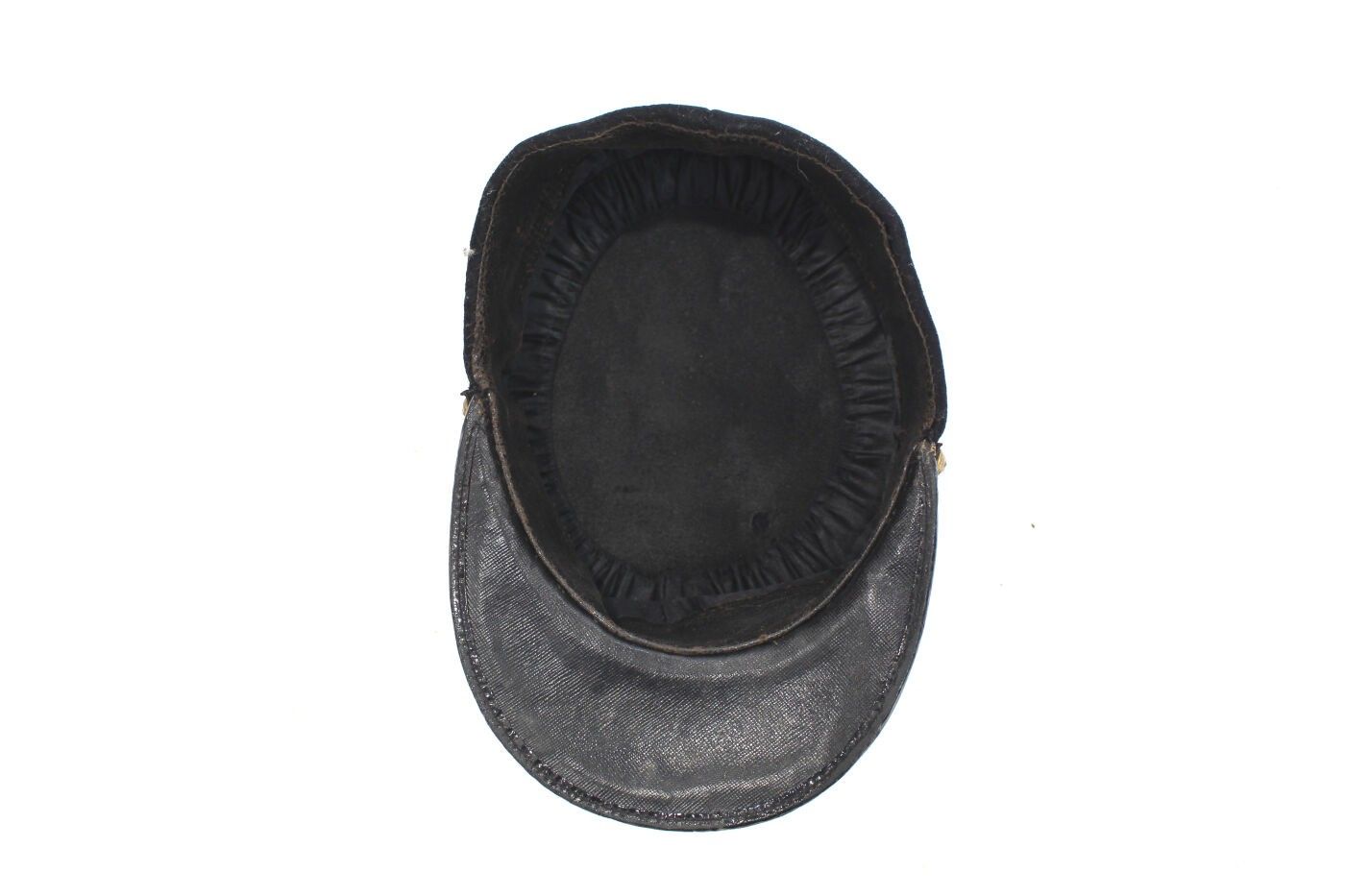 NCO polo kepi of the 8th Engineers circa 1917-1918. Black cloth, 8 gold stitched insignia, scarlet drawstrings, gold false chinstrap, buttons on breastplate and helmet, black sateen interior. ABE