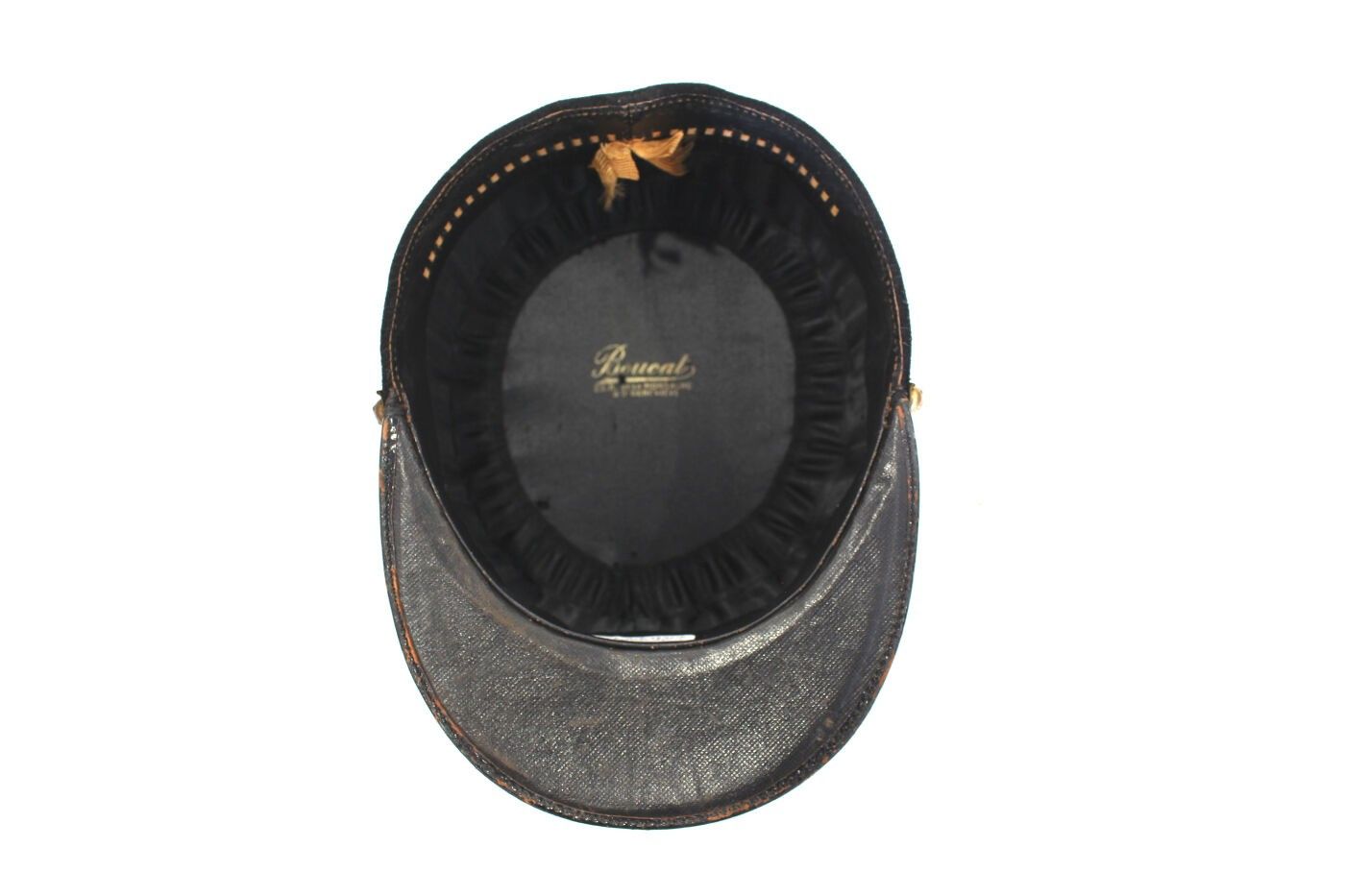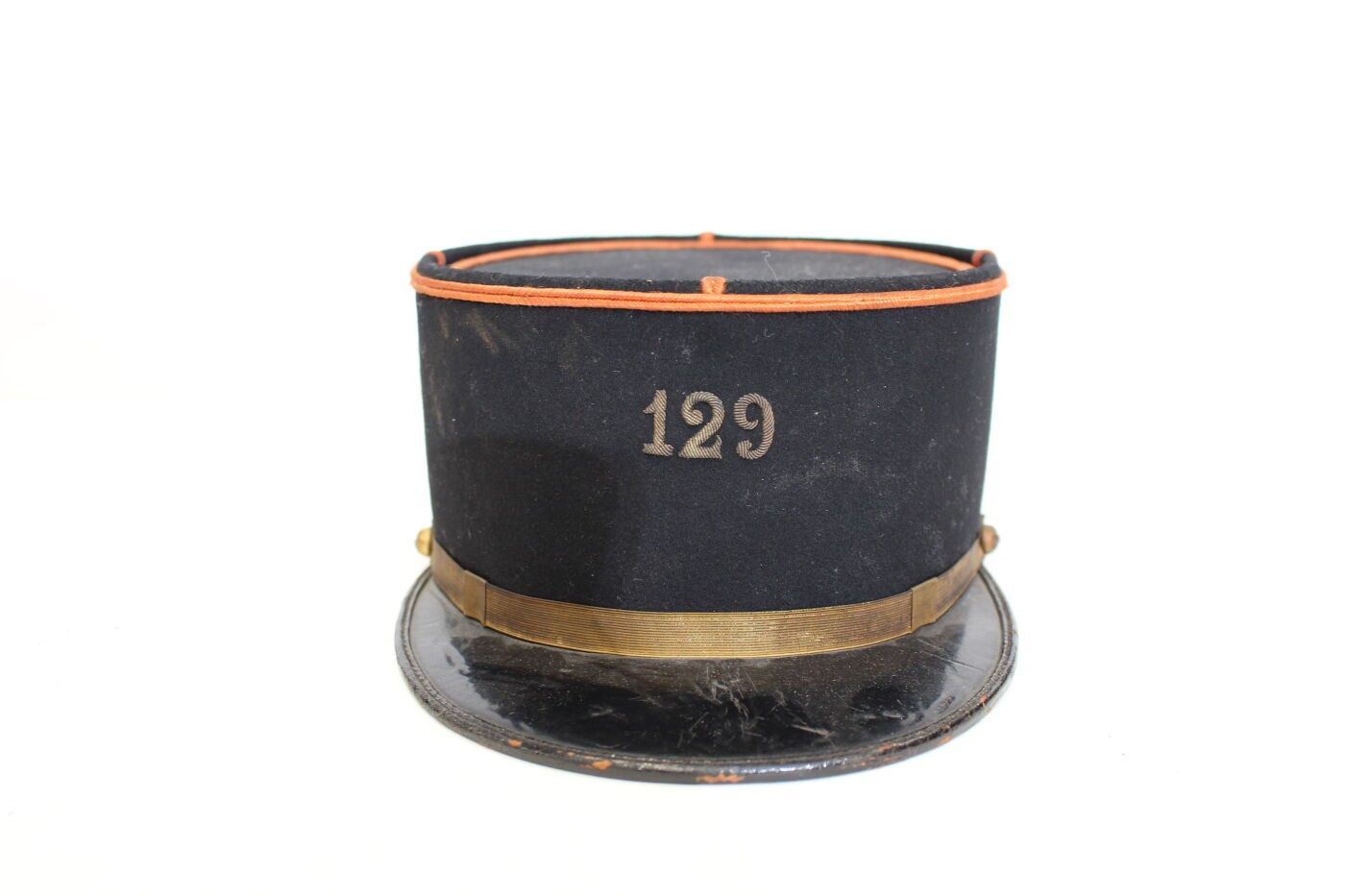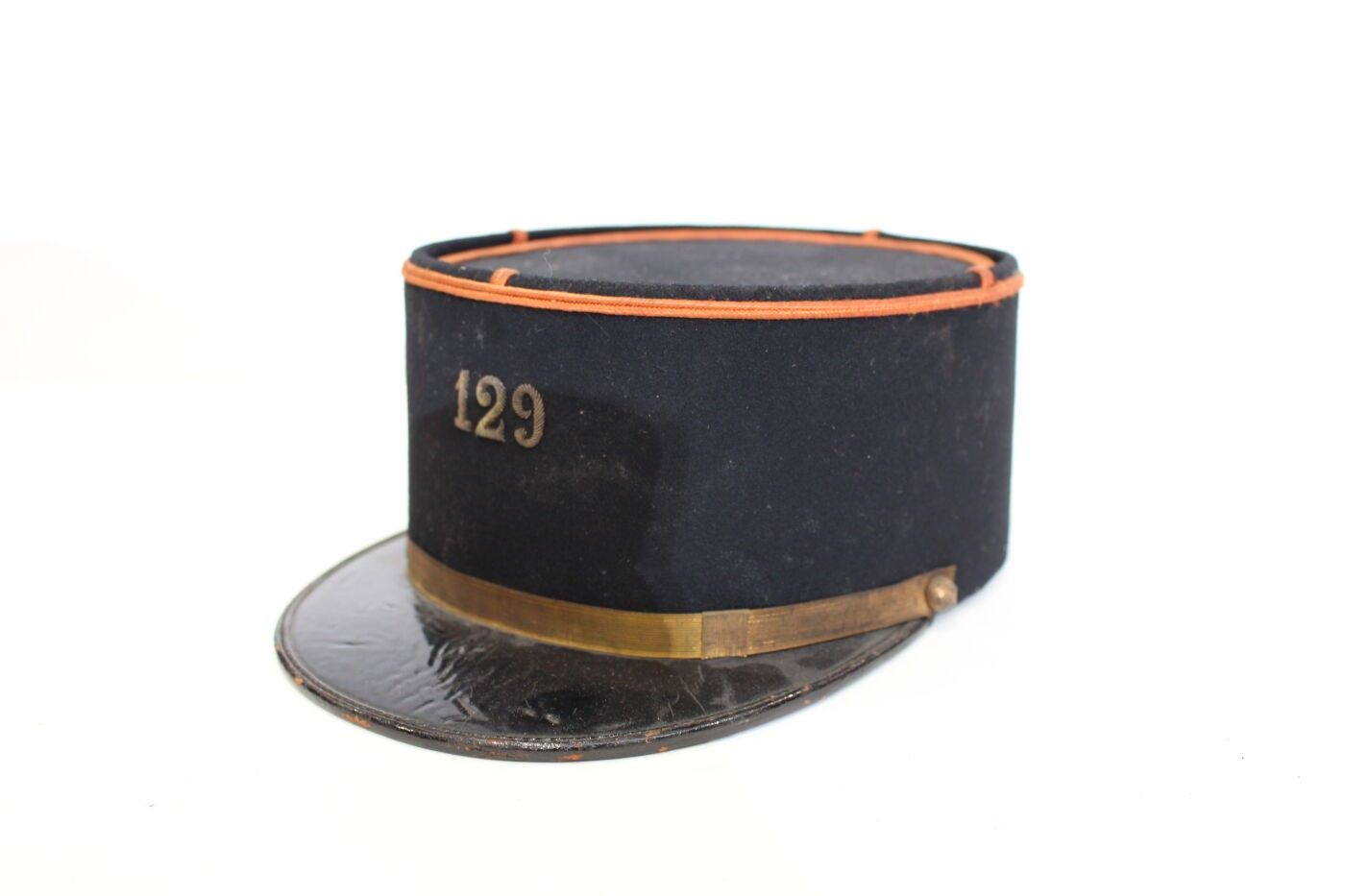 Non-commissioned officer's kepi of the 129th horse-drawn heavy artillery, circa 1930. In black cloth, 129 gold stitched badge, scarlet drawstrings, gold false chinstrap, black satinette interior. ABE