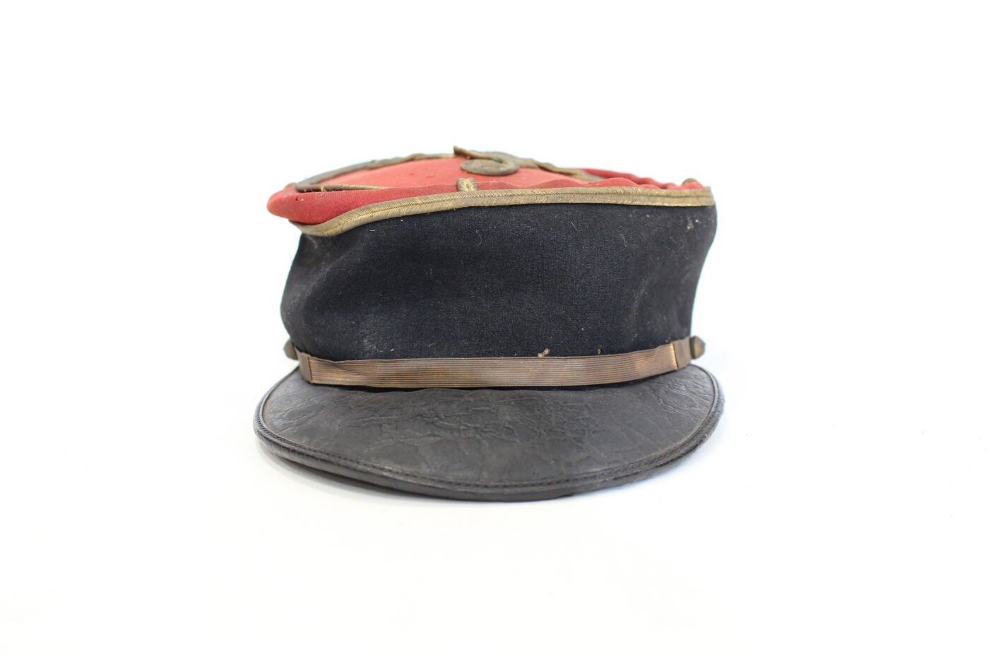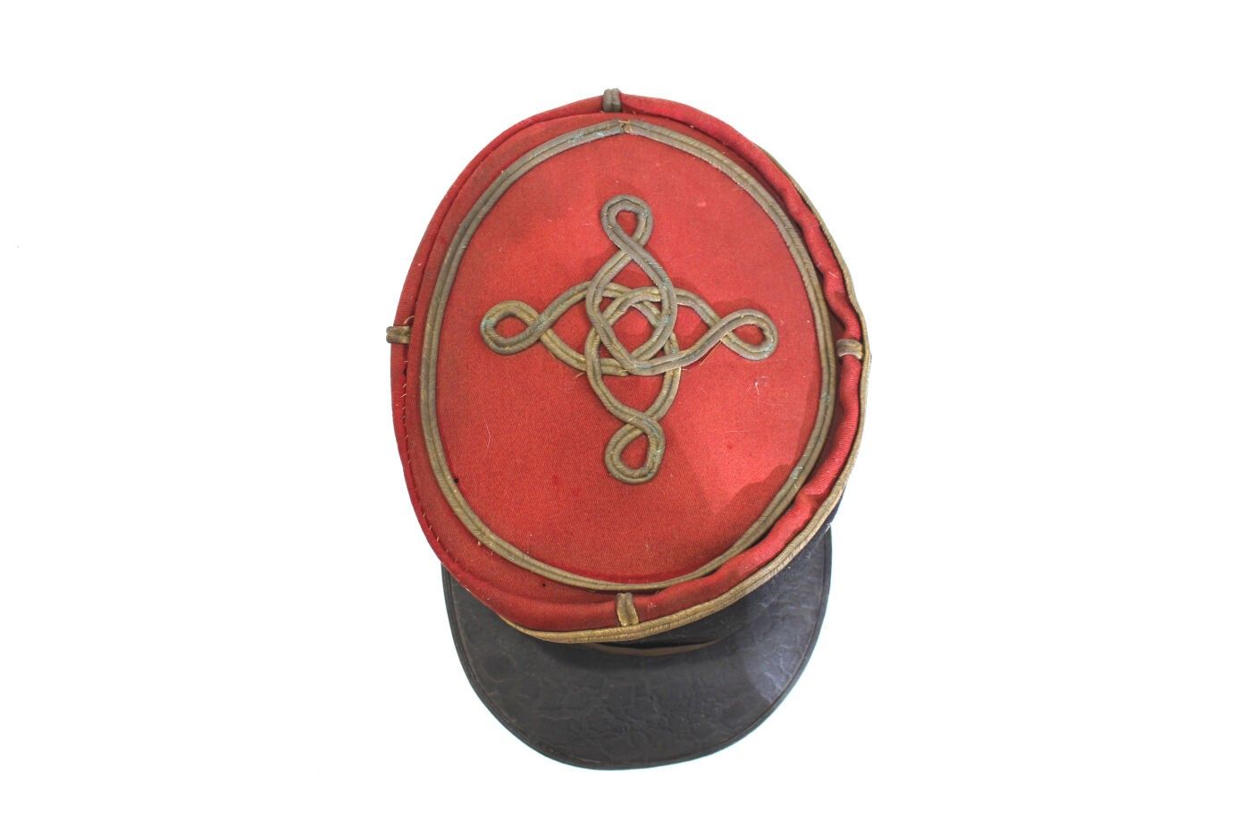 Infantry second lieutenant's polo kepi, circa 1917-1918. Scarlet cloth, black headband, gold braid and chinstrap, flaming grenade buttons, black sateen interior. ABE