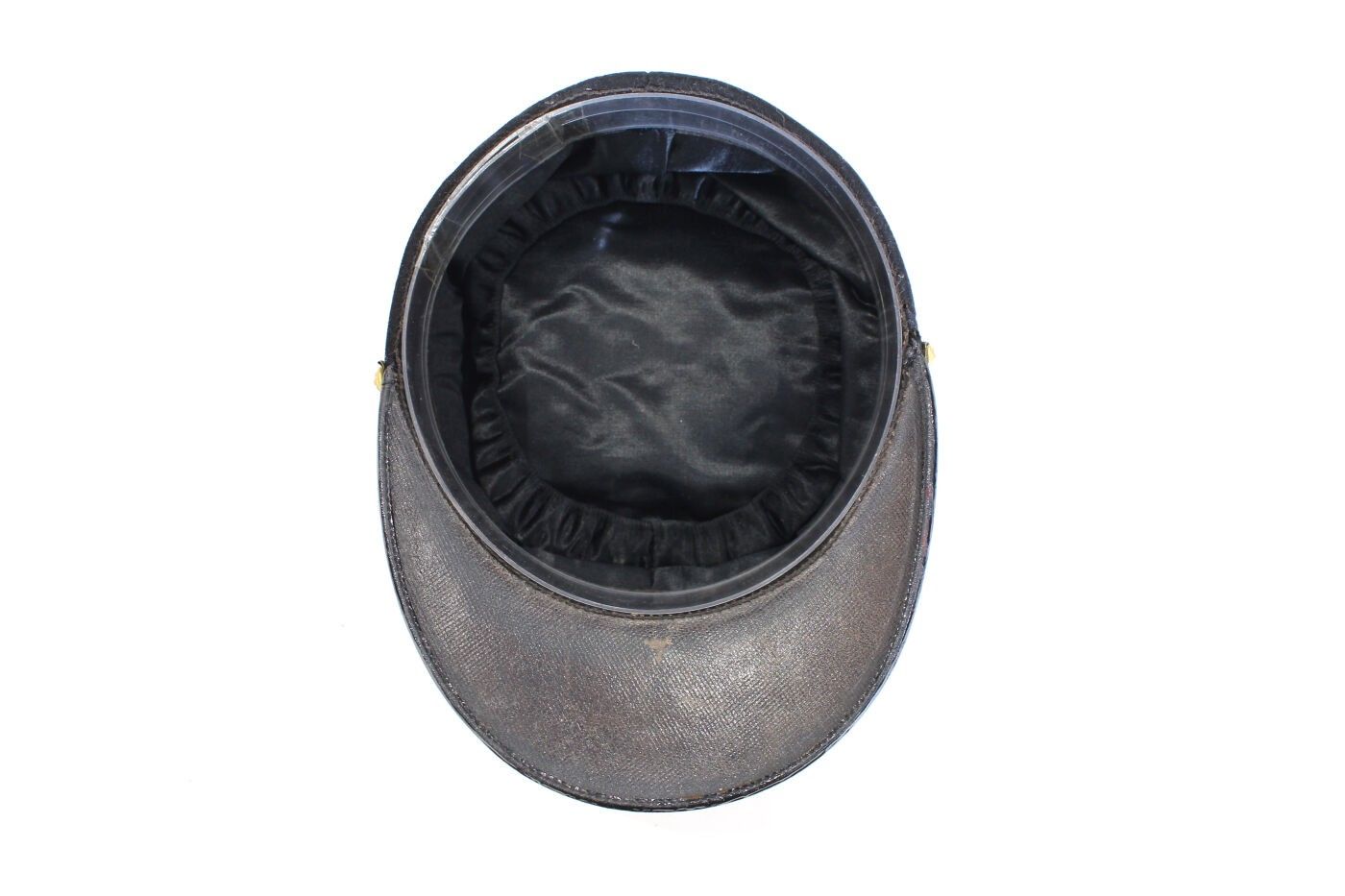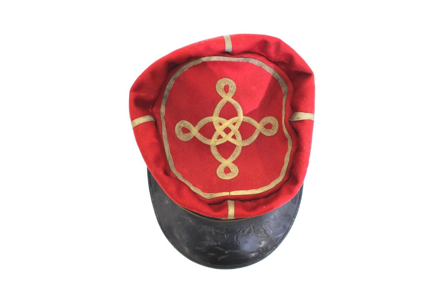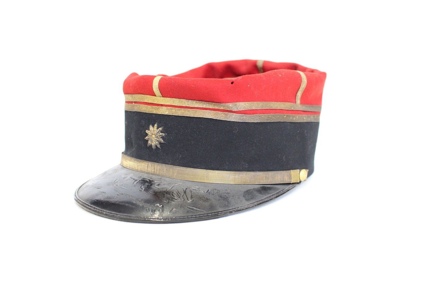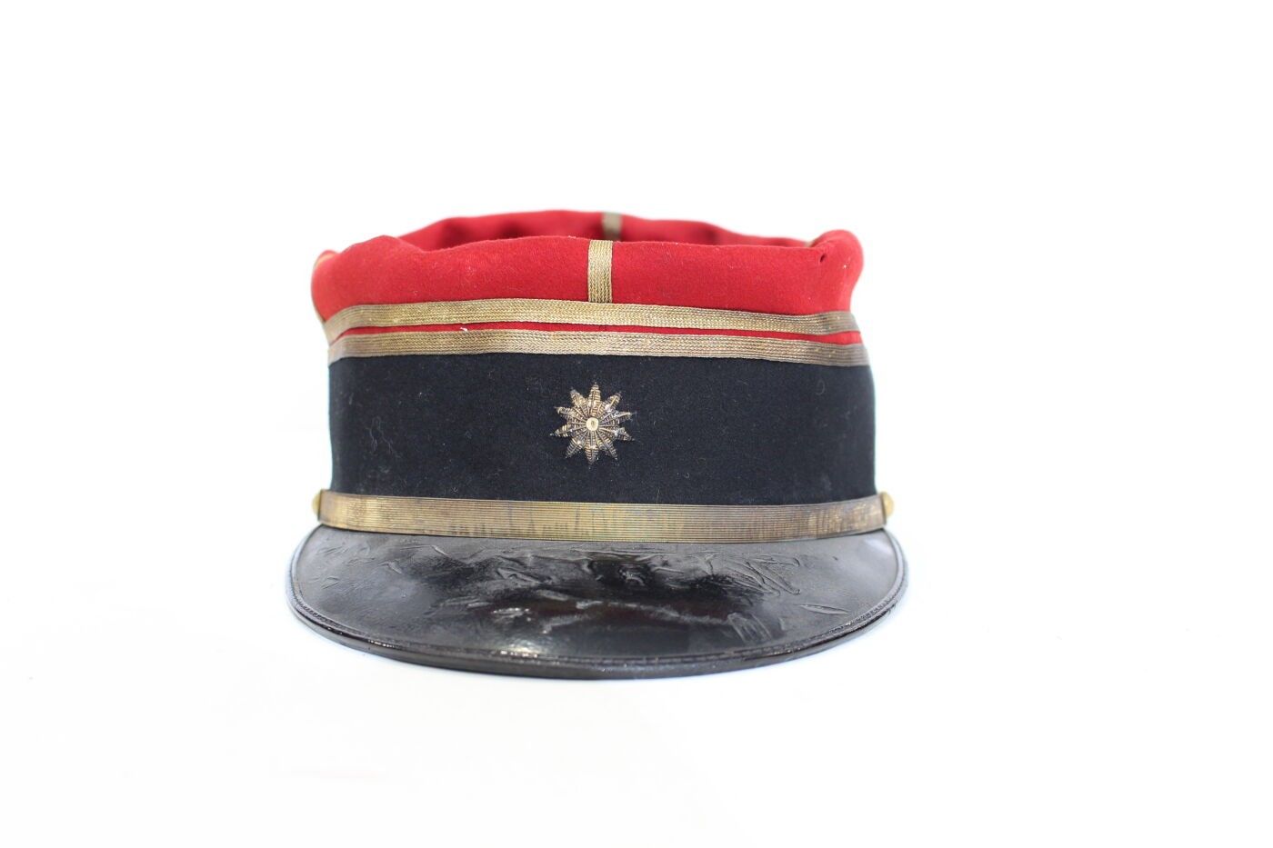 Health service administration lieutenant's kepi circa 1910-1914. Scarlet cloth, black headband, gold stitched badge with 10-pointed star, gold braid and chinstrap, black sateen interior. ABE