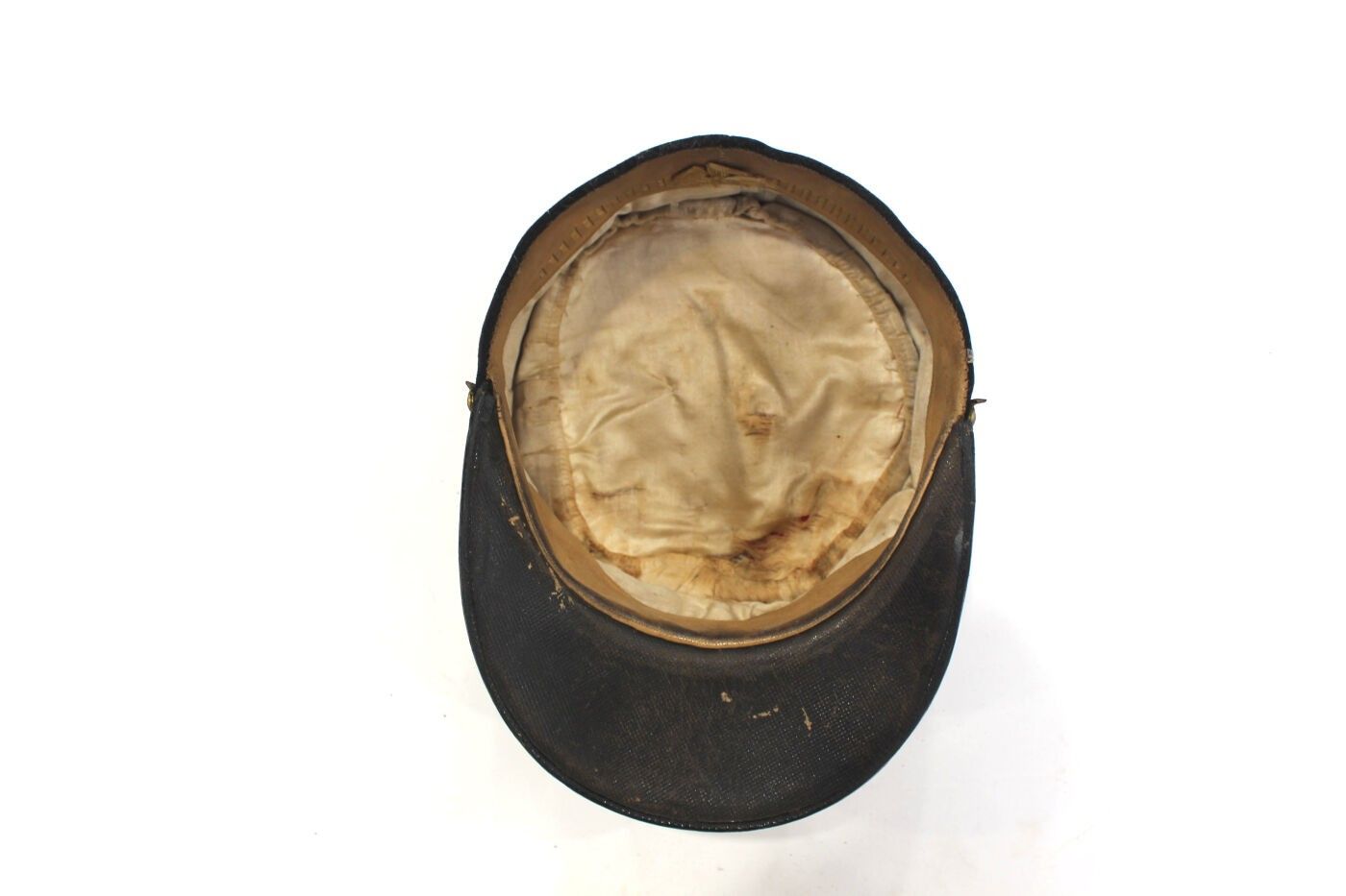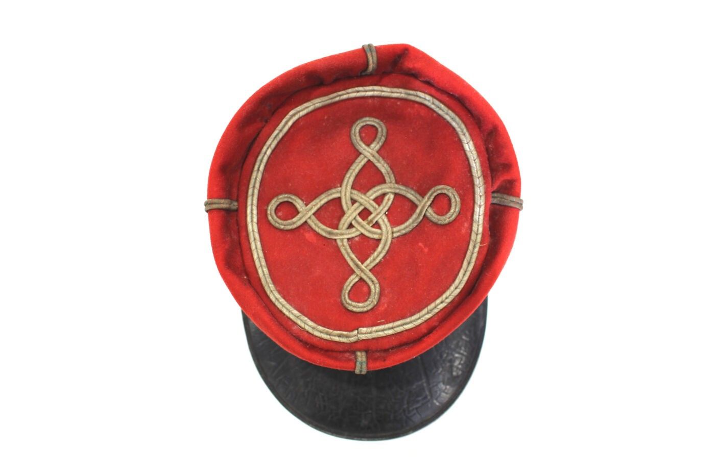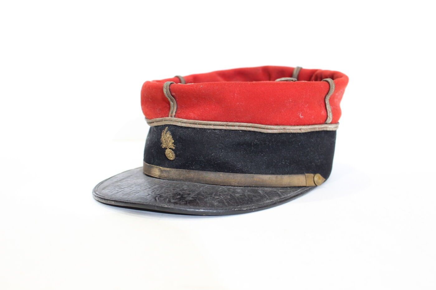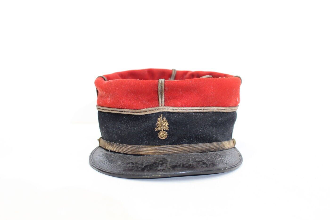 Warrant officer's kepi (see button), circa 1910-1914. Scarlet cloth, black headband, gold braid and chinstrap, gold stitched badge with flaming grenade, beige satin lining. ABE