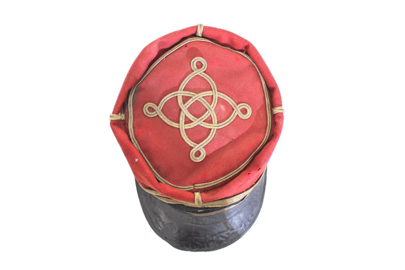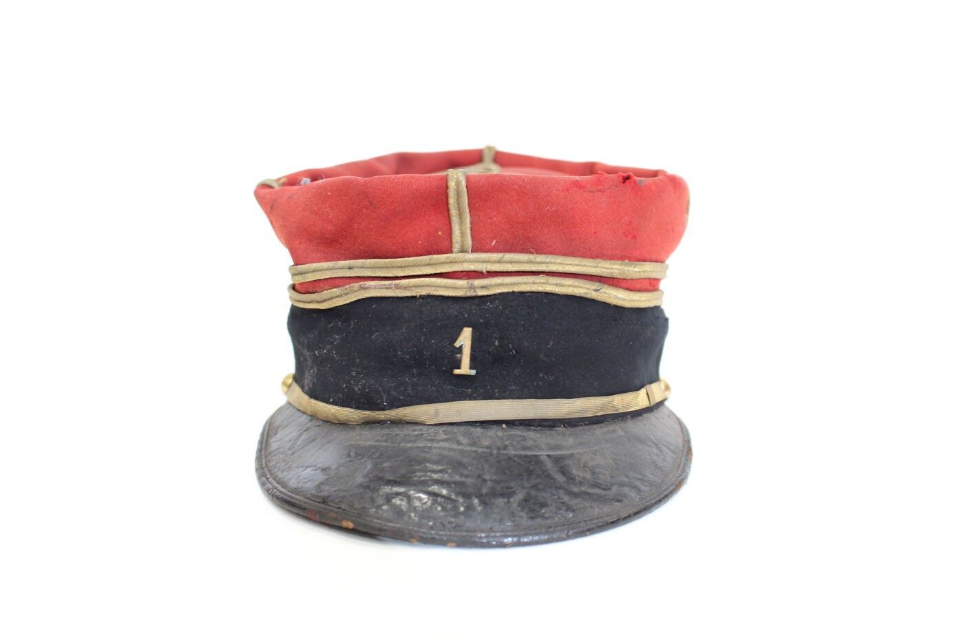 Lieutenant's kepi of the 1st Zouaves circa 1910-1914. Scarlet cloth, black headband, gilt metal badge 1, gilt braid and false chinstrap, smooth buttons, black sateen interior. ABE. Moth holes.