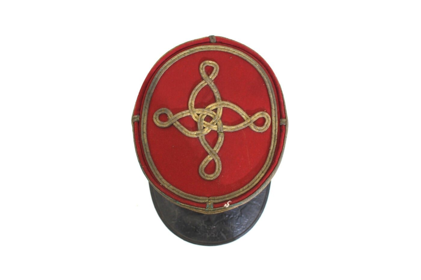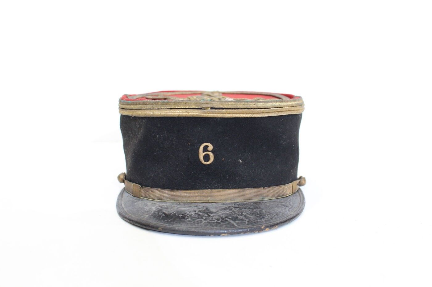 Lieutenant's kepi of the 6th RI circa 1917-1918. Scarlet cloth, black headband, gold 6 metal badge, gold braid and false chinstrap, flaming grenade buttons, satinette interior. ABE