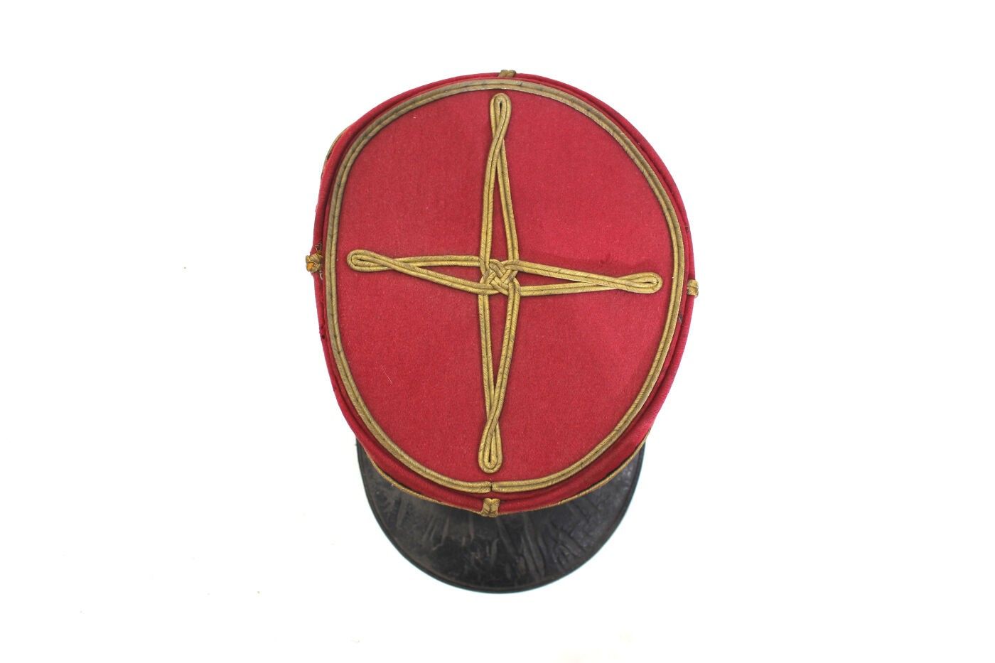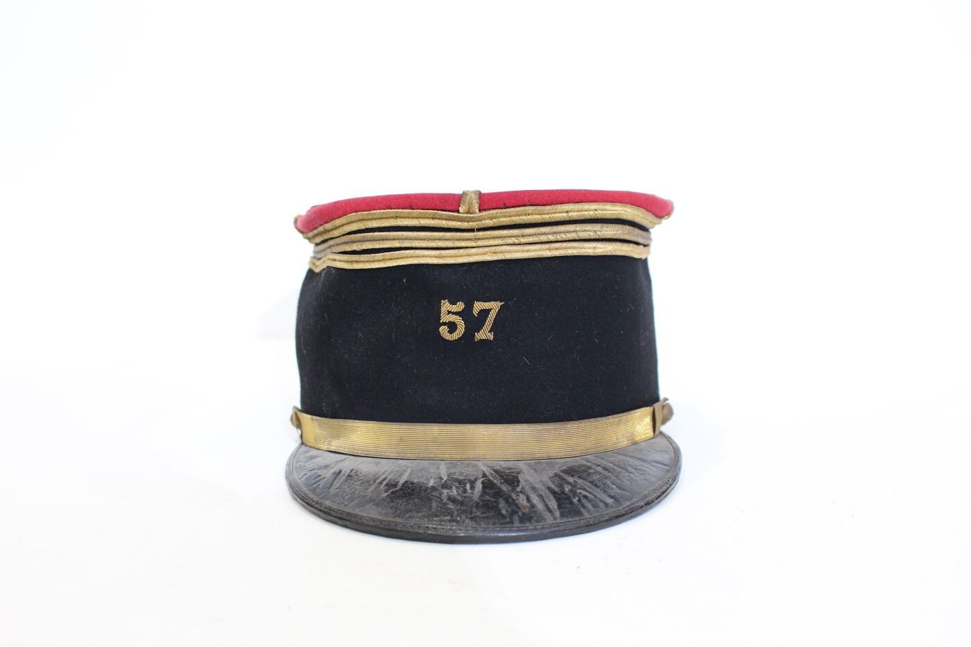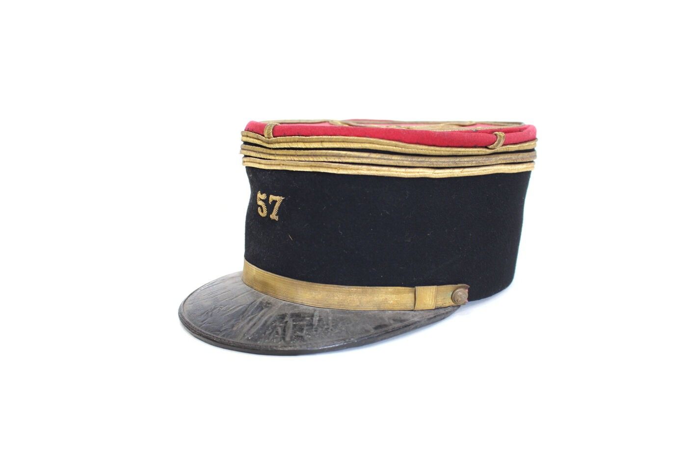 Captain's kepi of the 57th RI circa 1930-1940. Scarlet cloth, black headband, sewn-on 57 gold insignia, gold braid and chinstrap, flaming grenade buttons, black cloth interior.ABE