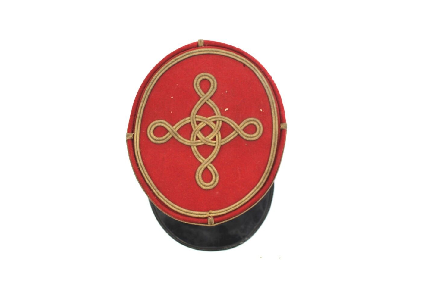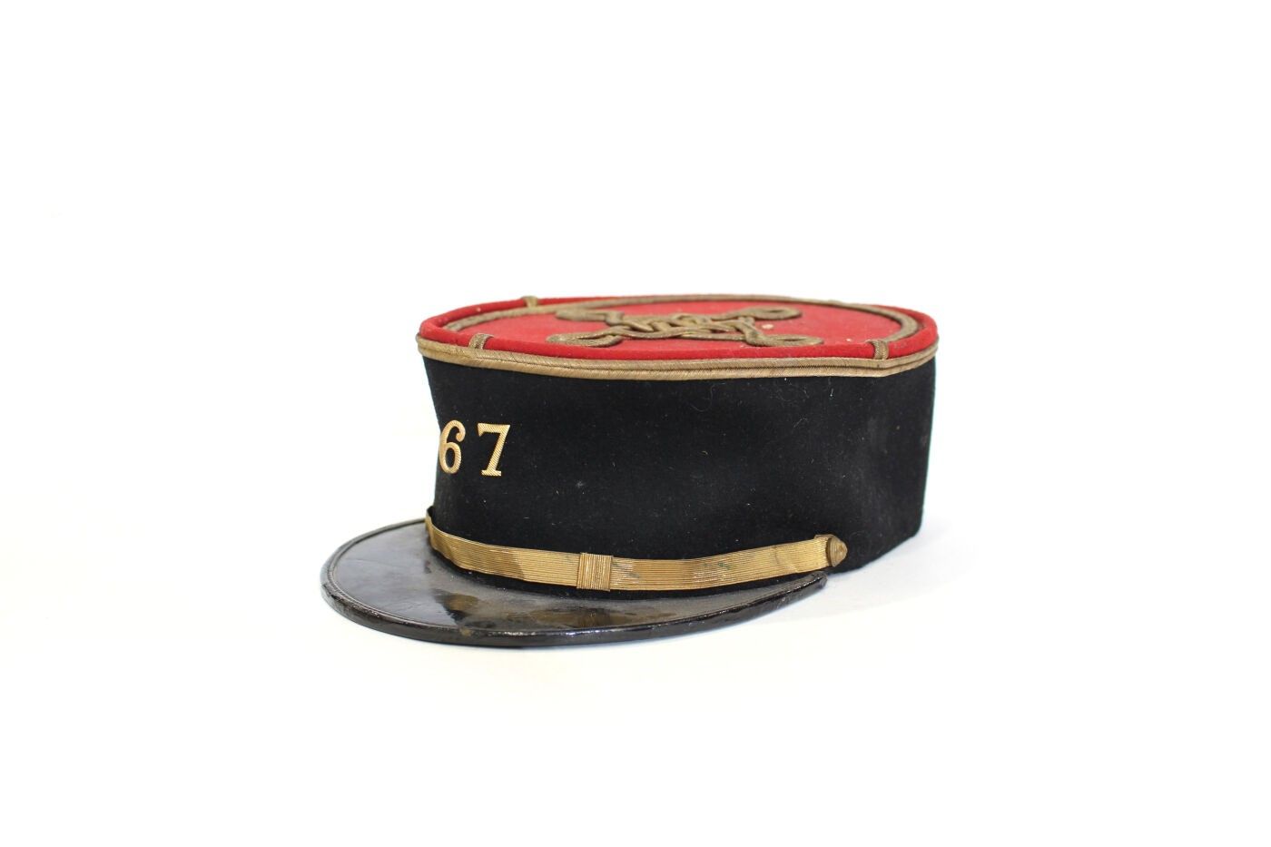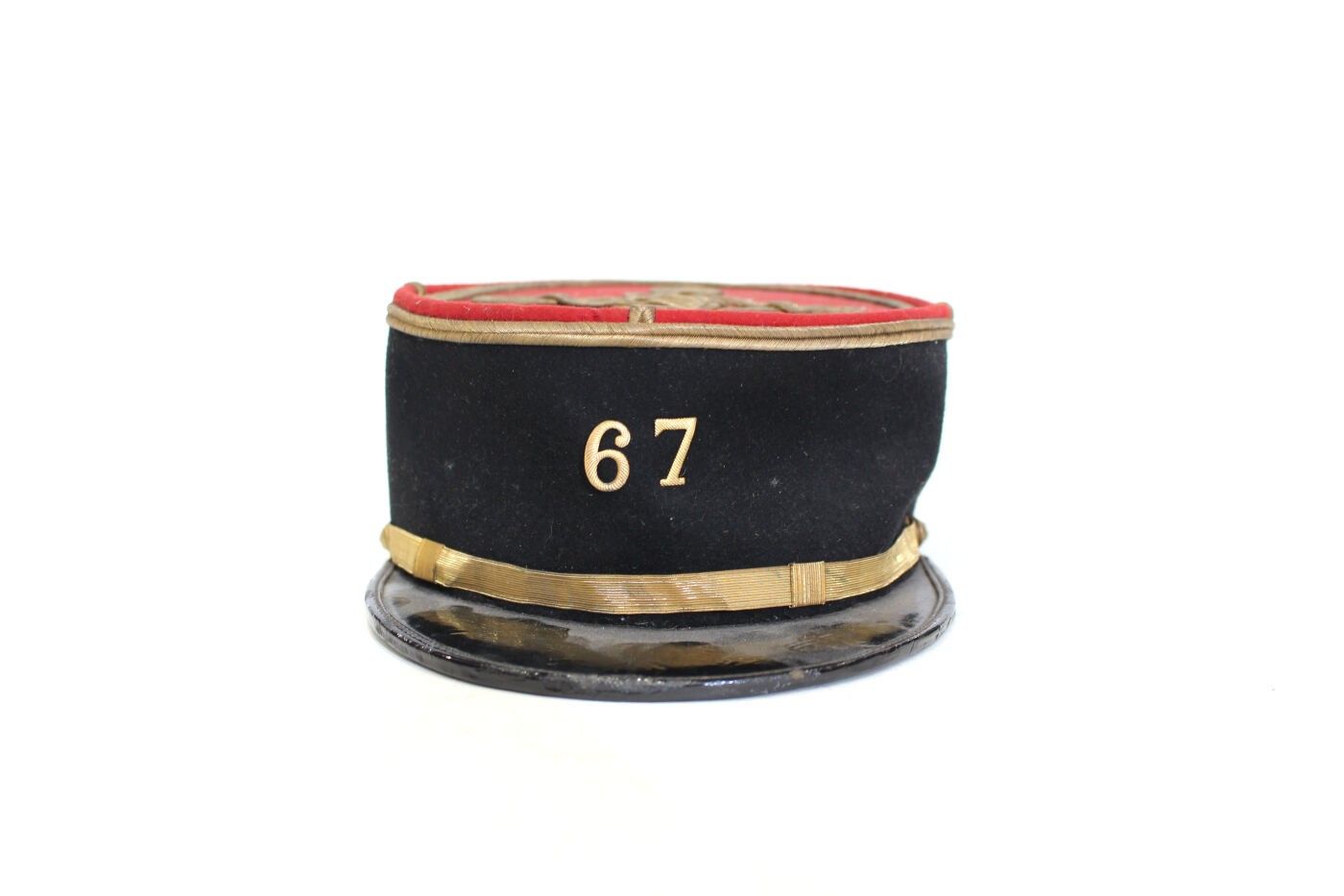 Second lieutenant's kepi of the 67th RI circa 1917-1918. Scarlet cloth, black headband, gilt 67 metal badge, gilt braid and chinstrap, flaming grenade buttons, black sateen interior. ABE