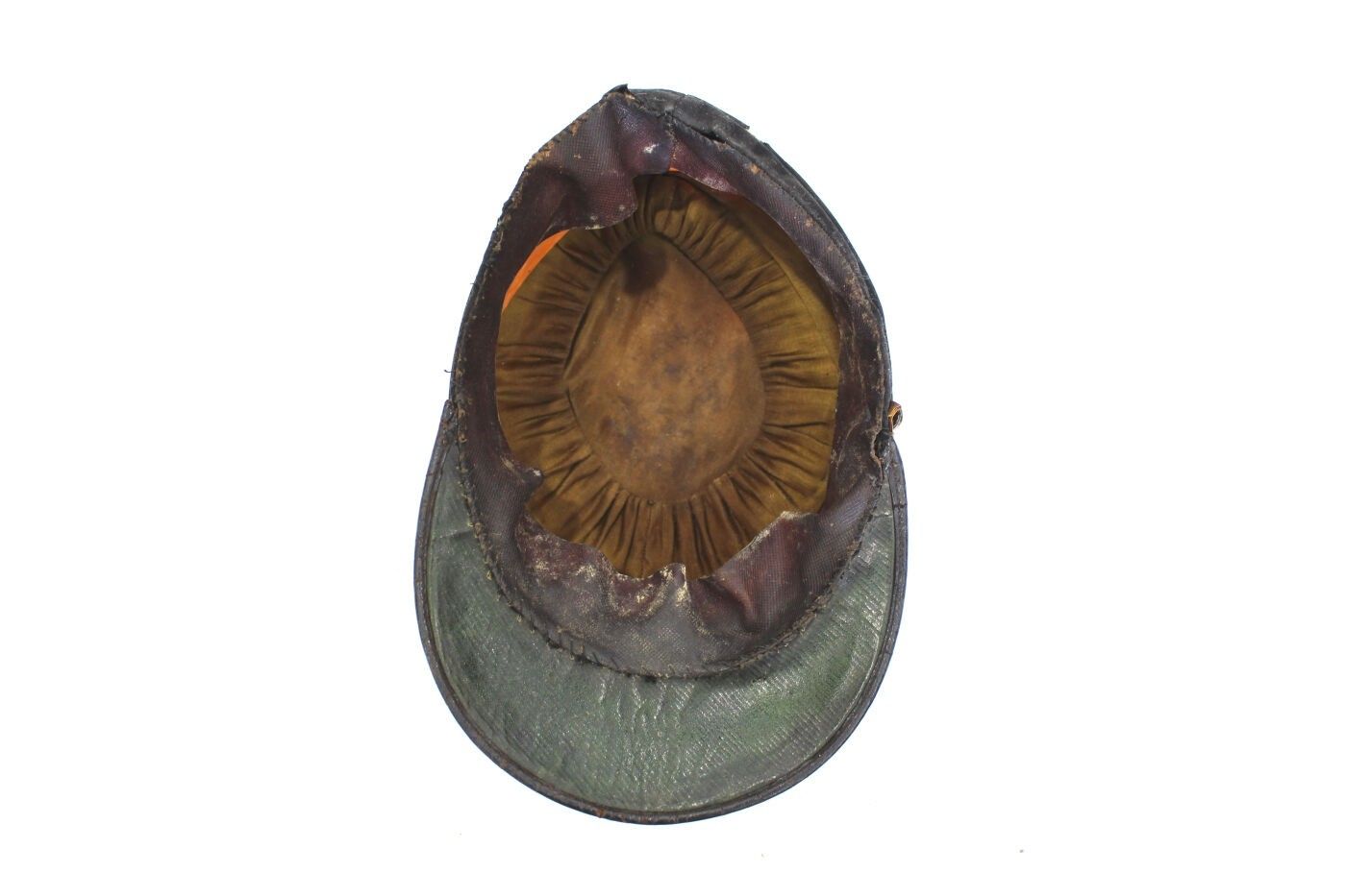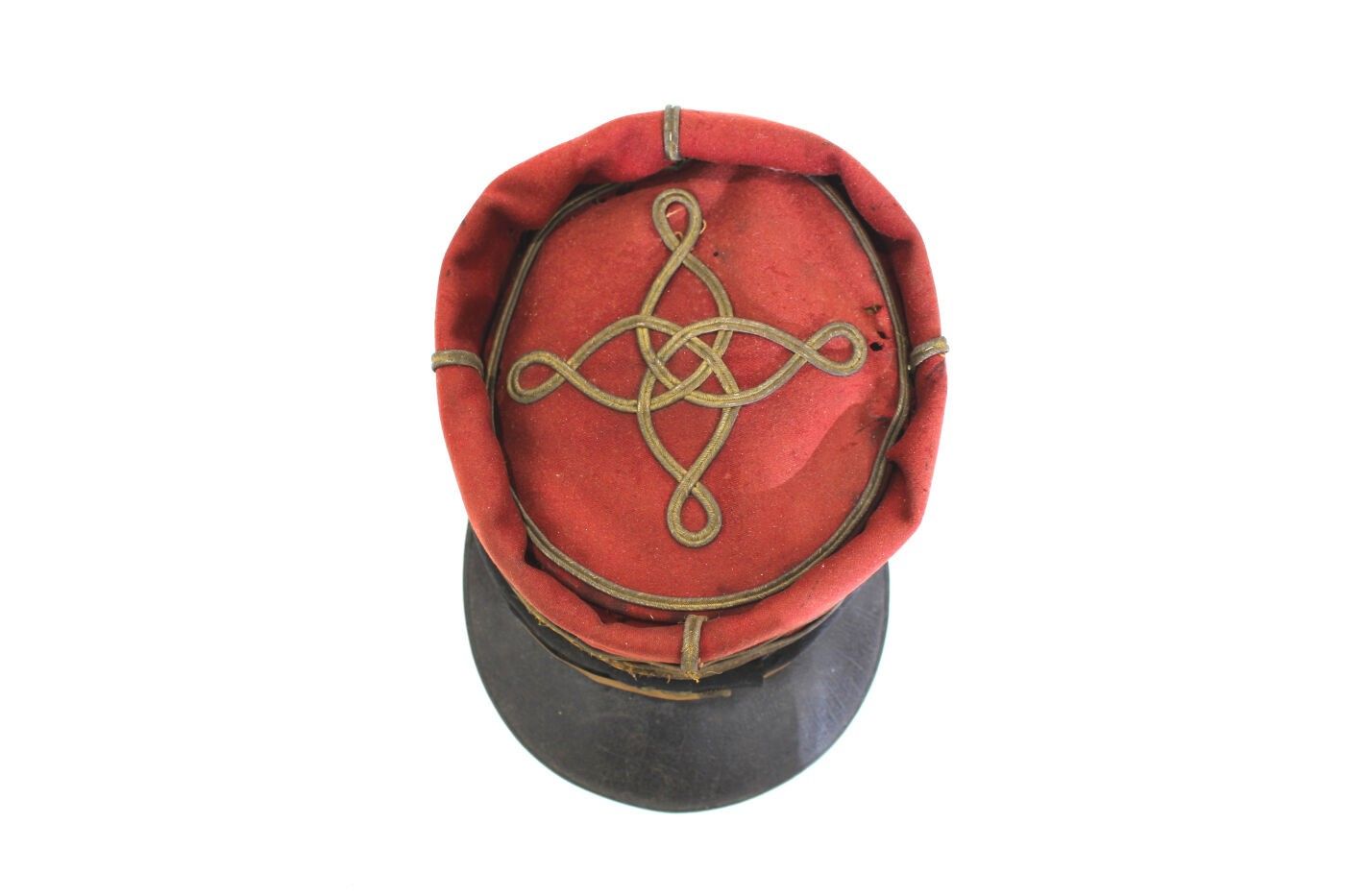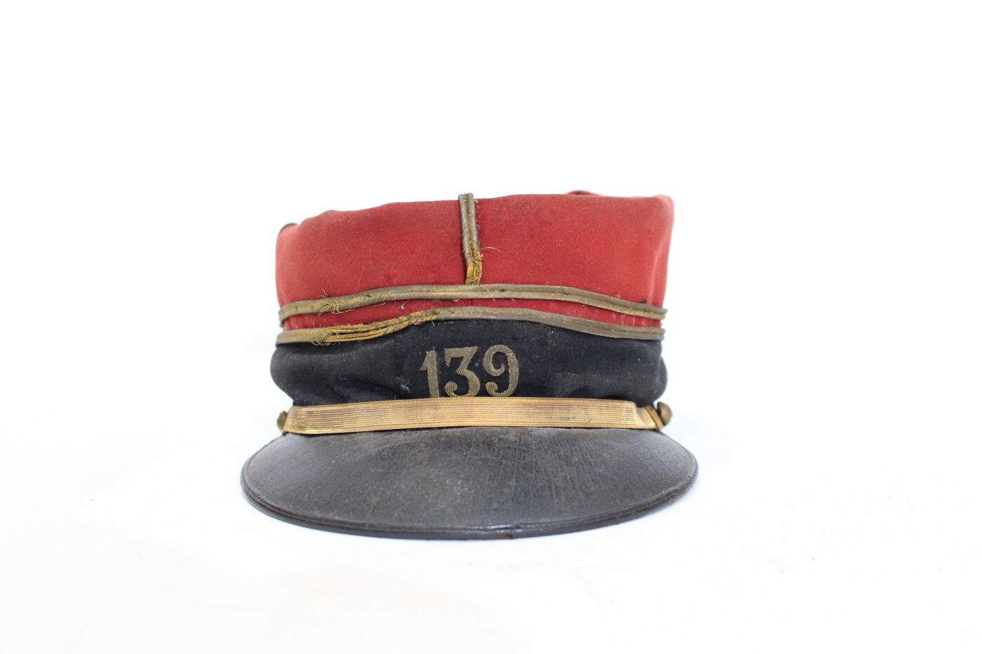Lieutenant's kepi of the 139th RI circa 1910-1914. Scarlet cloth, black headband, 139 gold stitched insignia, gold braid and false chinstrap, flaming grenade buttons, dark mustard sateen interior, green underside of visor. ABE