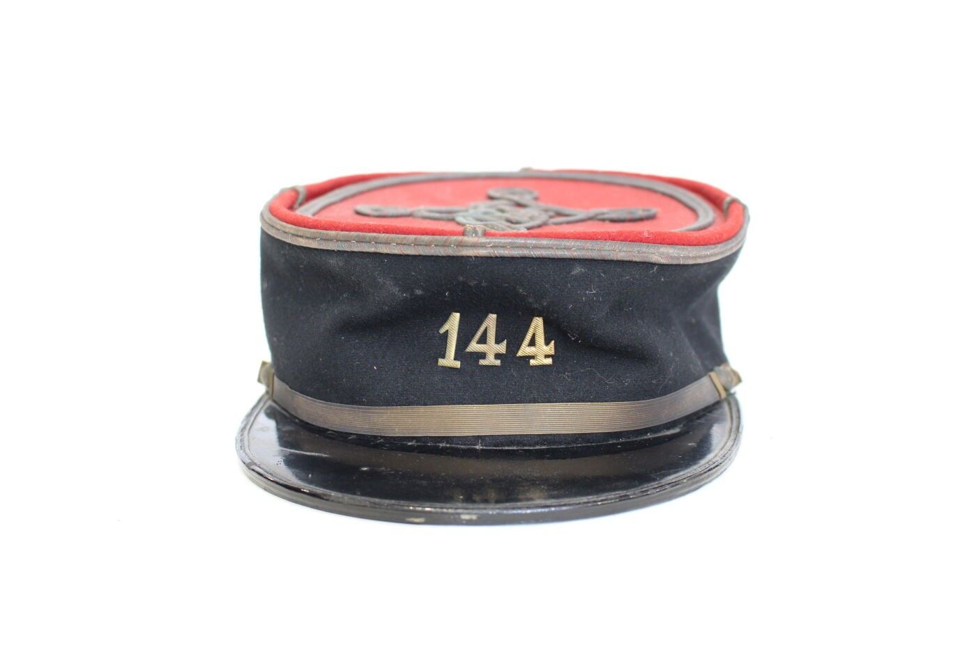 Warrant Officer's kepi of the 144th RI circa 1917-1918. Scarlet cloth, black headband, gold 144 metal badge, silver cord with red chevrons, gold false chinstrap, flaming grenade buttons, yellow sateen interior. ABE
