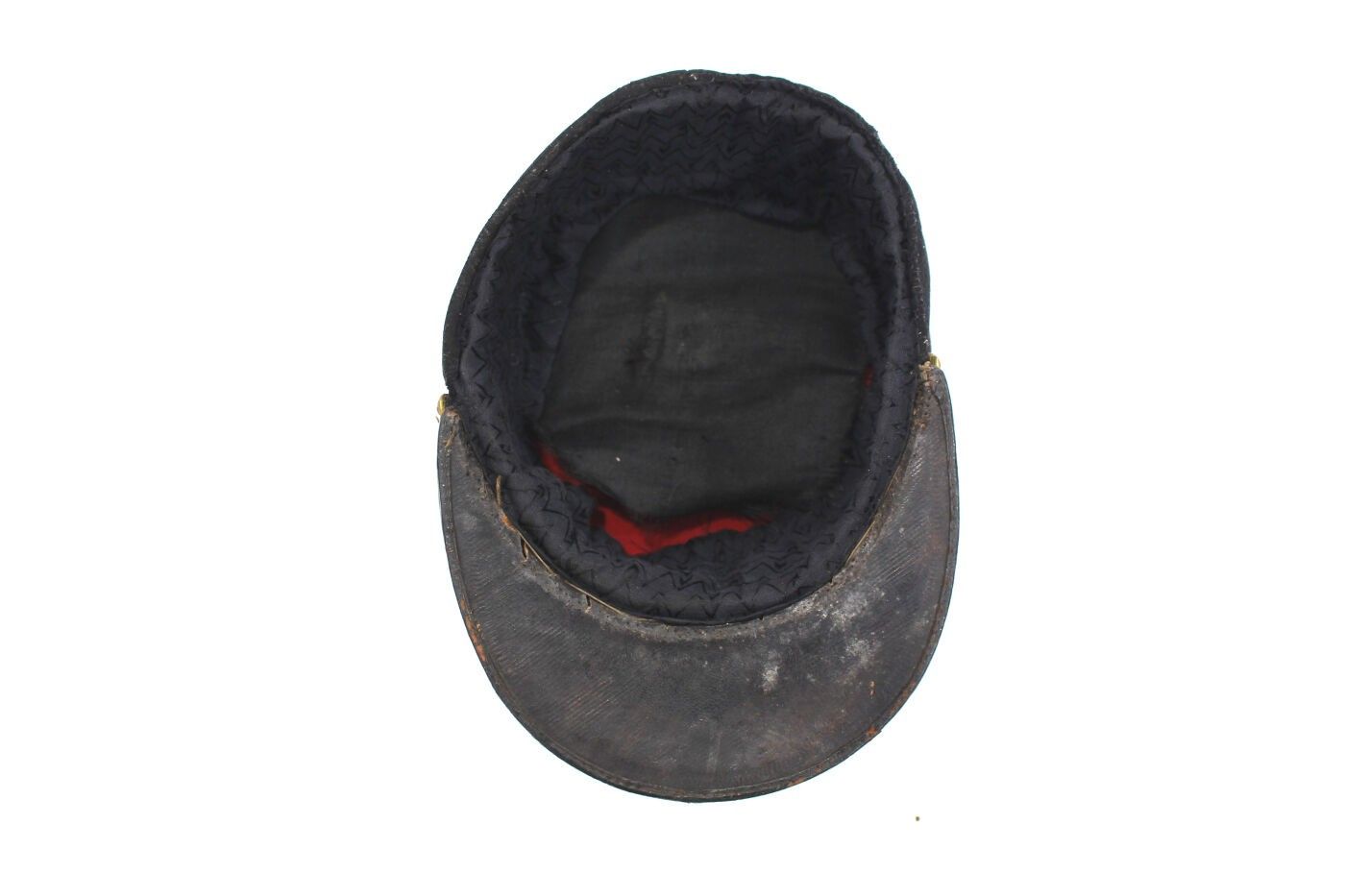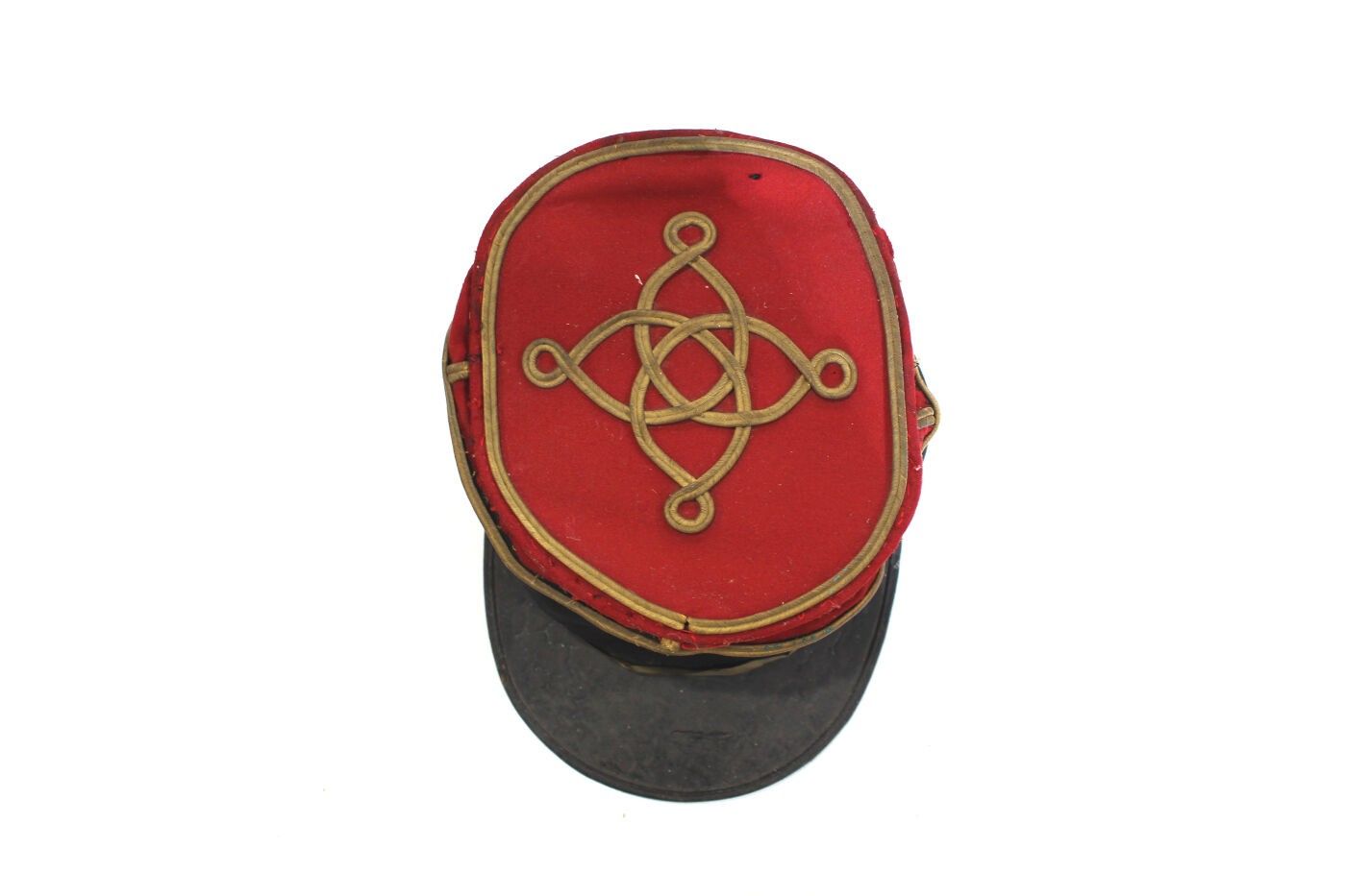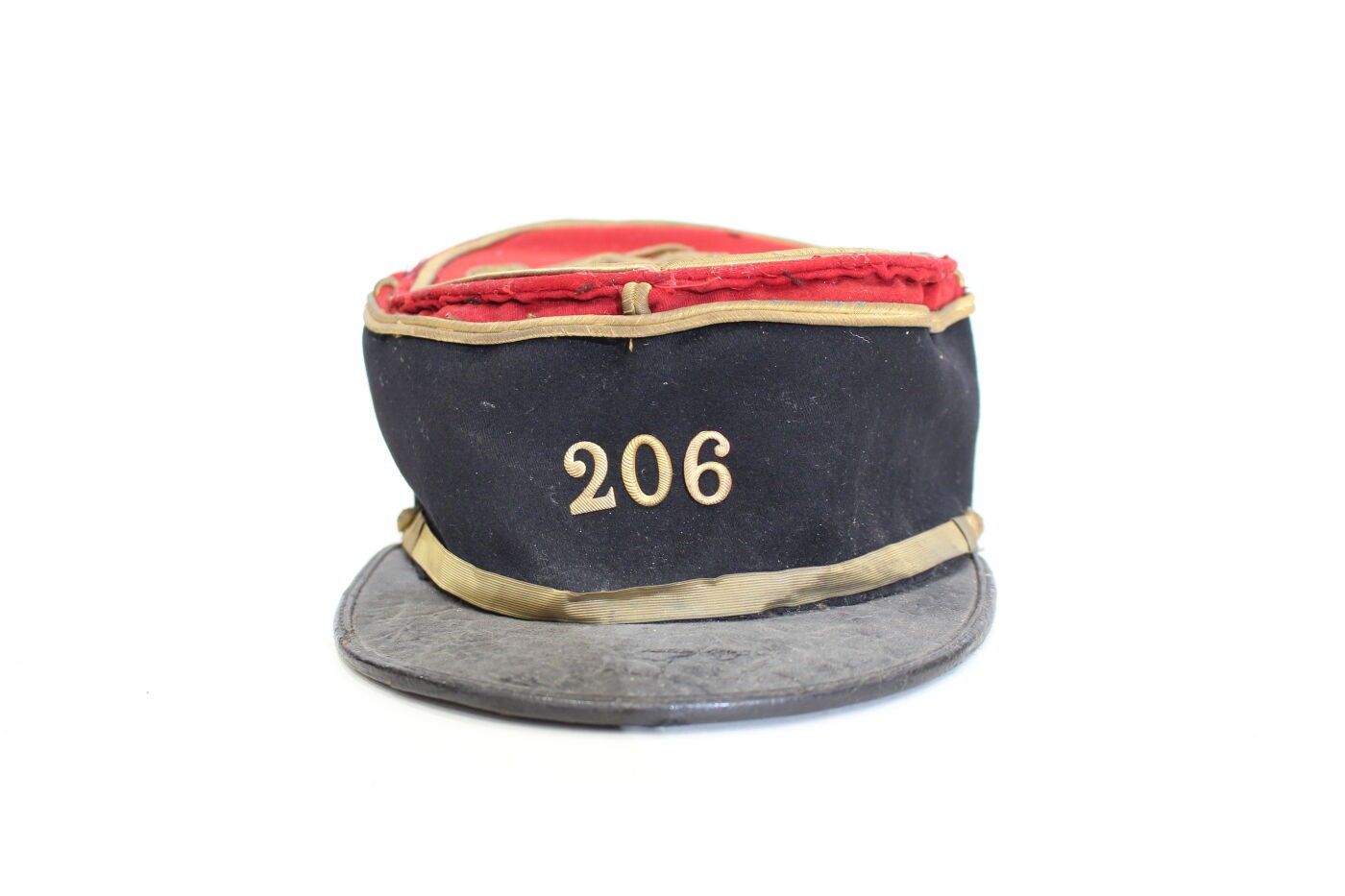 Second lieutenant's kepi of the 206th RI circa 1917-1918. Scarlet cloth, black headband, 206 gold metal badge, gold braid and chinstrap, flaming grenade buttons, black sateen interior. ABE. Moth holes.