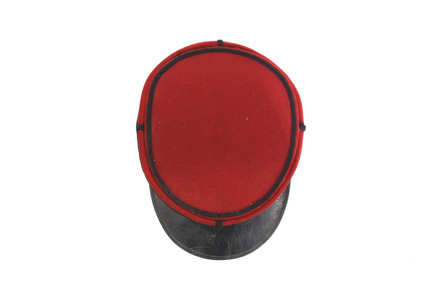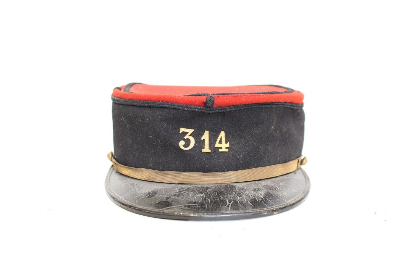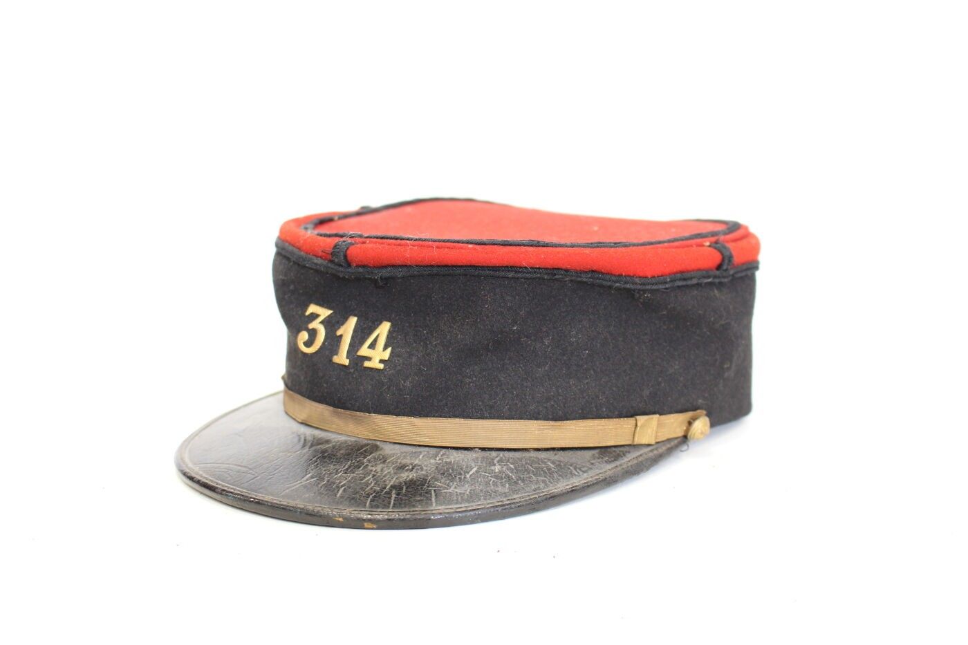 NCO kepi of the 314th RI (reservists of the 114th RI) circa 1918-1920. Scarlet cloth, black headband, gold 314 metal badge, black cords, gold false chinstrap, flaming grenade buttons, black sateen interior. FAIR CONDITION