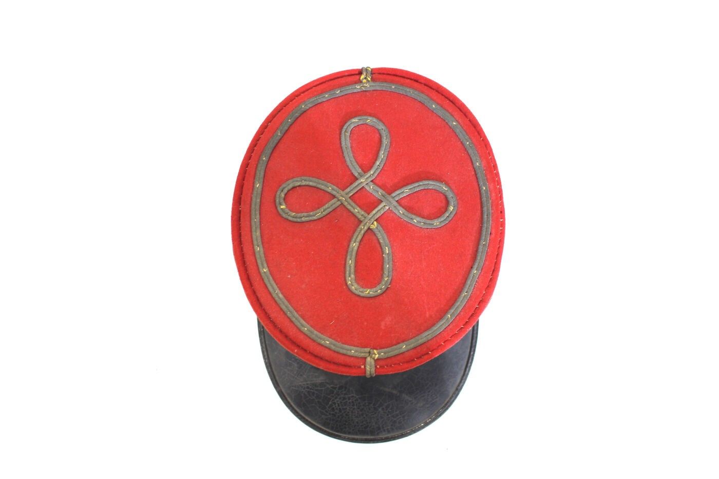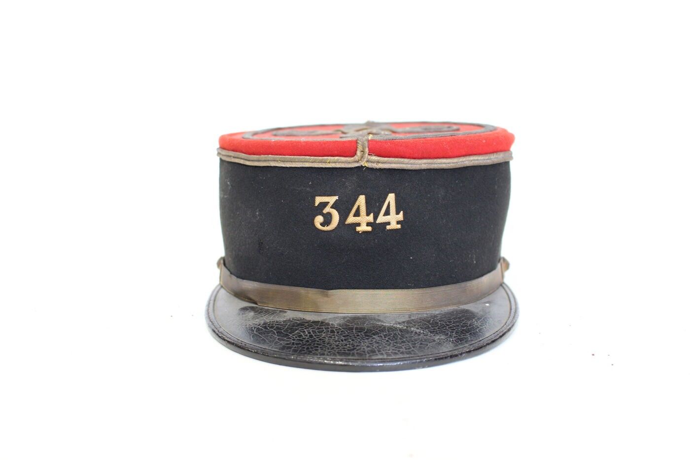 Second lieutenant's kepi of the 344th RI circa 1917-1918. Scarlet cloth, black headband, 344 gold metal badge, gold braid and chinstrap, flaming grenade buttons, black sateen interior. FAIR CONDITION