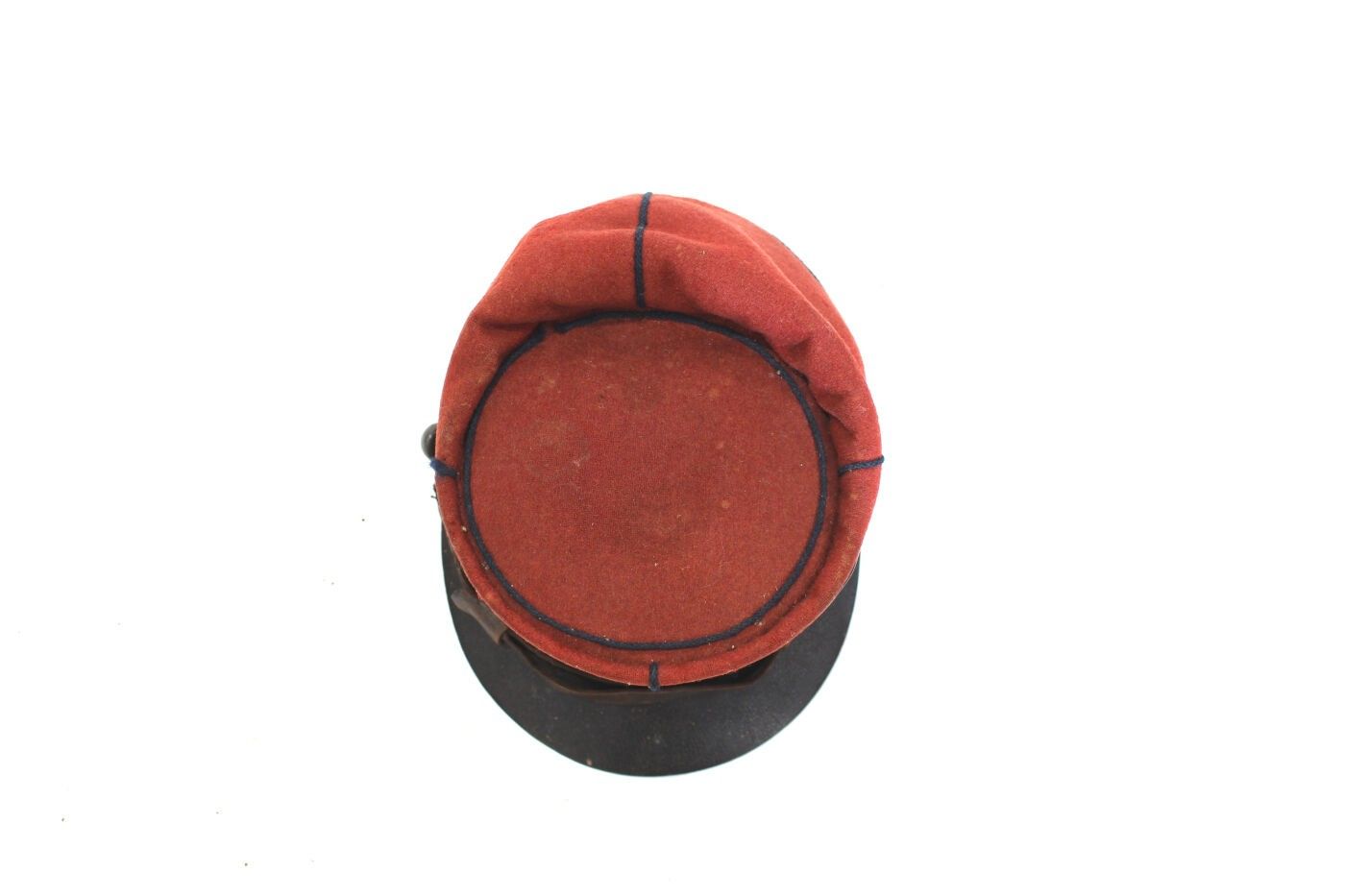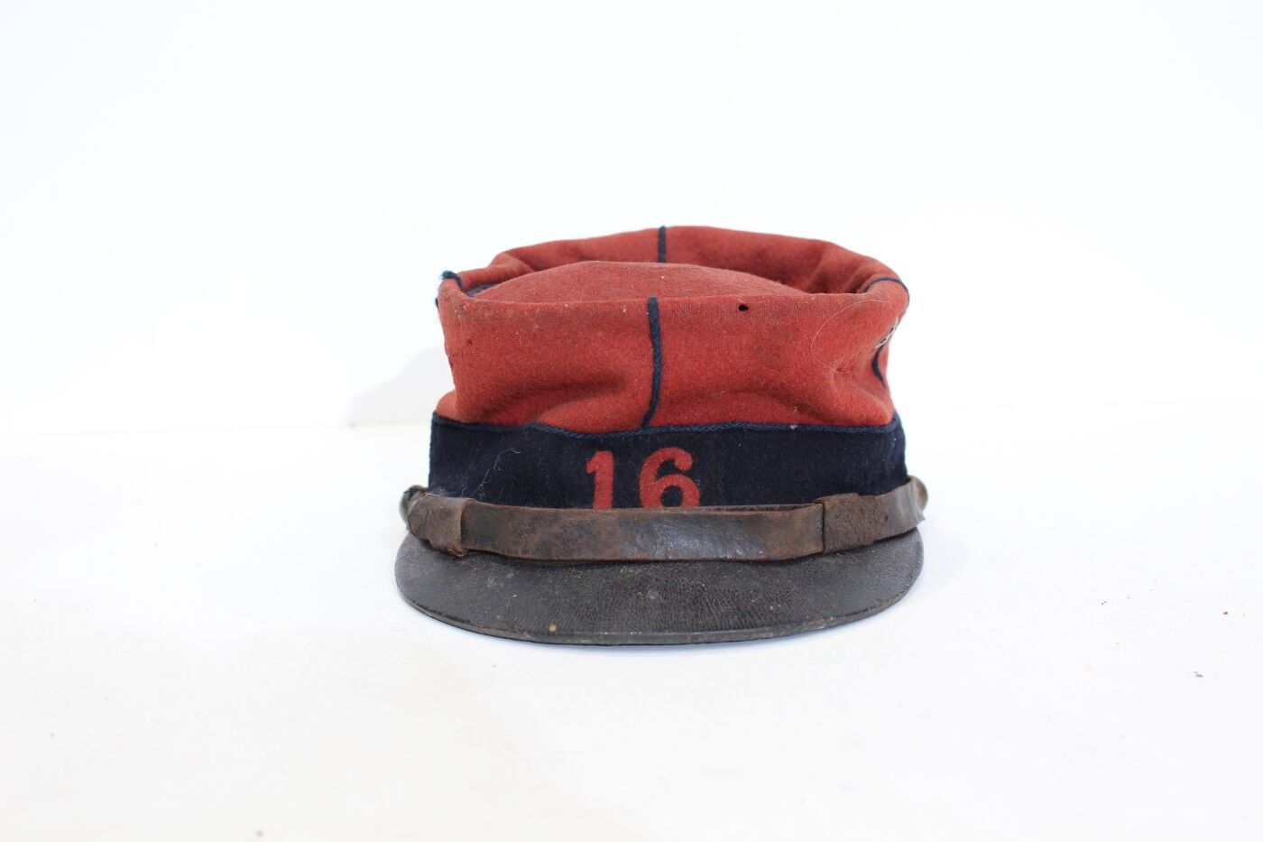 Troop kepi model 1884 of the 16th regiment of dragoons, silver buttons. Scarlet cloth, navy blue headband, scarlet 16 sewn badge, navy blue cords, leather false chinstrap, smooth buttons, vents, black basane interior. ABE, mould.