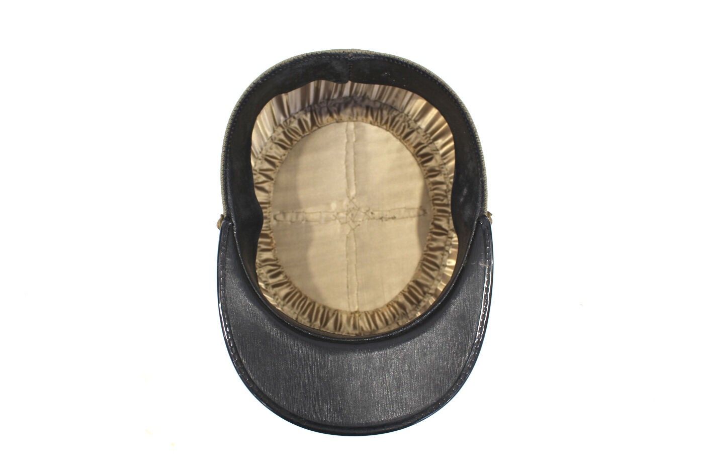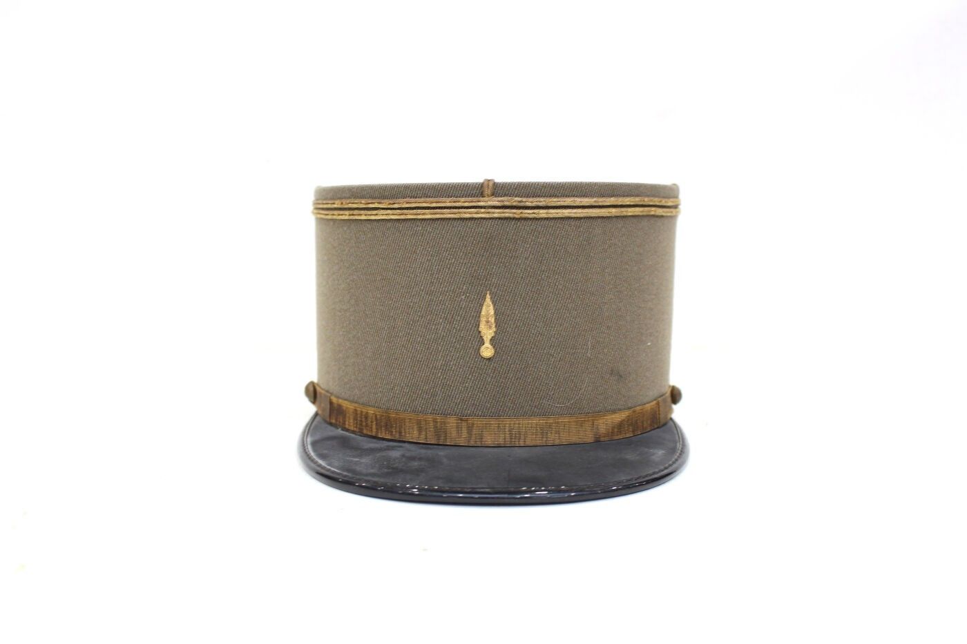 Army lieutenant's kepi circa 1945-1950. In khaki cloth, gold metallic badge with flaming grenade, gold braid and false chinstrap, beige sateen interior. FAIR CONDITION