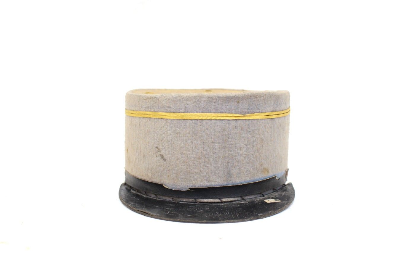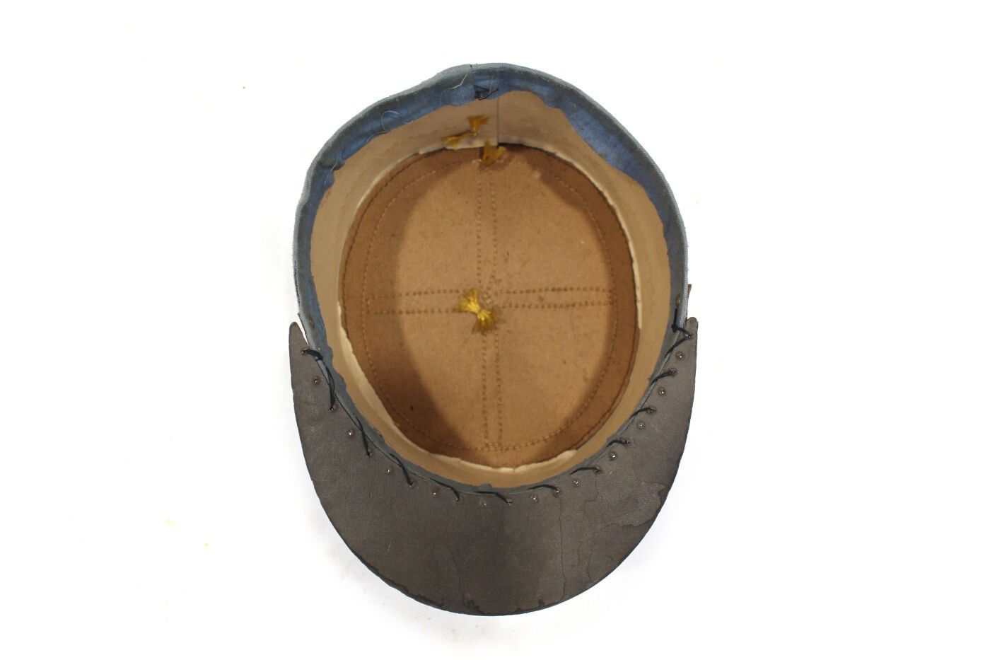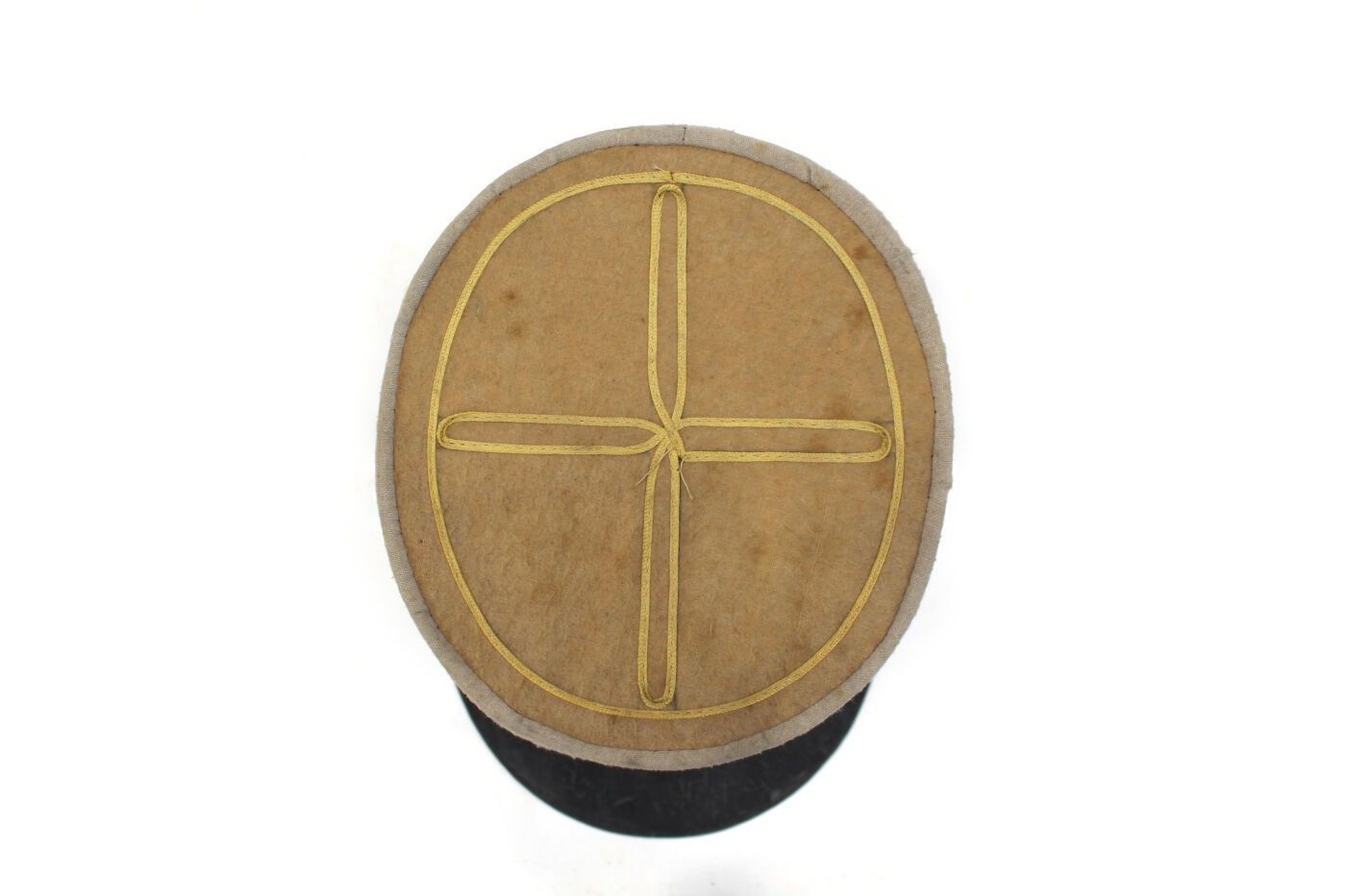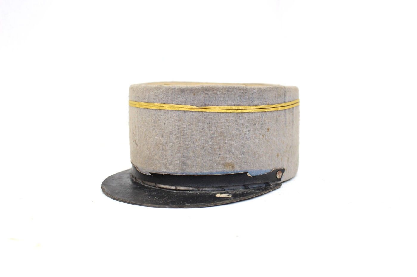 Lieutenant's kepi circa 1930-1940. Beige cloth, grey headband, yellow braiding, black chinstrap, no interior, visor seam visible. ABE