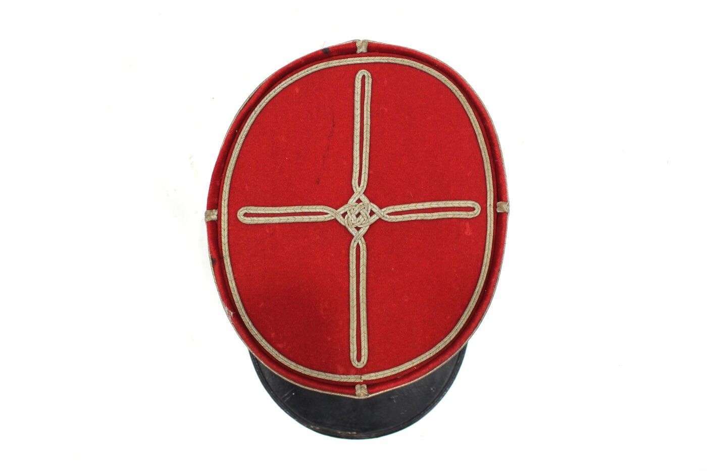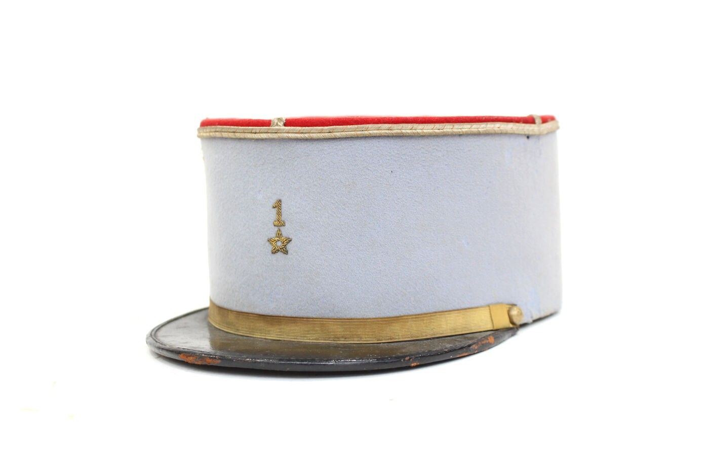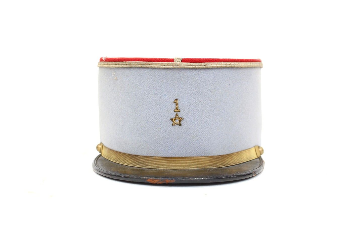 Warrant officer's kepi, 1st RTM, circa 1945-1950. In scarlet cloth, sky blue headband, gold sewn badge with star numbered 1, silver braid with gold chevrons, gold false chinstrap, smooth buttons, sky blue sateen interior. FAIR CONDITION