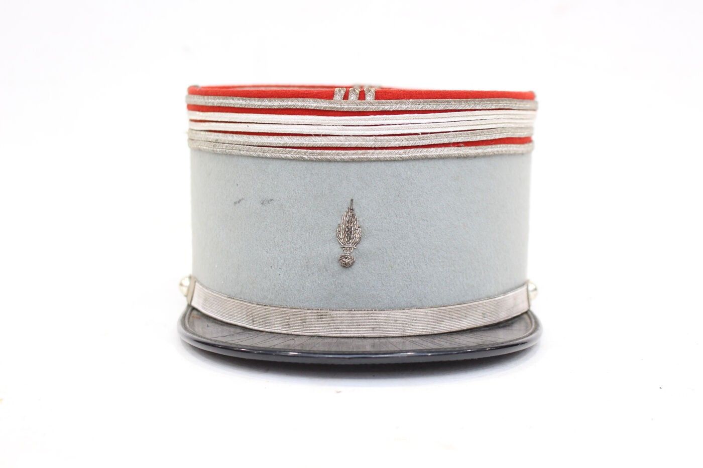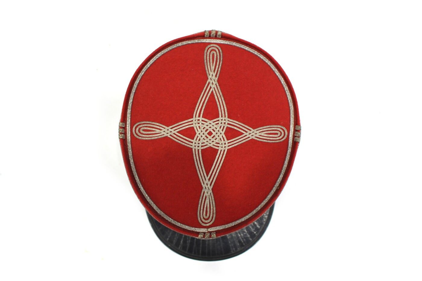 Light cavalry colonel's kepi, hussars or chasseurs à cheval, circa 1960. Scarlet cloth, sky blue headband, silver stitched badge with flaming grenade, silver and white braid, silver false chinstrap, smooth buttons, brown sateen interior. ABE