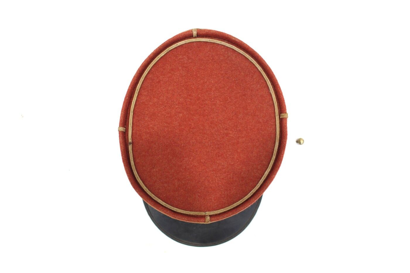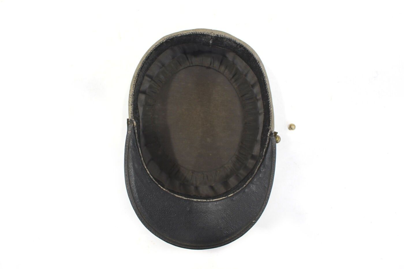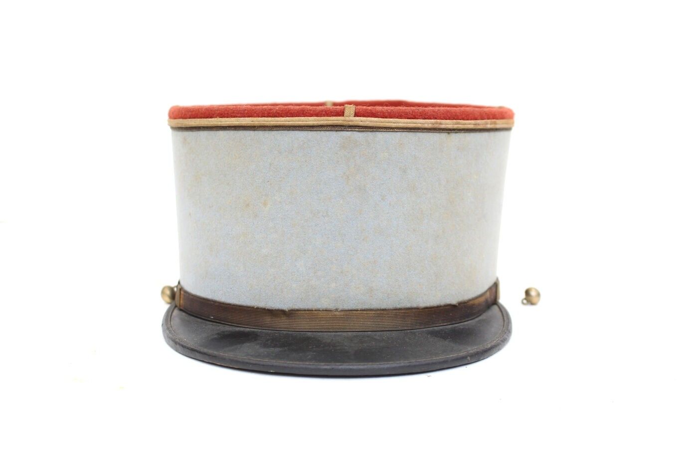 Light cavalry kepi circa 1945-1950. Scarlet cloth, sky blue headband, no insignia, white braid, gold false chinstrap, smooth buttons, one button detached, black satinette interior. ABE, the false chinstrap no longer fits.