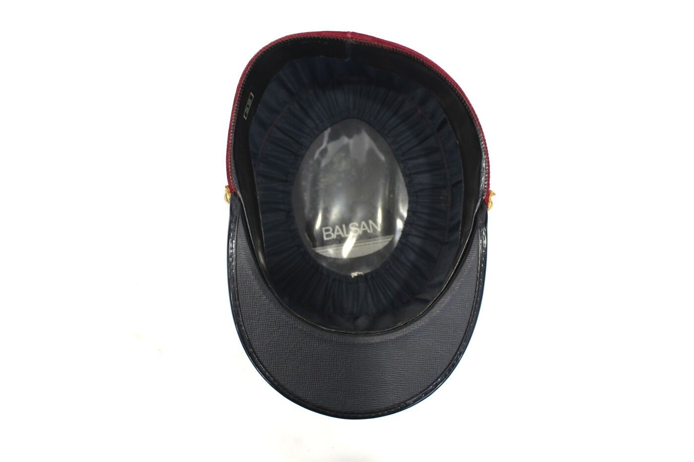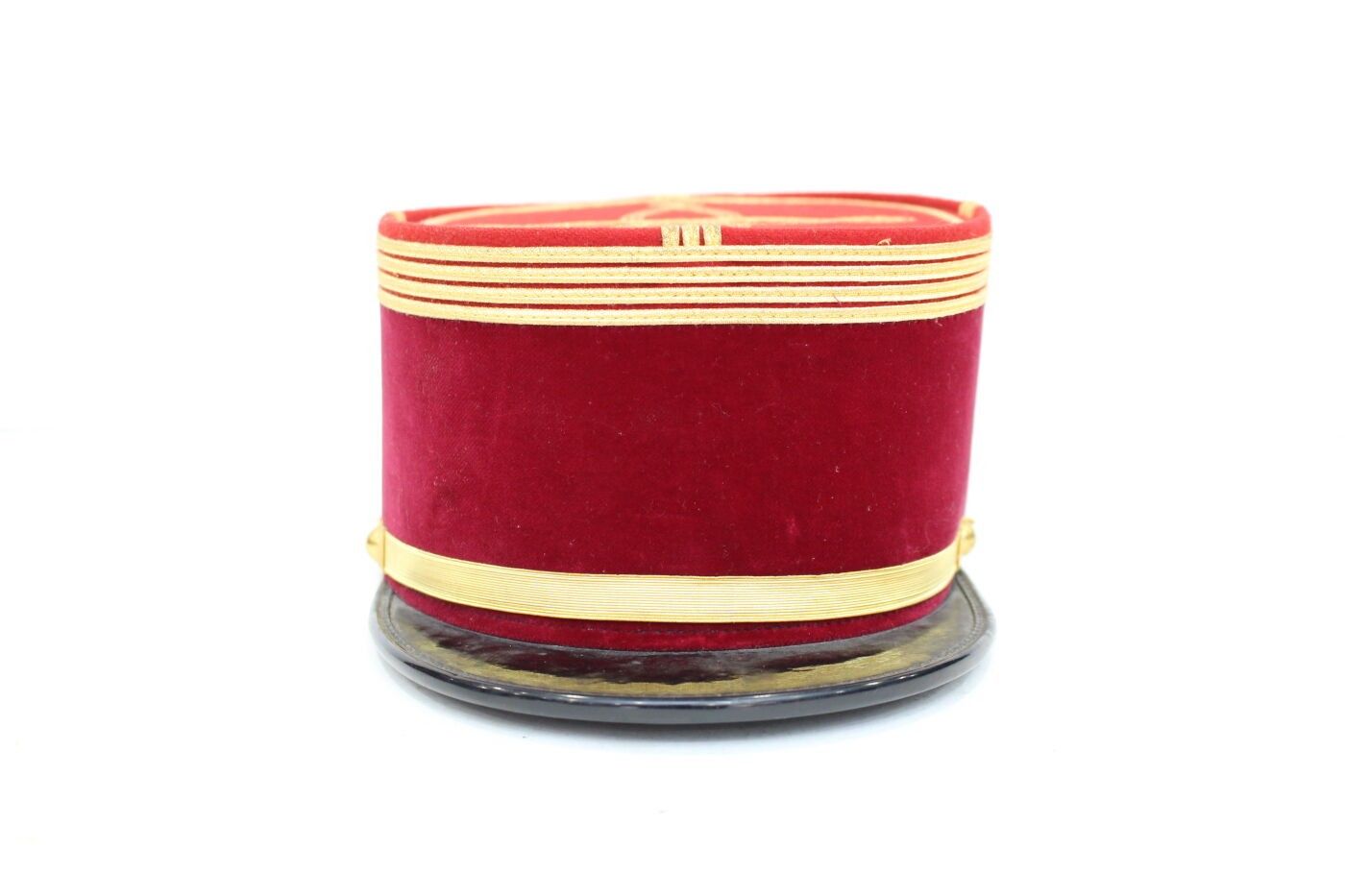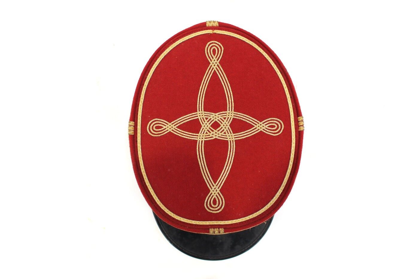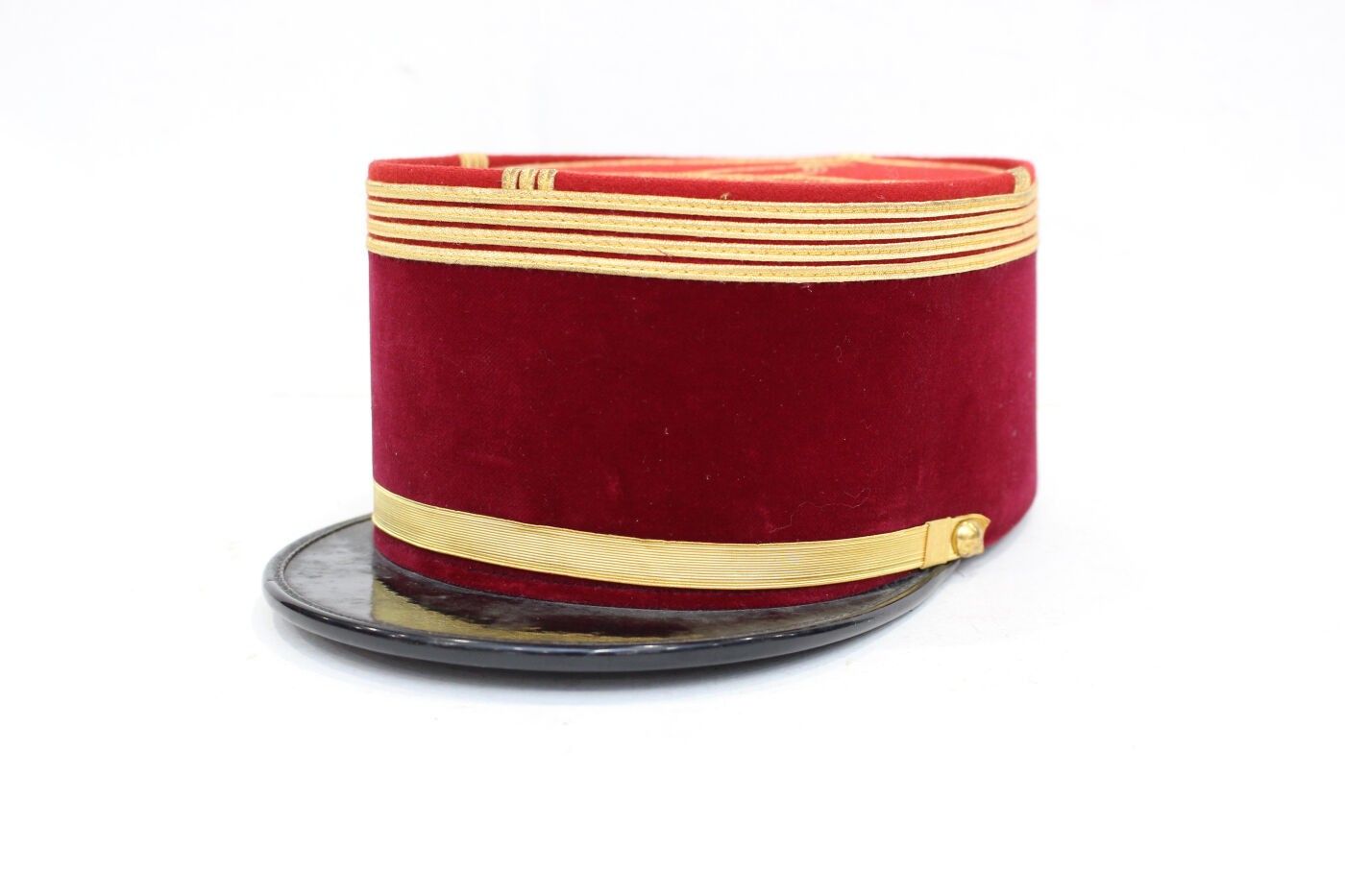 1st class medical officer's kepi, post-1945. Scarlet cloth, burgundy velvet headband, gold braid, gold false chinstrap, smooth buttons, black sateen interior. FAIR CONDITION