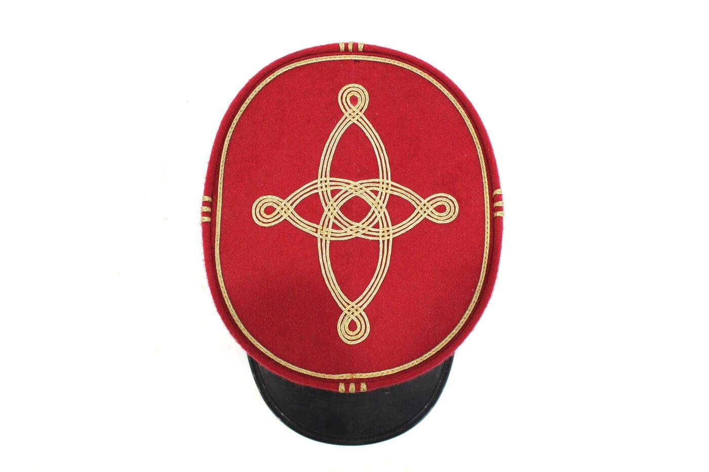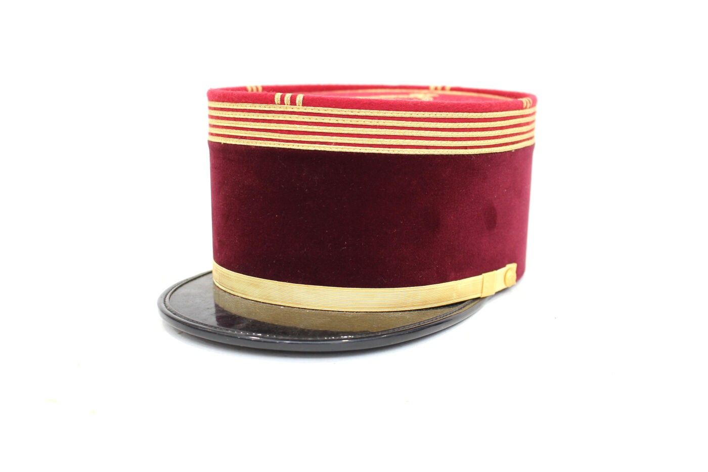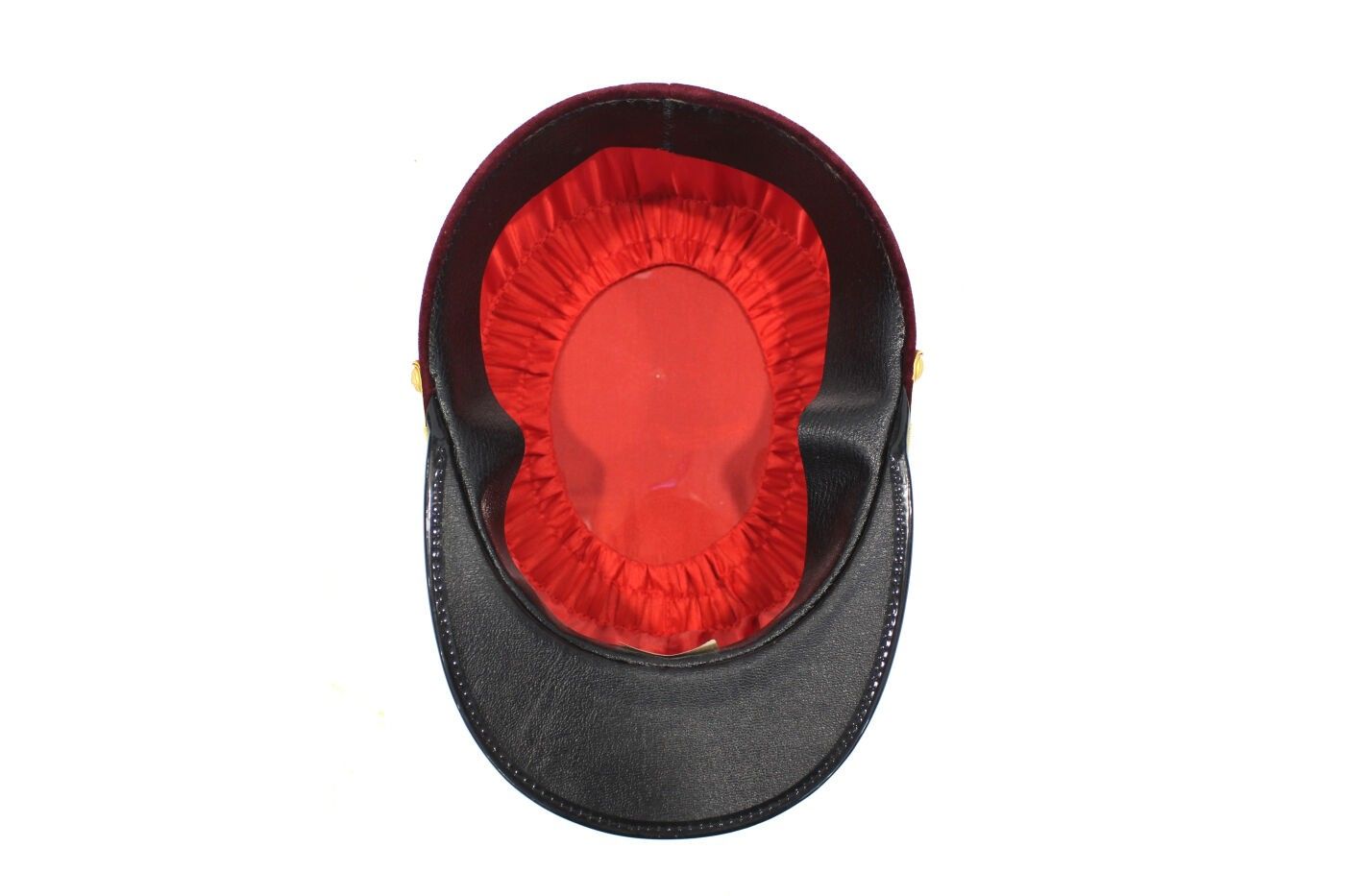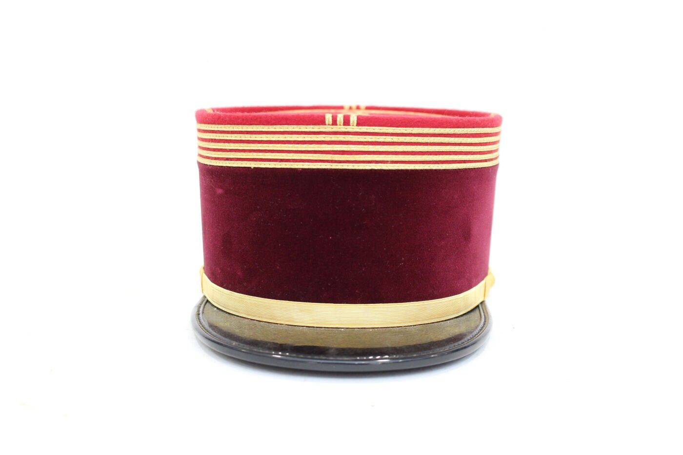 1st class medical officer's kepi, post-1945. Scarlet cloth, burgundy velvet headband, gold braid, gold false chinstrap, red sateen interior. BE