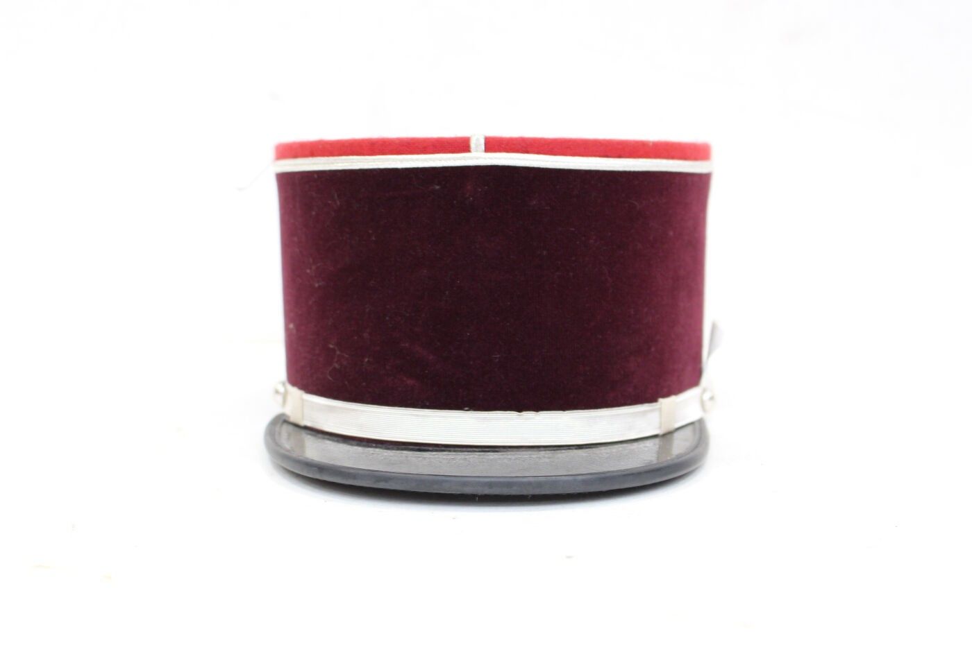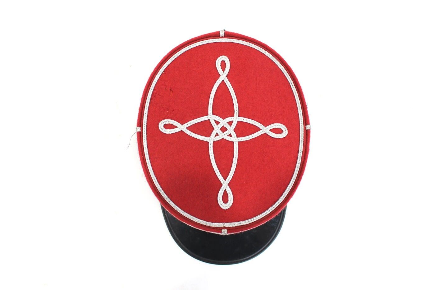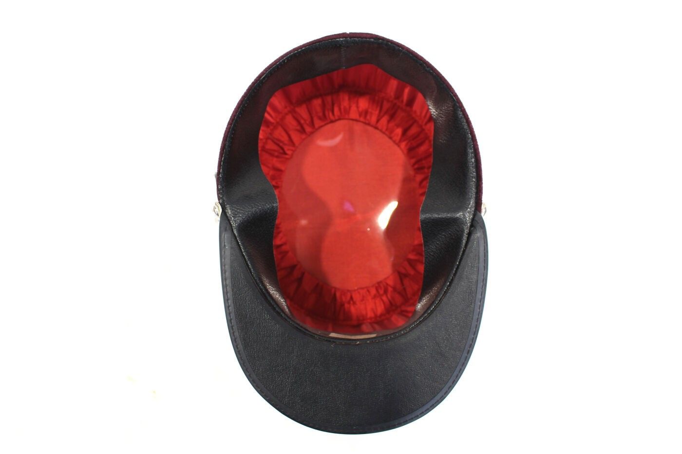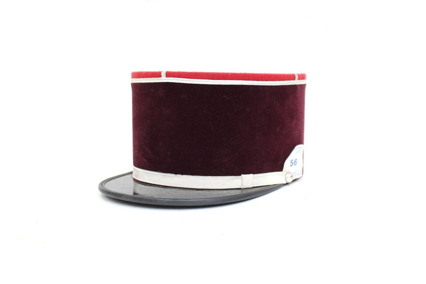 Veterinary assistant major's kepi 2nd class, post 45. Scarlet cloth, purple velvet headband, silver braid, silver false chinstrap, smooth buttons, red sateen interior. BE