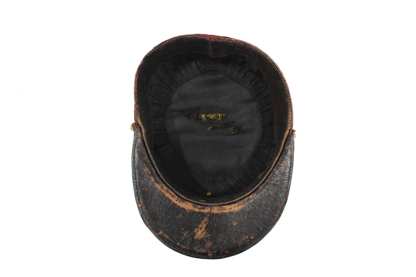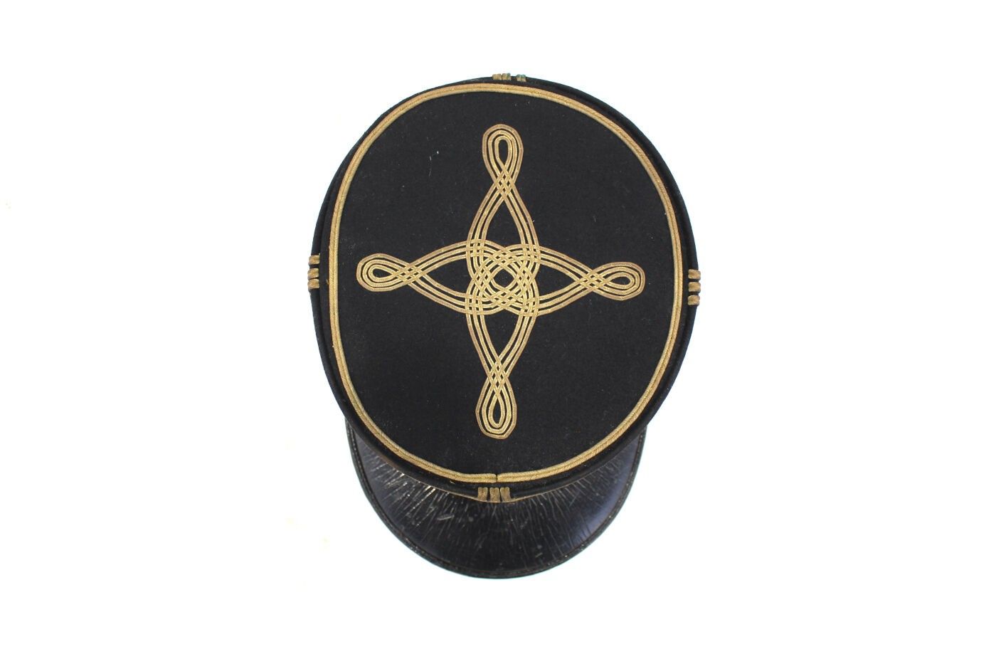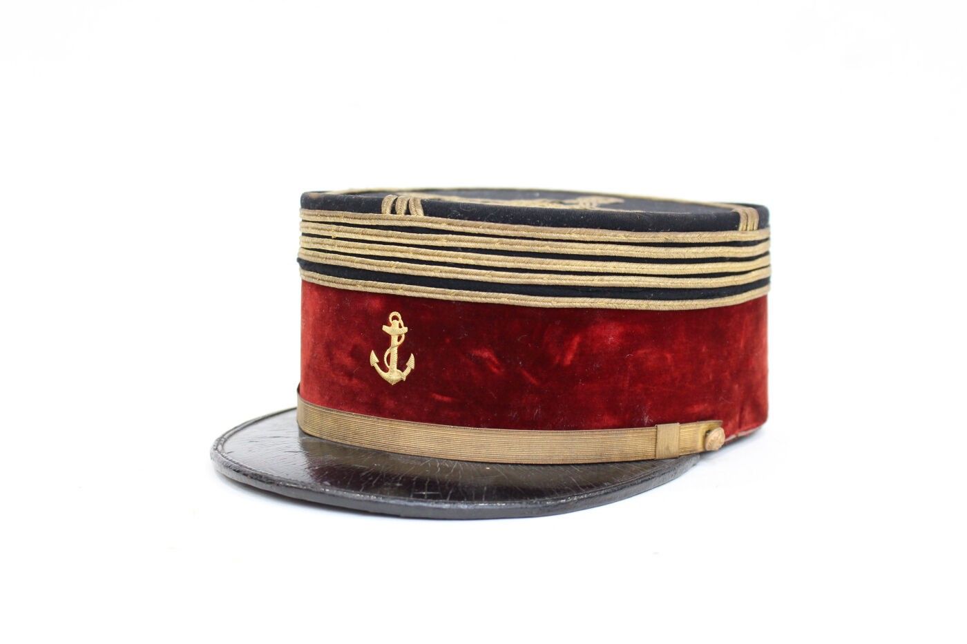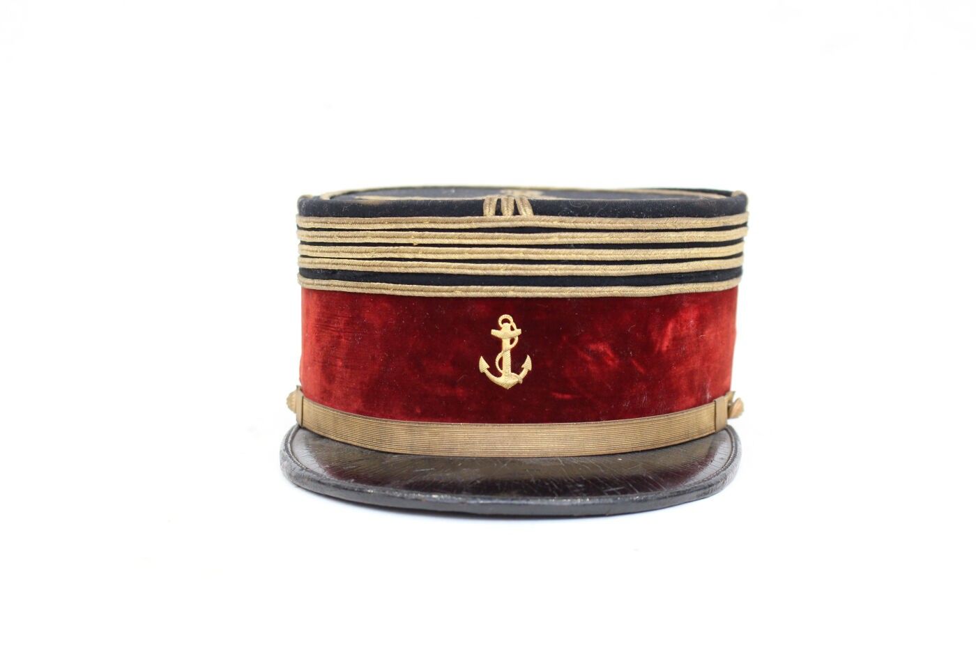 Senior medical officer's kepi for colonial troops, circa 1918-1920. Black cloth, burgundy velvet headband, gilt metal badge with naval anchor, gilt braid and chinstrap, buttons with caduceus surrounded by branches, black satinette interior. ABE