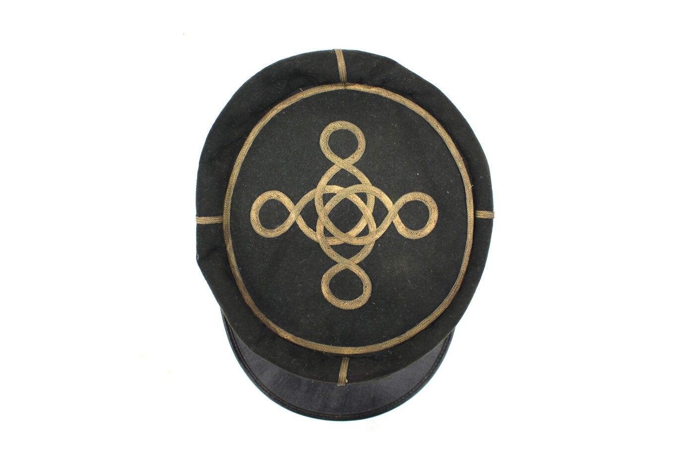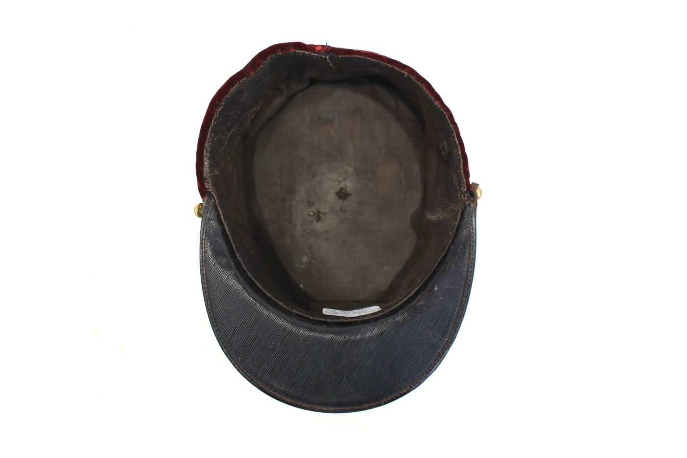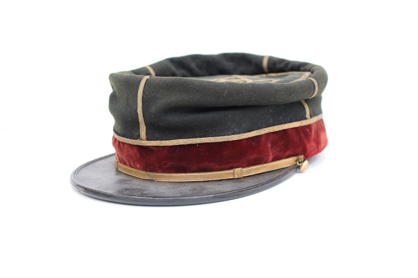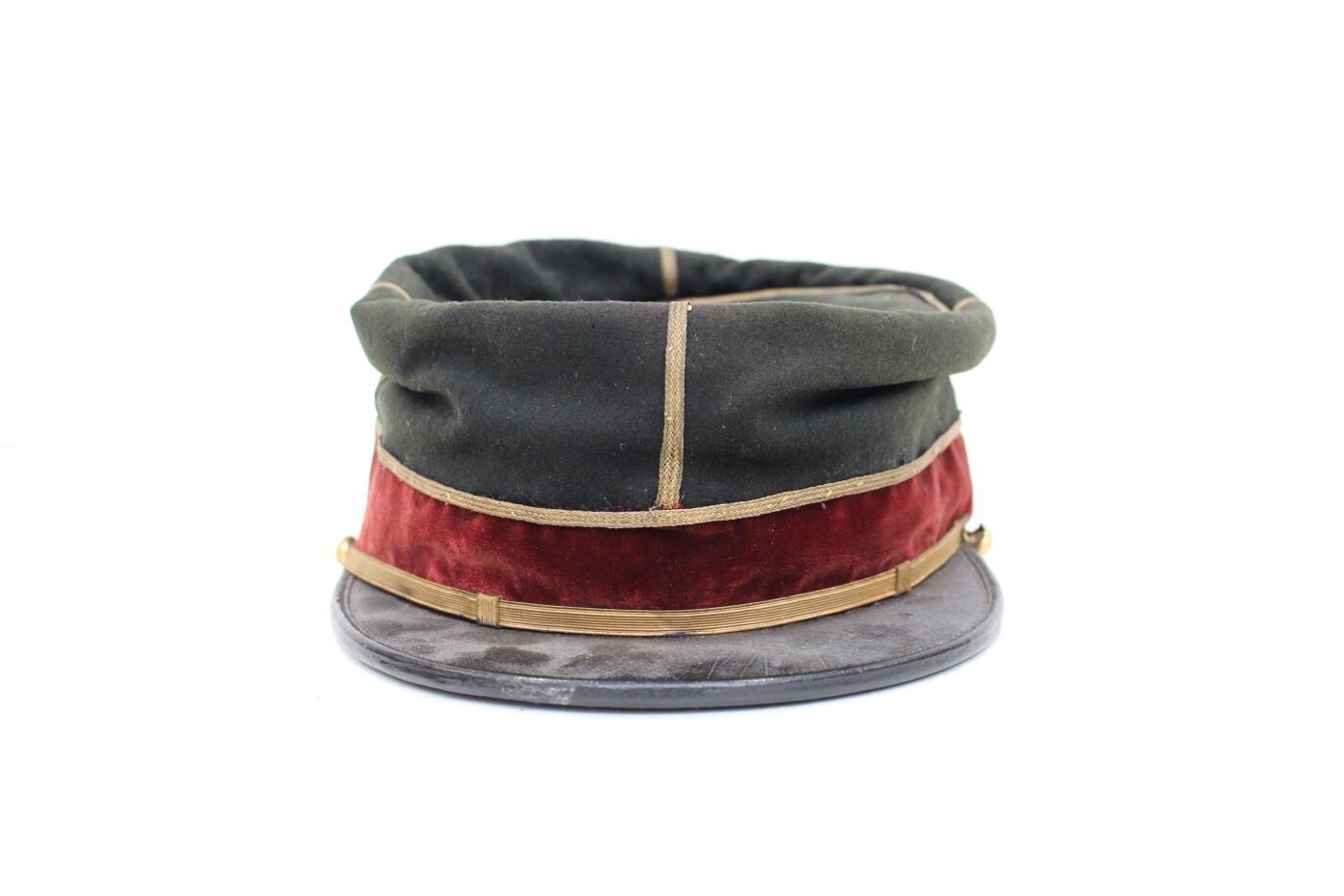 Medical officer's kepi, 2nd class, colonial troops, circa 1900-1910. Black cloth, burgundy velvet headband, gold braid and chinstrap, black sateen interior. ABE