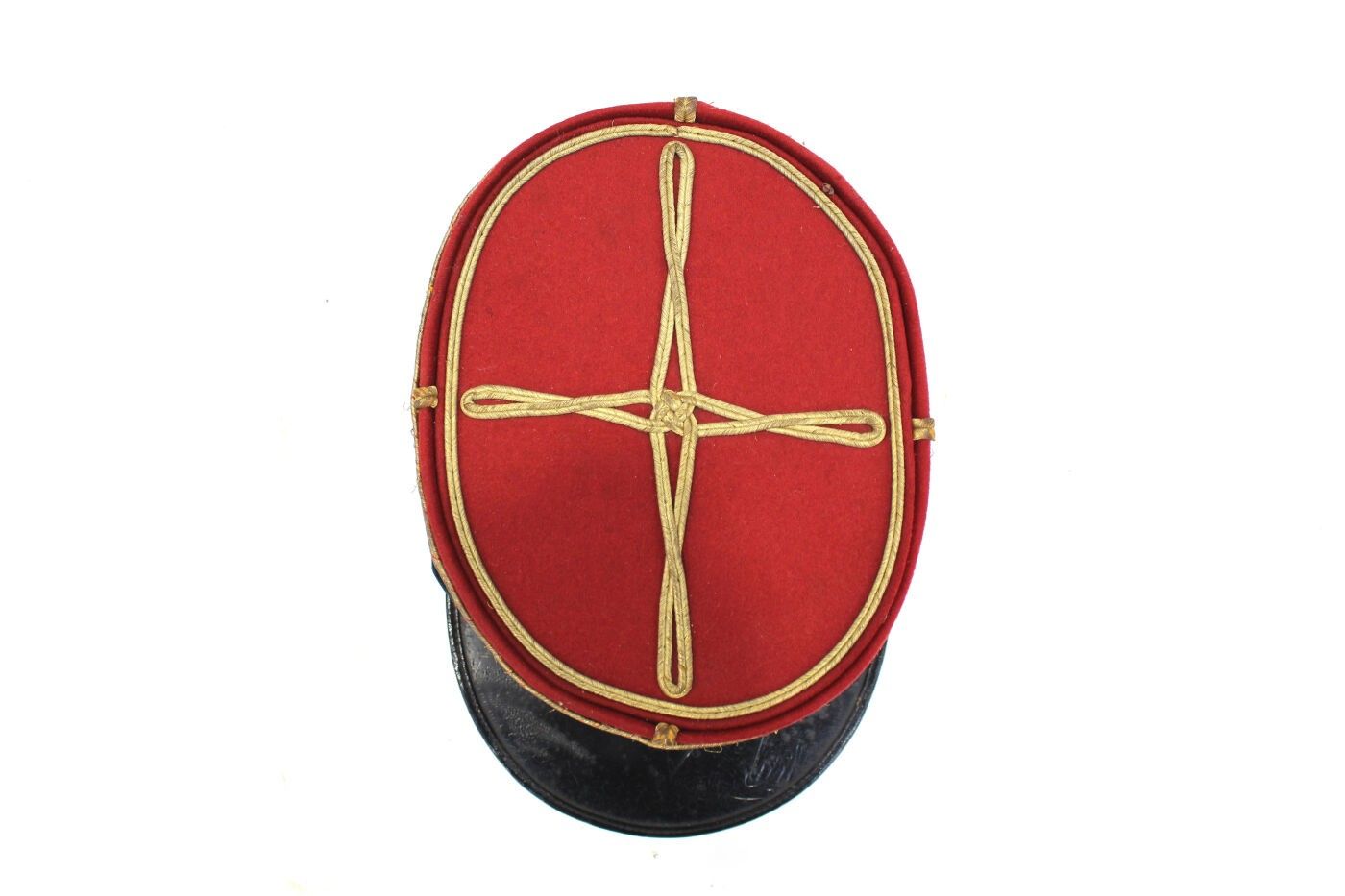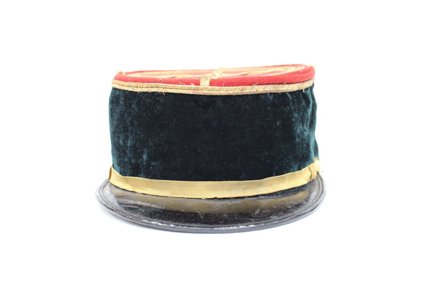 Pharmacist chief warrant officer's kepi circa 1917-1918. Scarlet cloth, dark green velvet headband, gold braid with red chevrons, gold false chinstrap, black sateen interior. ABE