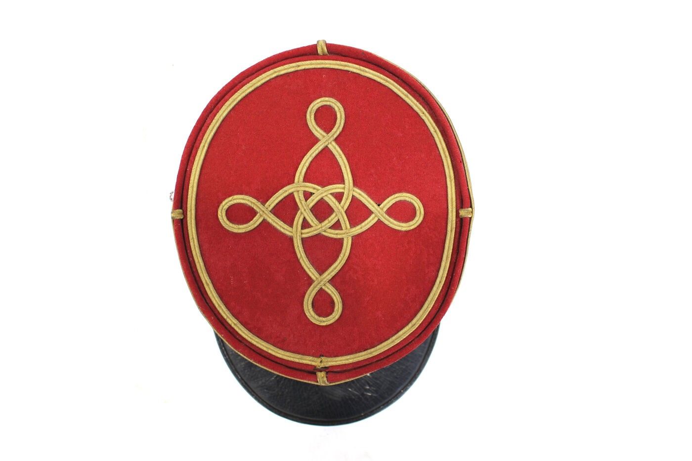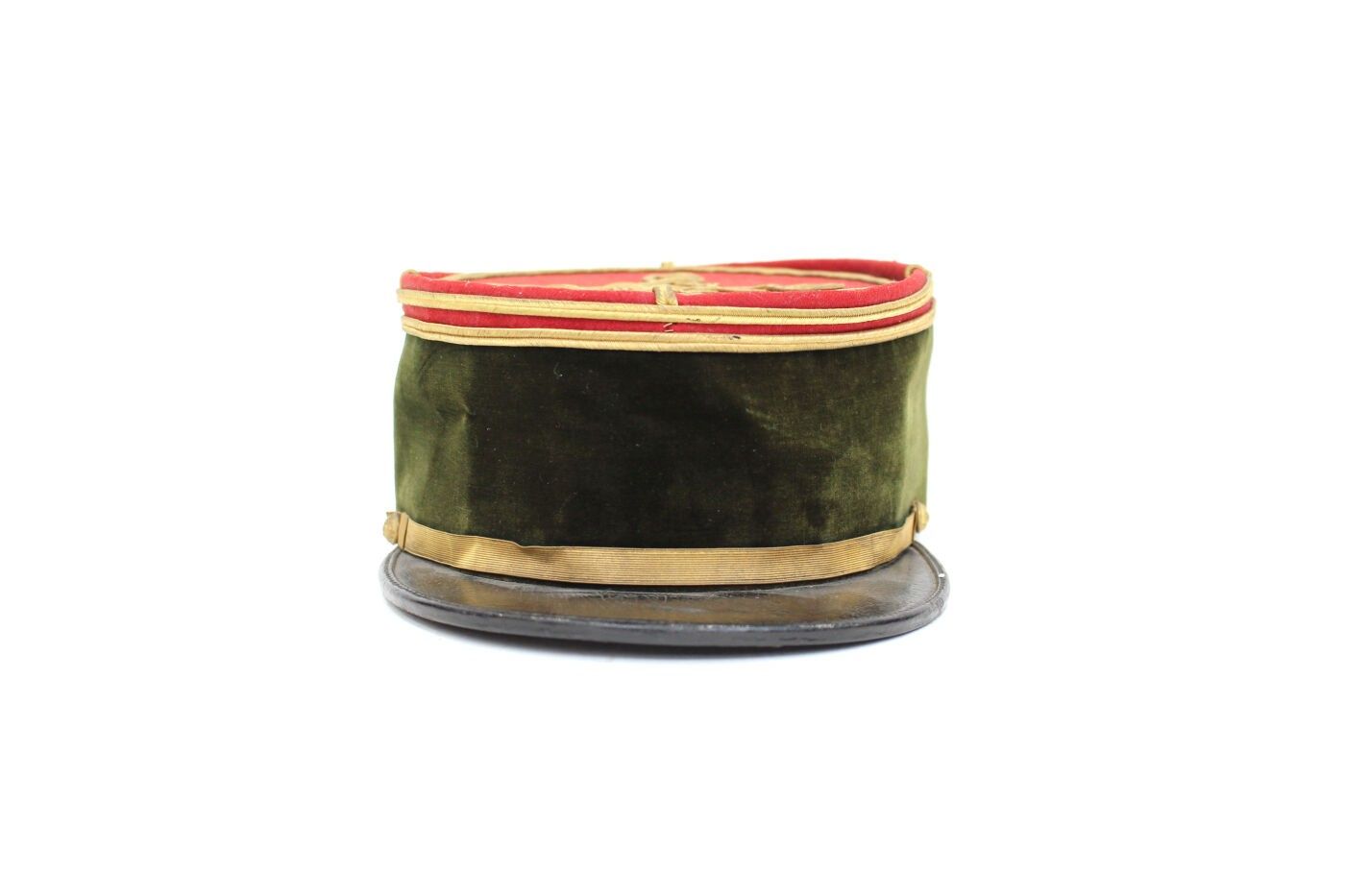 2nd class pharmacist's aide-major kepi circa 1917-1920. Scarlet cloth, green velvet headband, gold braid, gold false chinstrap, buttons with caduceus surrounded by twigs, black satinette interior. ABE