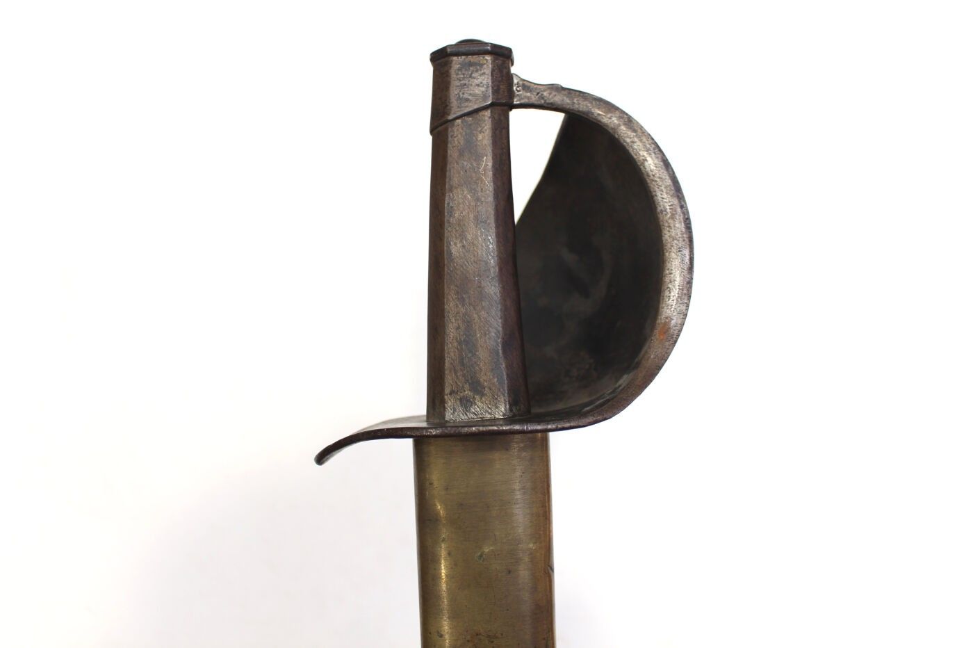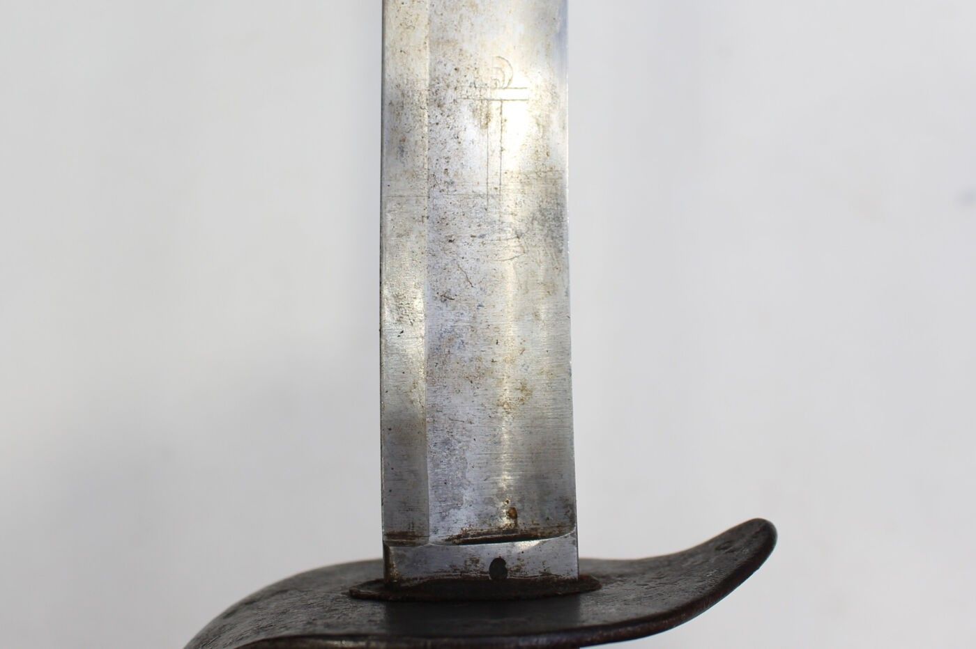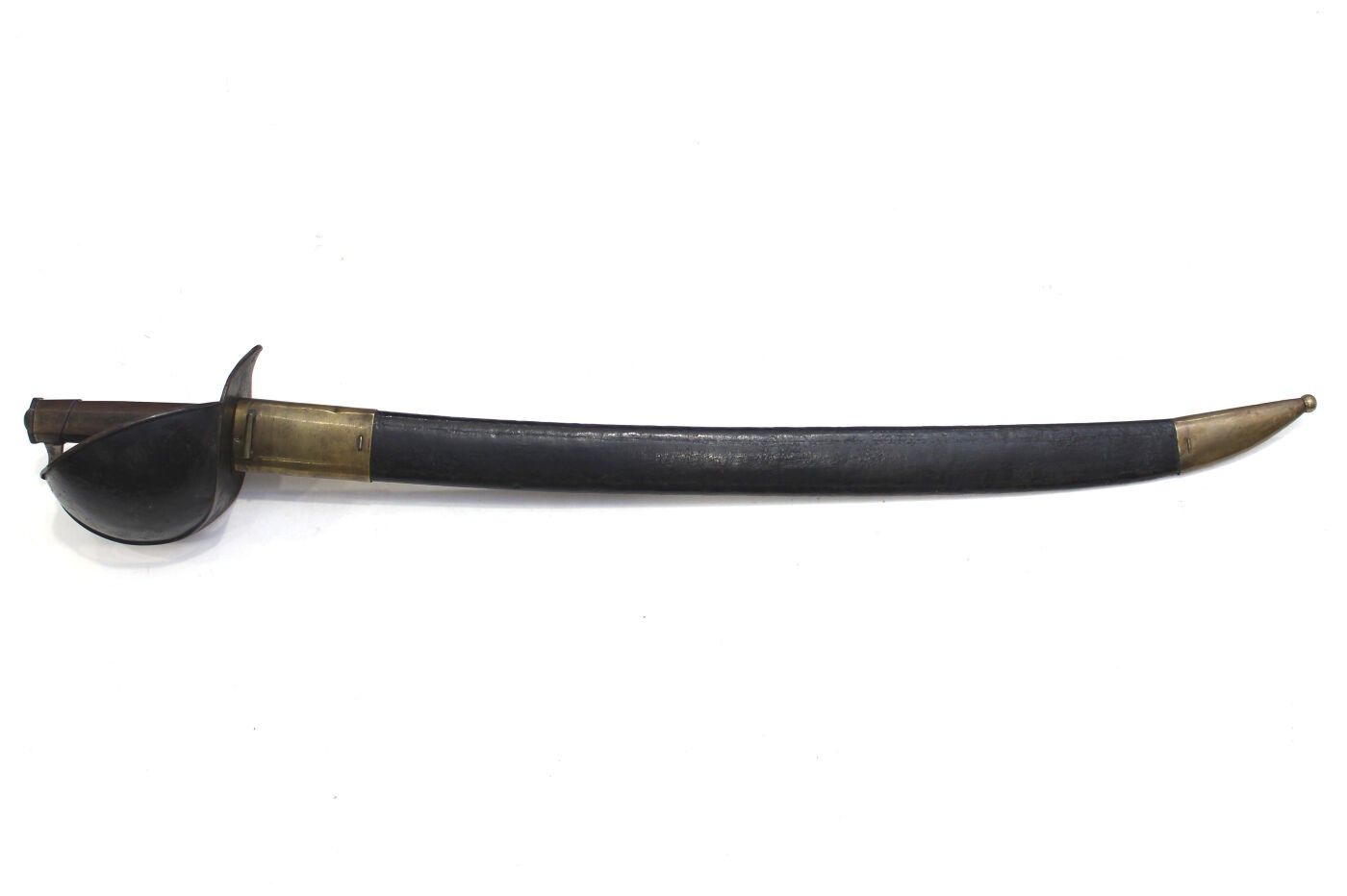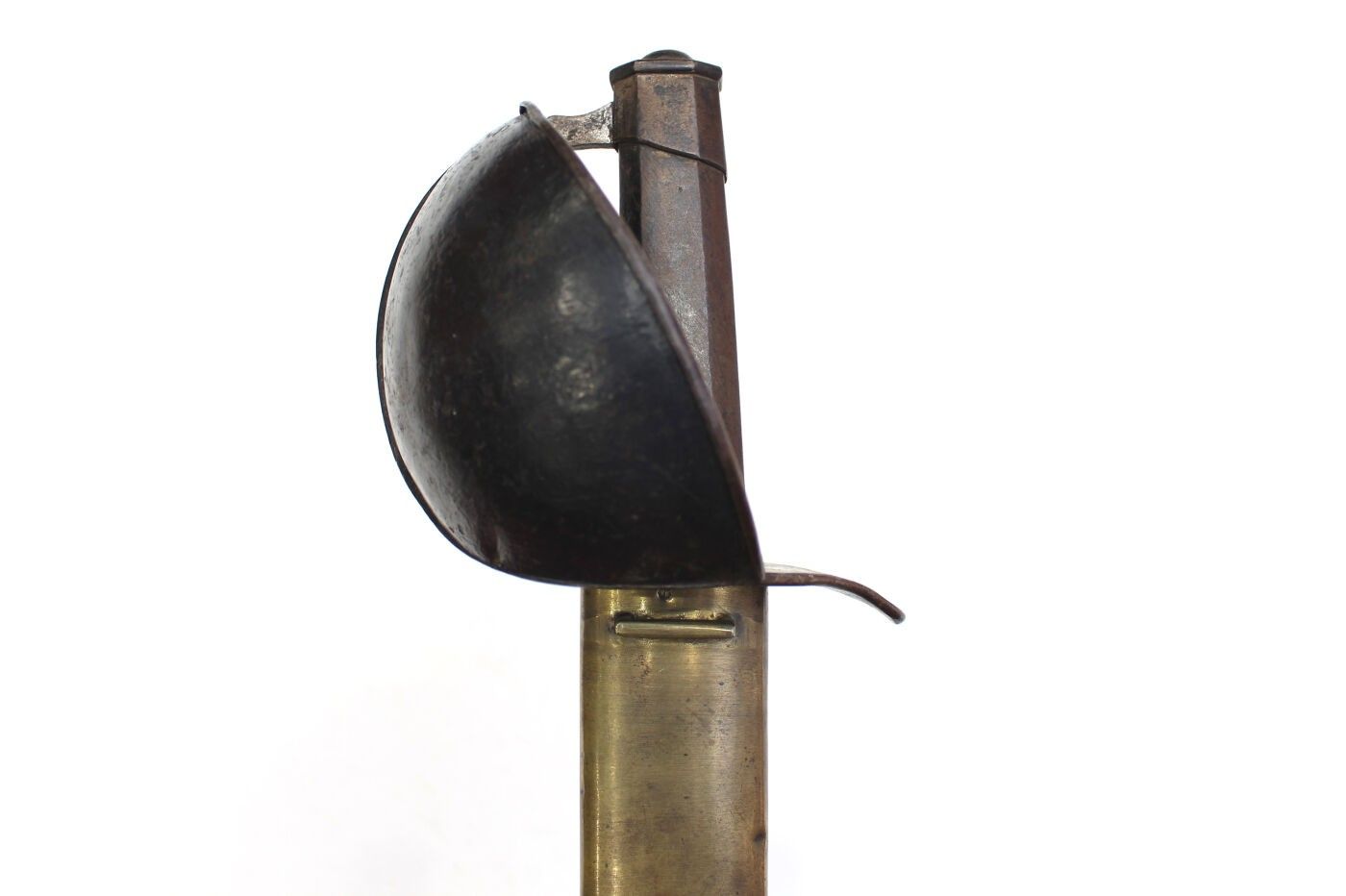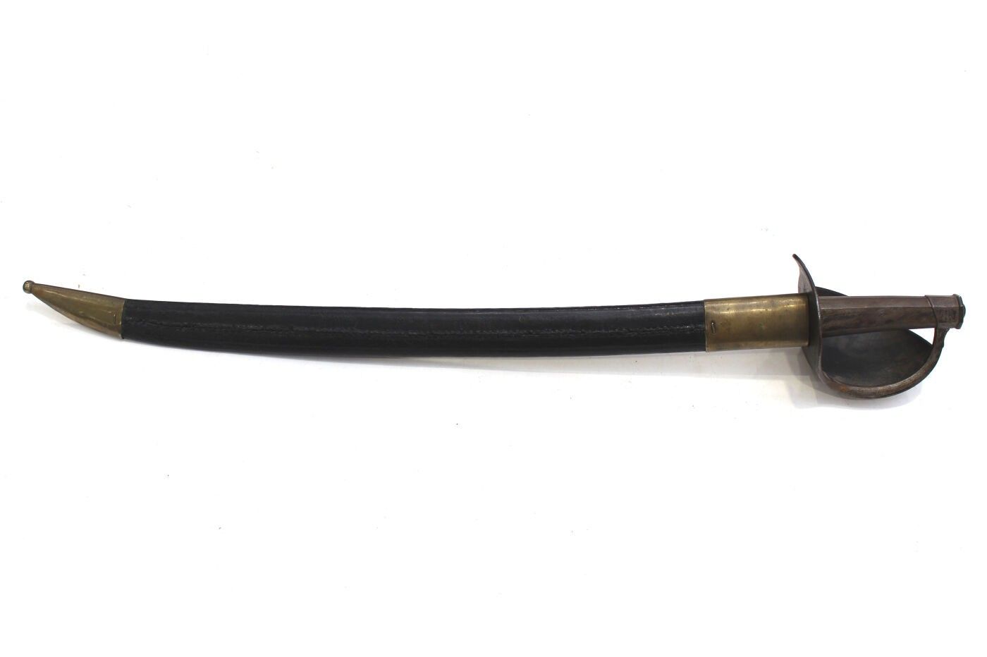 Model 1833 boarding sword, France, July Monarchy. Blade marked on the back Manufacture Rolale de Châtellerault October 1842, naval anchor engraved on each side, hallmarked on the fort. Black leather scabbard with two brass fittings, cap stamped with a naval anchor. Total length 84 cm, blade 68 cm. Good condition, slight oxidation from use.