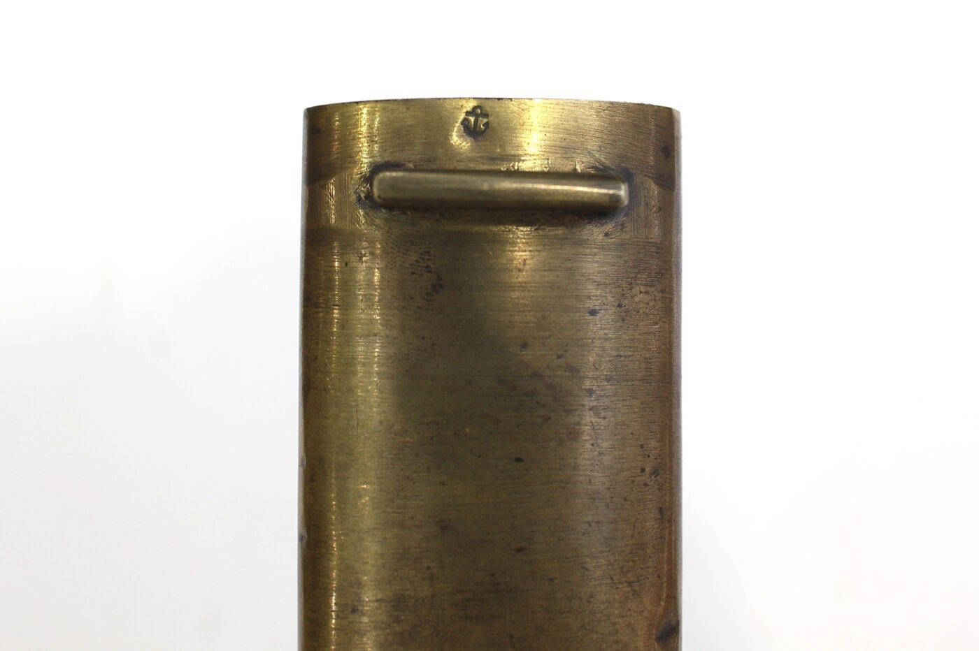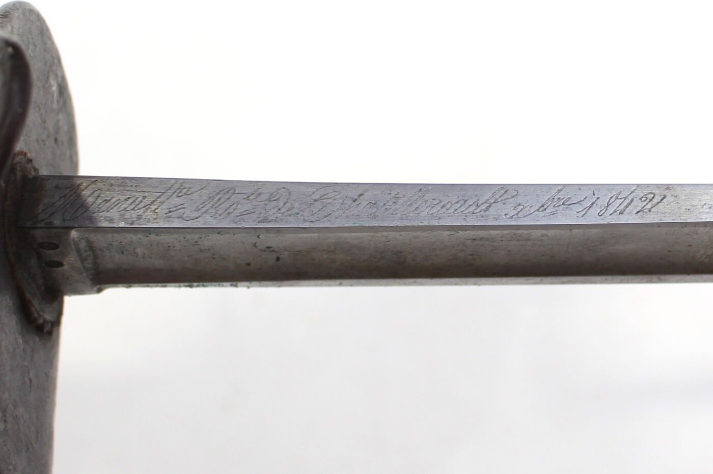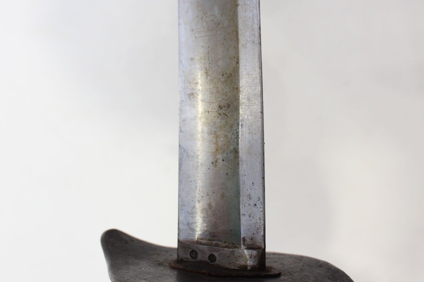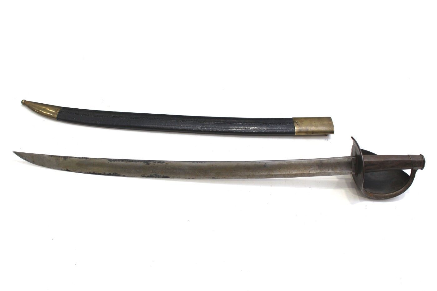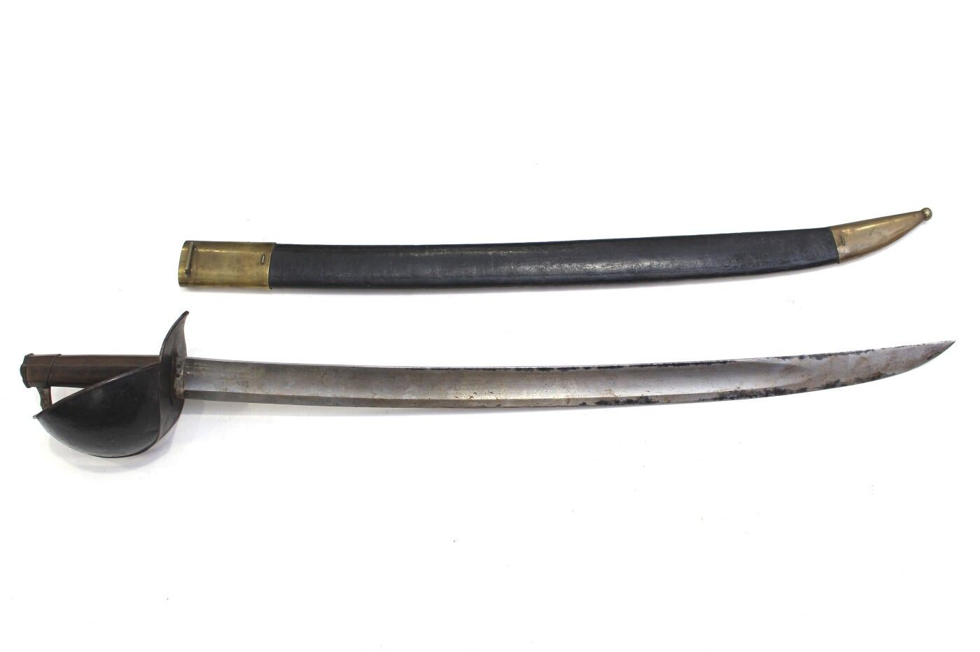 Model 1833 boarding sword, France, July Monarchy. Blade marked on the back Manufacture Rolale de Châtellerault October 1842, naval anchor engraved on each side, hallmarked on the fort. Black leather scabbard with two brass fittings, cap stamped with a naval anchor. Total length 84 cm, blade 68 cm. Good condition, slight oxidation from use.