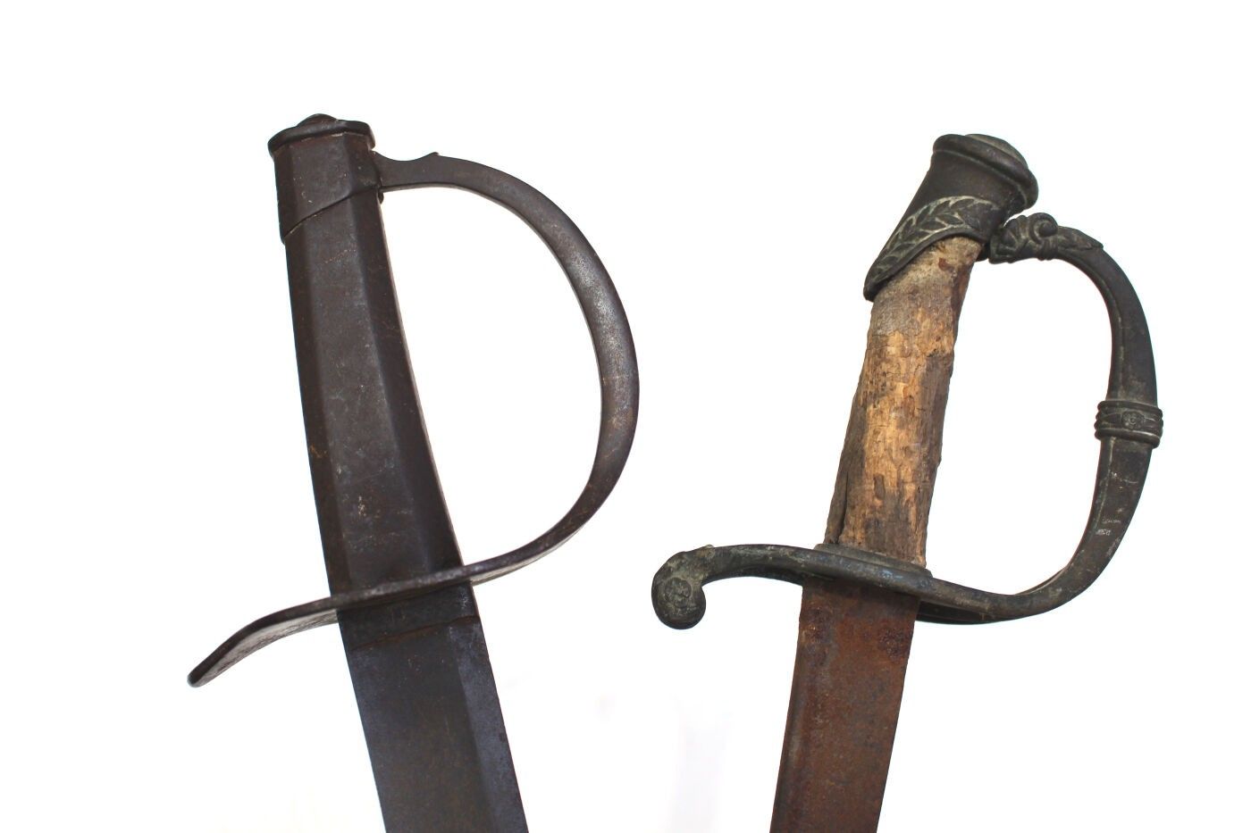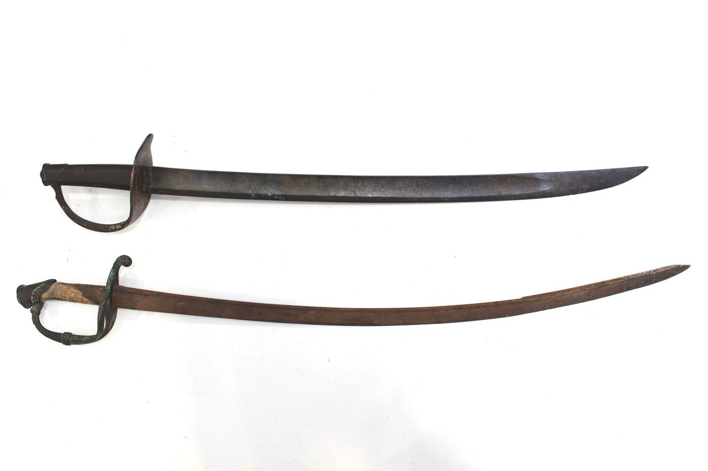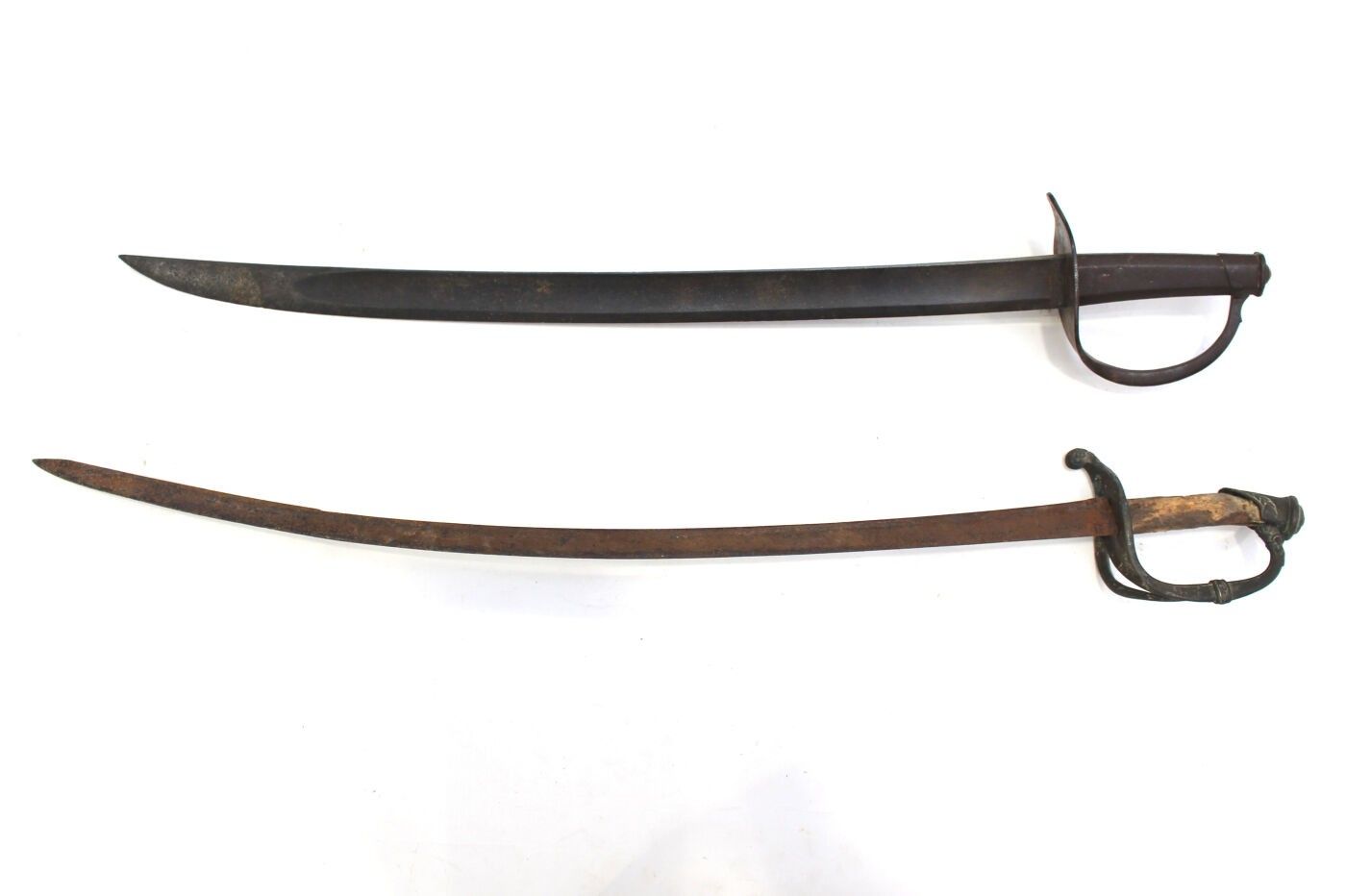 Set of 2 French sabres. A boarding sabre model 1833, France, Monarchie de Juillet, shell removed, oxidized, without scabbard, back marked Manufacture Royale de Châtellerault (...), total length 82 cm, blade 68 cm. An infantry officer's sabre model 1821, oxidised, damaged bare wood spindle, overall length 90 cm, blade 76 cm. Poor condition.