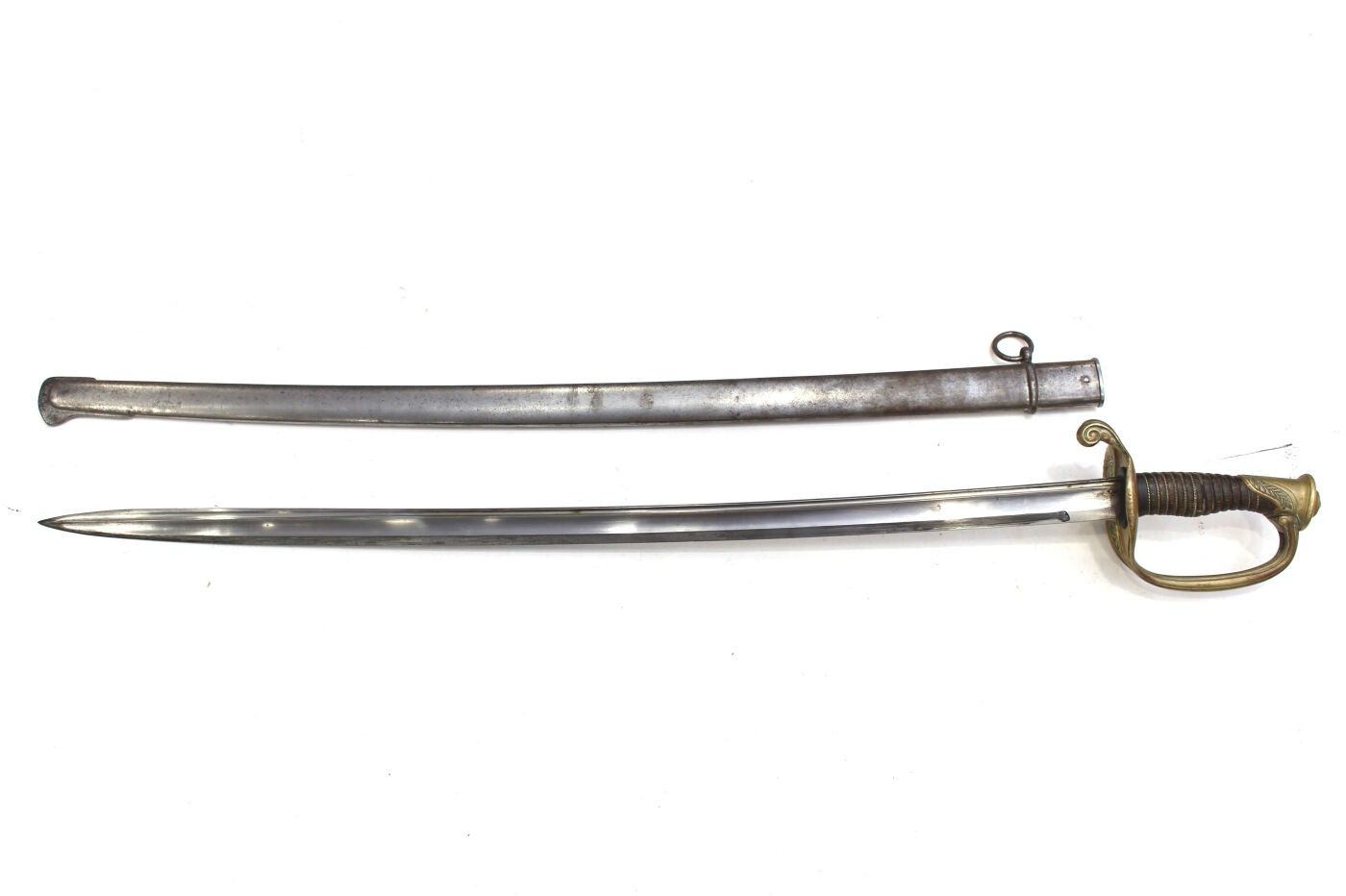 Model 1845 infantry warrant officer sabre, modified 1890, France, Third Republic. Blade marked on the back Manufacture d'armes de Châtellerault Août 1896 adjudant d'infanterie modèle 1845. Chased brass hilt, partly watermarked bovine horn fuse, sheet steel scabbard with one hoop ring, hilt and scabbard with the same number 26596. Total length 93 cm, blade 77 cm. Fair condition, oxidation from use, small watermark missing.