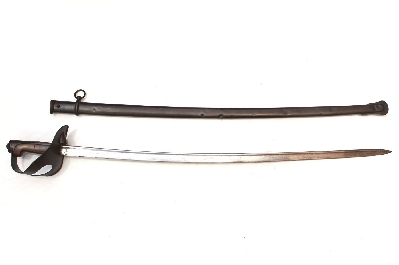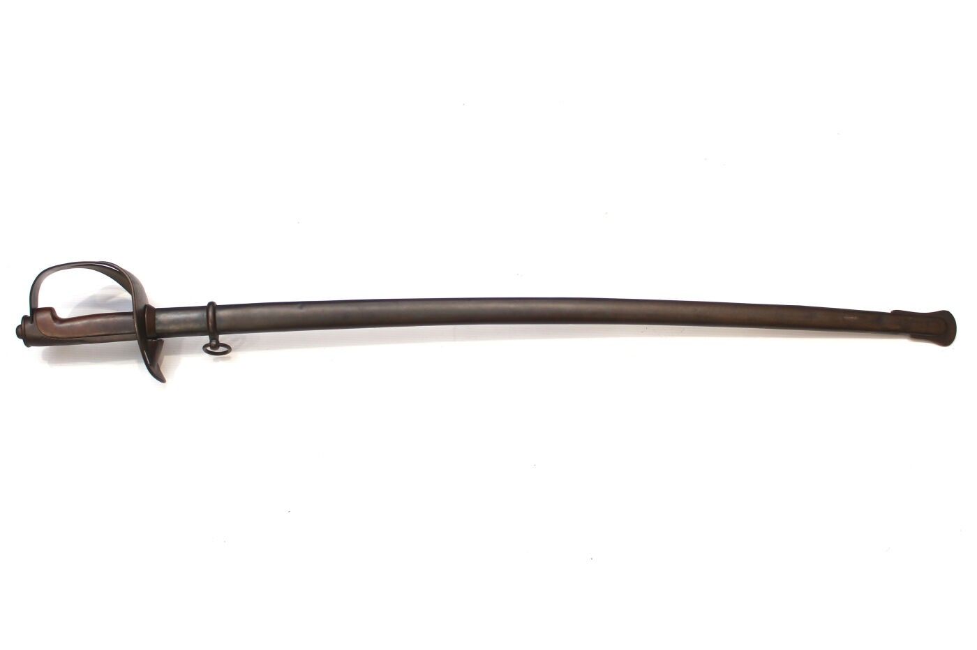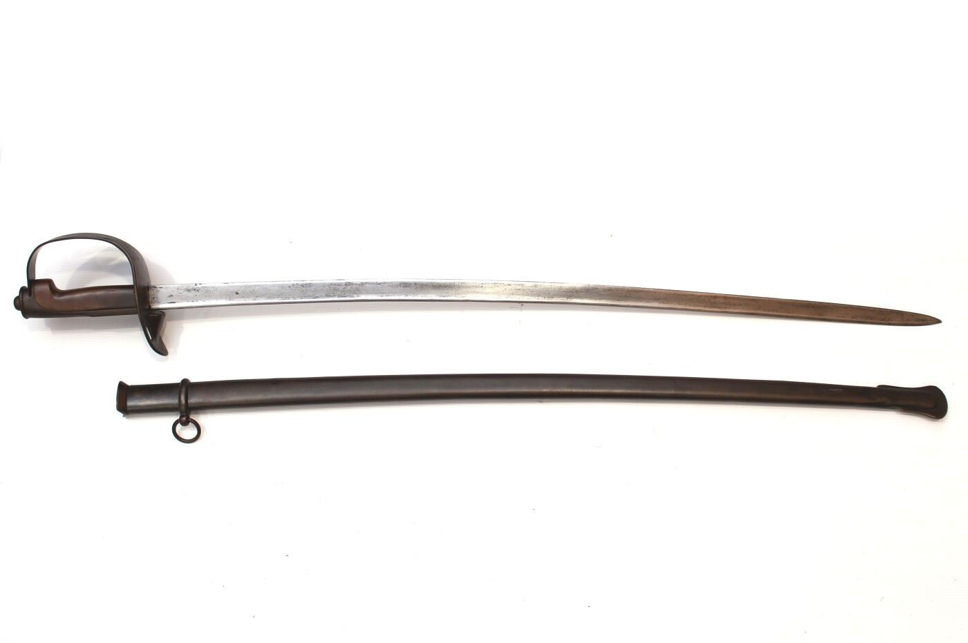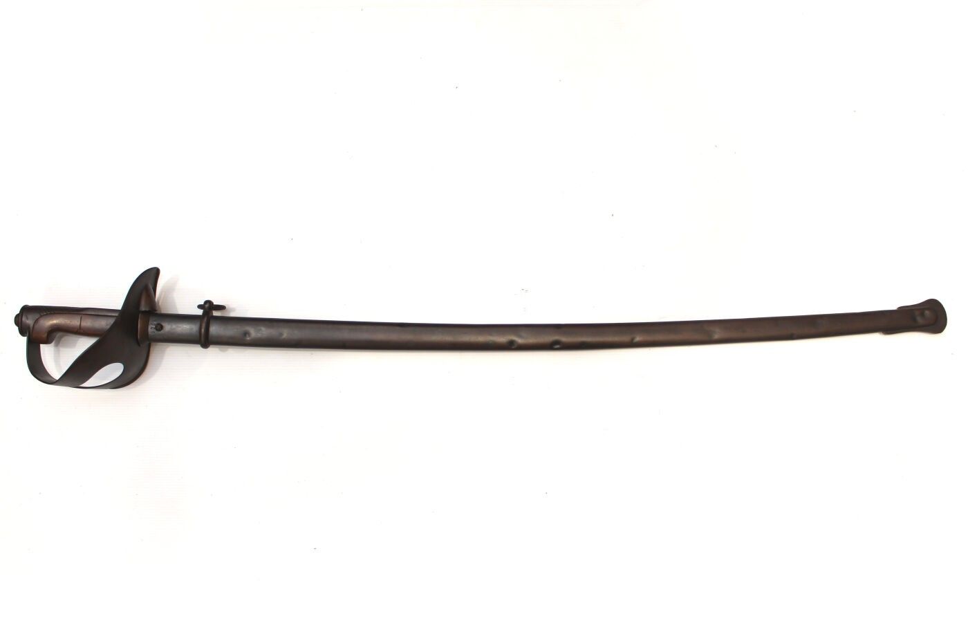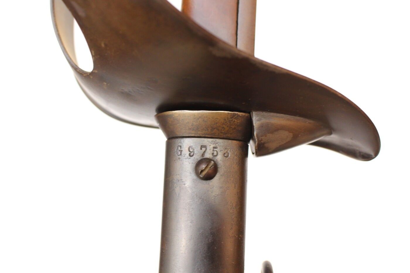 Cavalry sabre model 1873, Italy, late 19th or early 20th century. Blade stamped on the forte, burnished iron mounting, scabbard marked G 9753, cap tail marked G 5237, wooden spindle. Total length 109 cm, blade 91 cm. Fair condition.