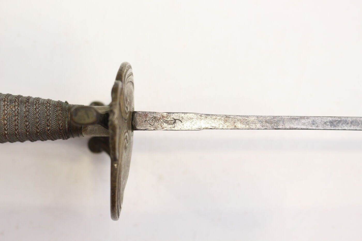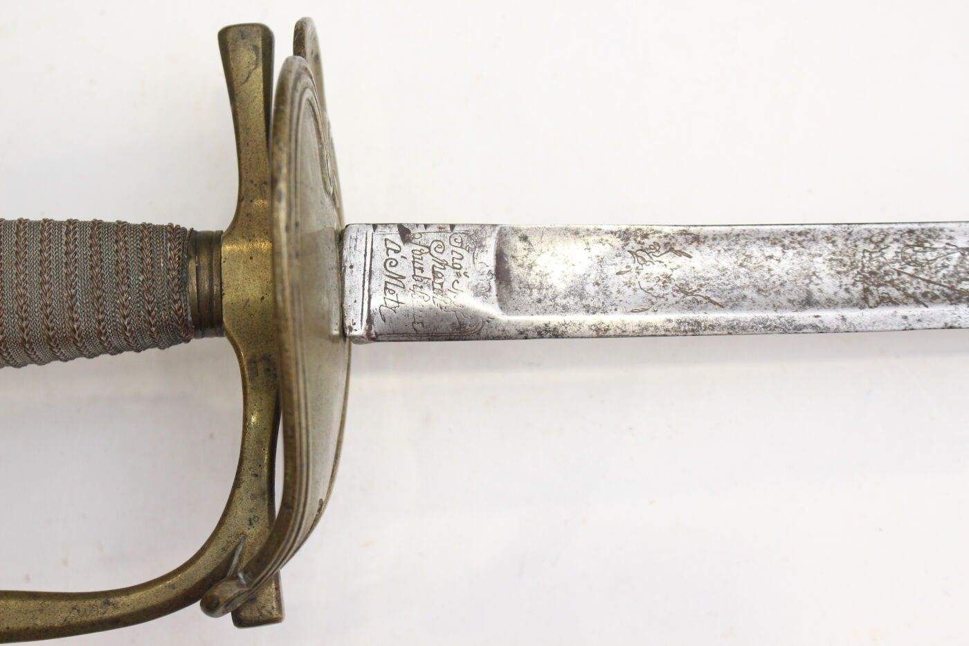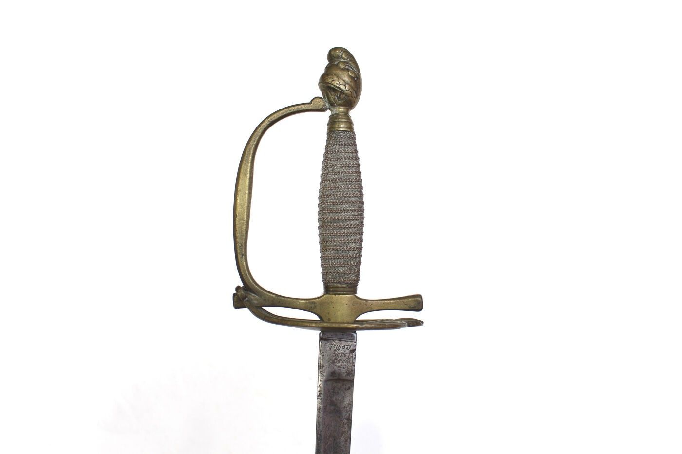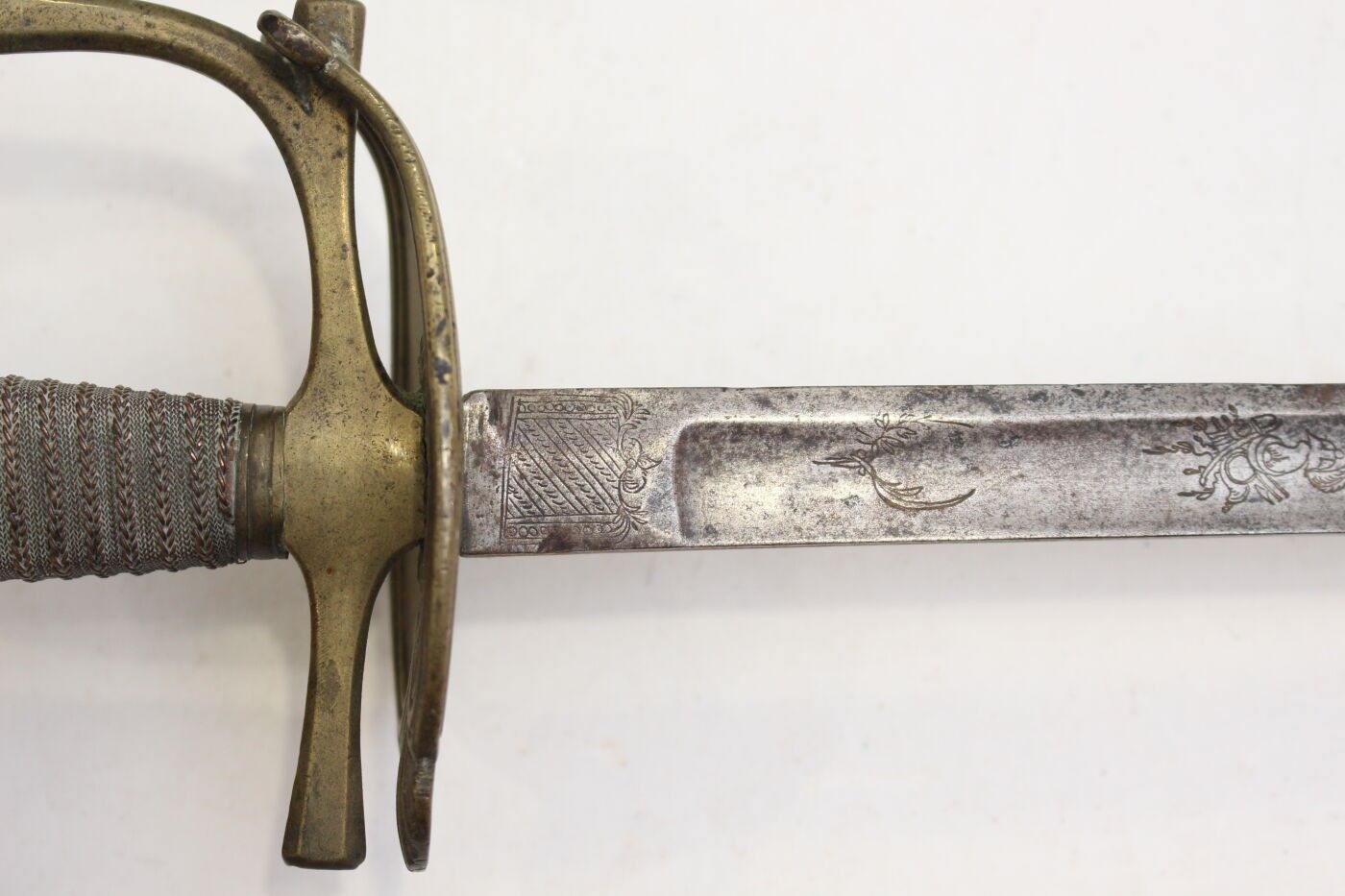 Unifome sword model 1788, France, late 18th or early 19th century. Strongly marked Ing. Spol, Marchand et Fourbisseur à Metz, back of the blade engraved with a scroll in the Solingen style. Brass hilt, pommel in empanached helmet, complete copper filigree well tightened. Total length 97 cm, blade 80 cm. Fair condition, without scabbard, slight oxidation.