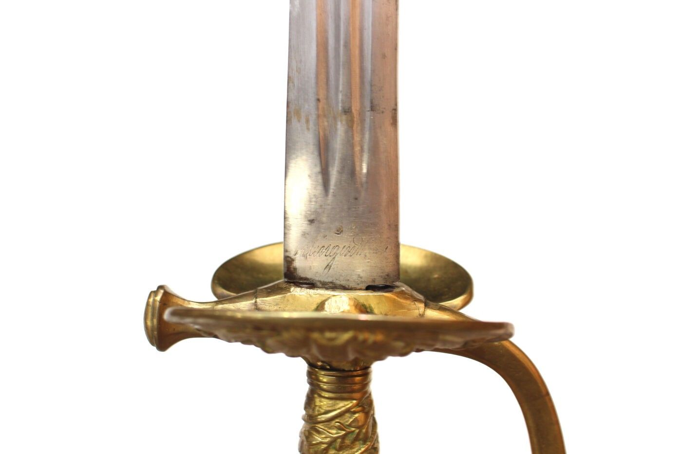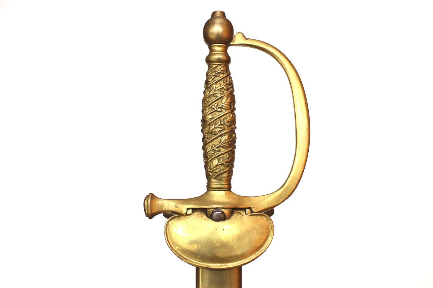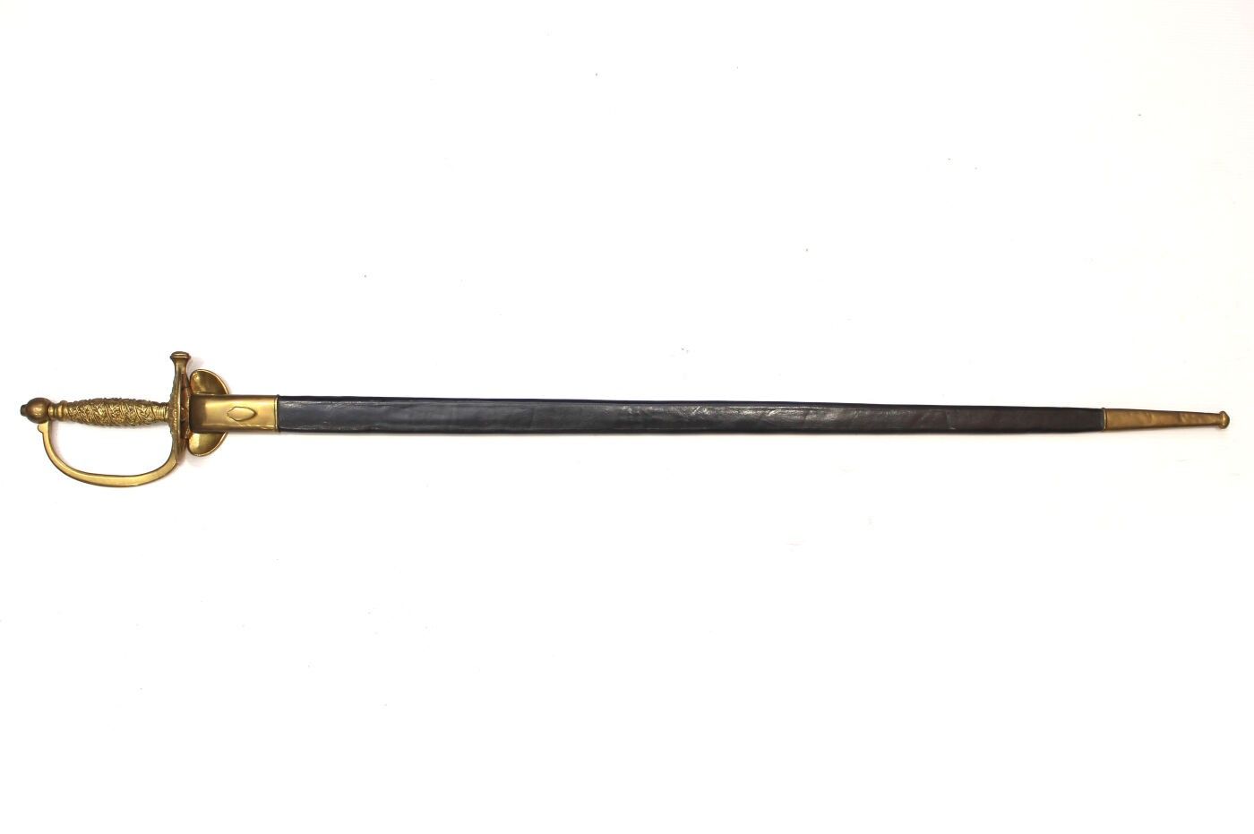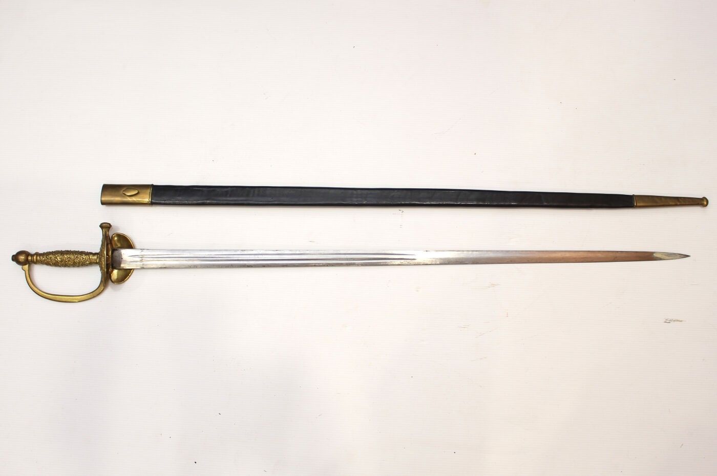 Gendarmerie or military justice officer's sword model 1853, France, Second Empire. Large Coulaux & Cie Klingenthal blade hallmarked G spangled and C, brass mounting, lictor-beam keypad on 8 flags, fuse decorated with oak and olive branches, pump counter-keypad, later leather scabbard with two brass fittings. Total length 102.5 cm, blade 83 cm.