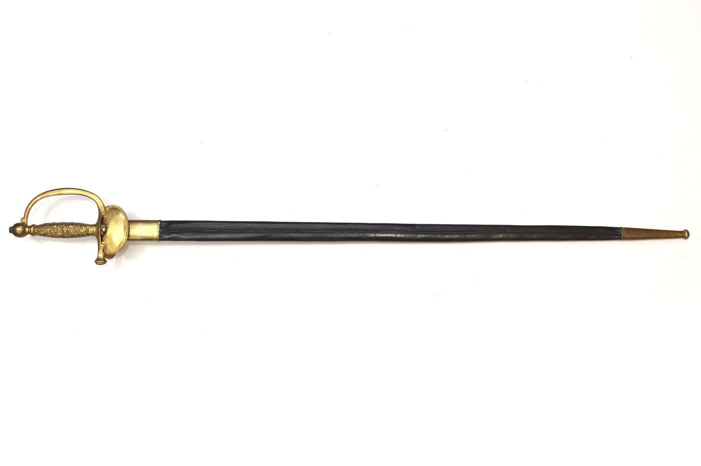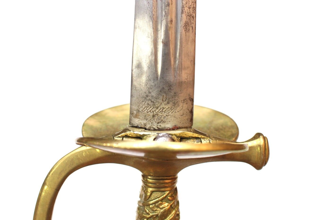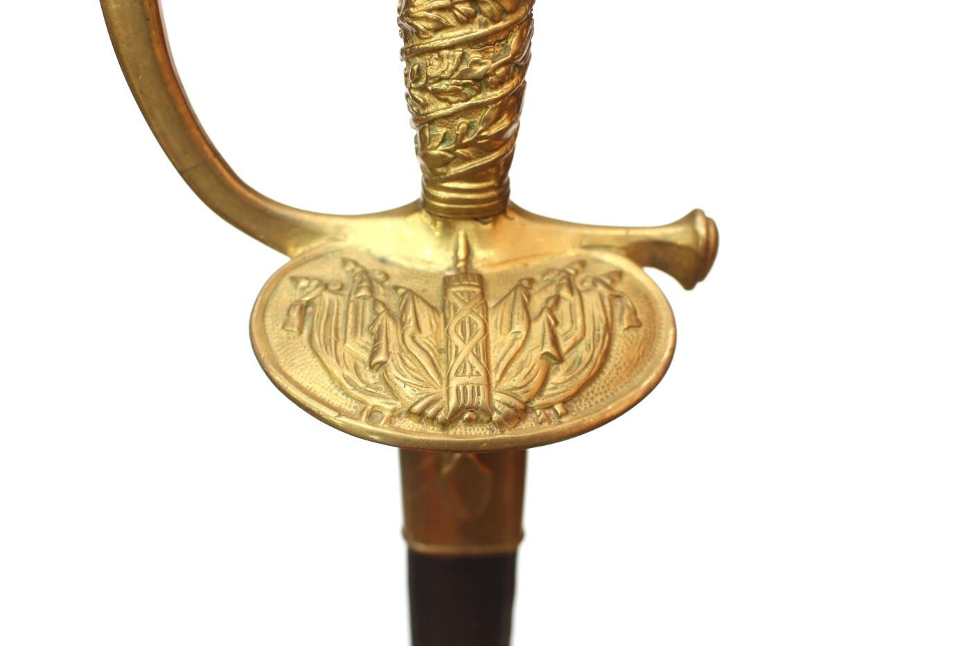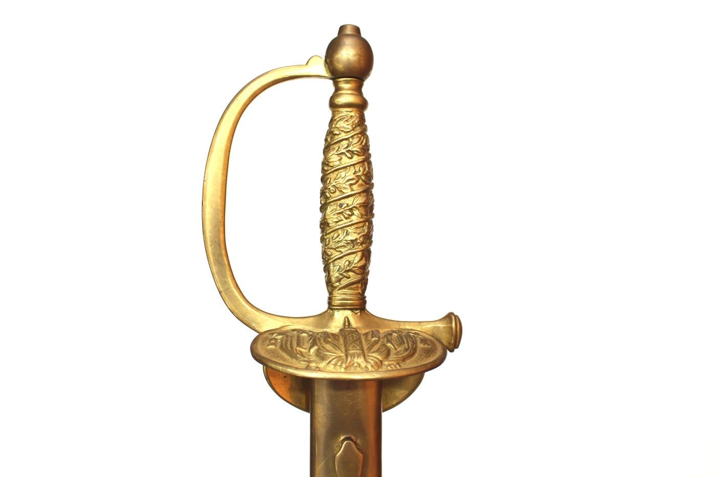 Gendarmerie or military justice officer's sword model 1853, France, Second Empire. Large Coulaux & Cie Klingenthal blade hallmarked G spangled and C, brass mounting, lictor-beam keypad on 8 flags, fuse decorated with oak and olive branches, pump counter-keypad, later leather scabbard with two brass fittings. Total length 102.5 cm, blade 83 cm.